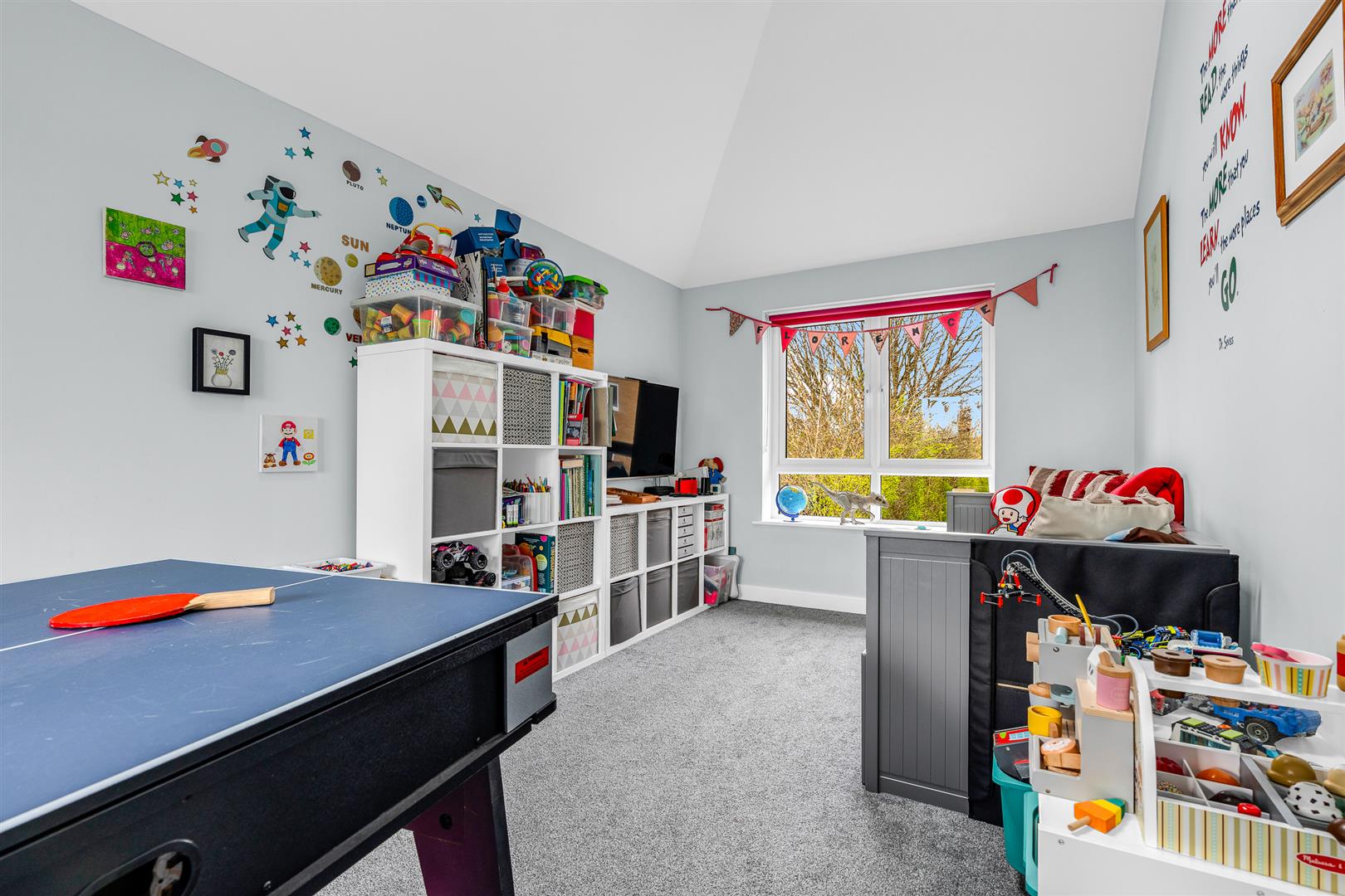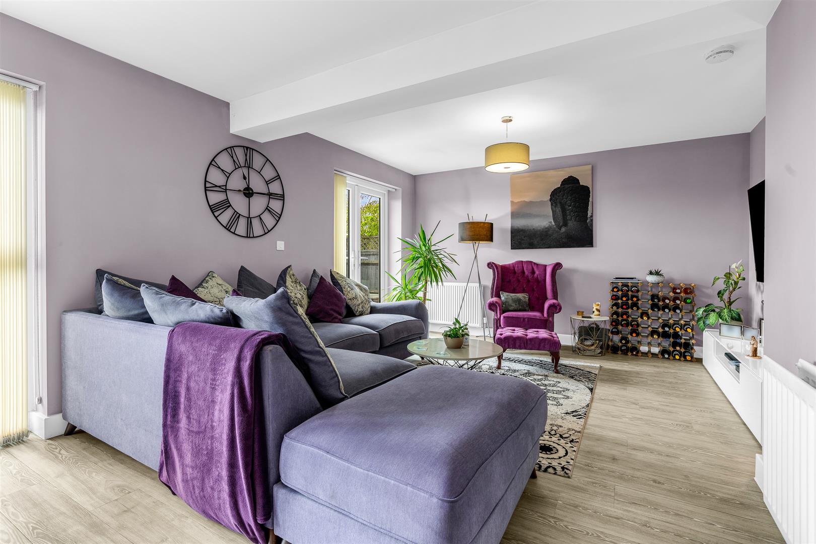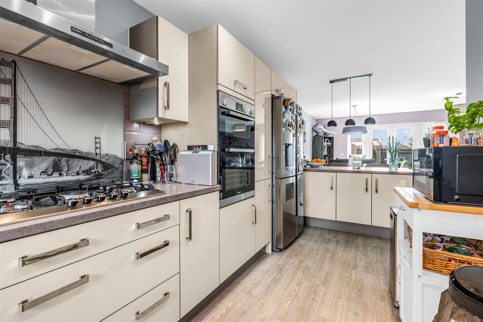 The kitchen/dining/living room is a substantial room by any measure stretching to some twenty five feet by nearly twenty nine feet, yet is still abundantly lit by the generous window to the front and the two sets of glazed double doors positioned along the rear wall, one of which is supplemented by additional full-height windows on either side. The front part is in natural recess and has been intelligently designed to be the working kitchen, enjoying a neat ergonomic layout with a comprehensive array of wall and floor mounted fitted cupboards lining the perimeter, providing more than ample storage as well as abundant food preparation worktop area. A full complement of the usual kitchen appliances are integrated into the cabinets, with the necessary space pre-allocated to incorporate a double width, full-height fridge/freezer plumbed for an ice maker/water cooler. The remainder of the room is neatly delineated from the kitchen by a smart island complete with breakfast bar and is left as open floor space to furnish as you see fit. It stretches the full width of the house and is a spacious room in its own right, comfortably accepting a large dining suite as well as multiple sofas and chairs, along with other pieces of occasional furniture, all enjoying a wonderful situation alongside the multiple glass doors that line the back wall. It is a fabulous room, easily able to cope with a large family, and is sure to quickly become the social hub and beating heart of this superb home. The patio doors enable a great connectivity out into the garden, making a really nice easy flow between the inside and outside, ensuring both spaces are really usable for time together as a family or when entertaining guests.