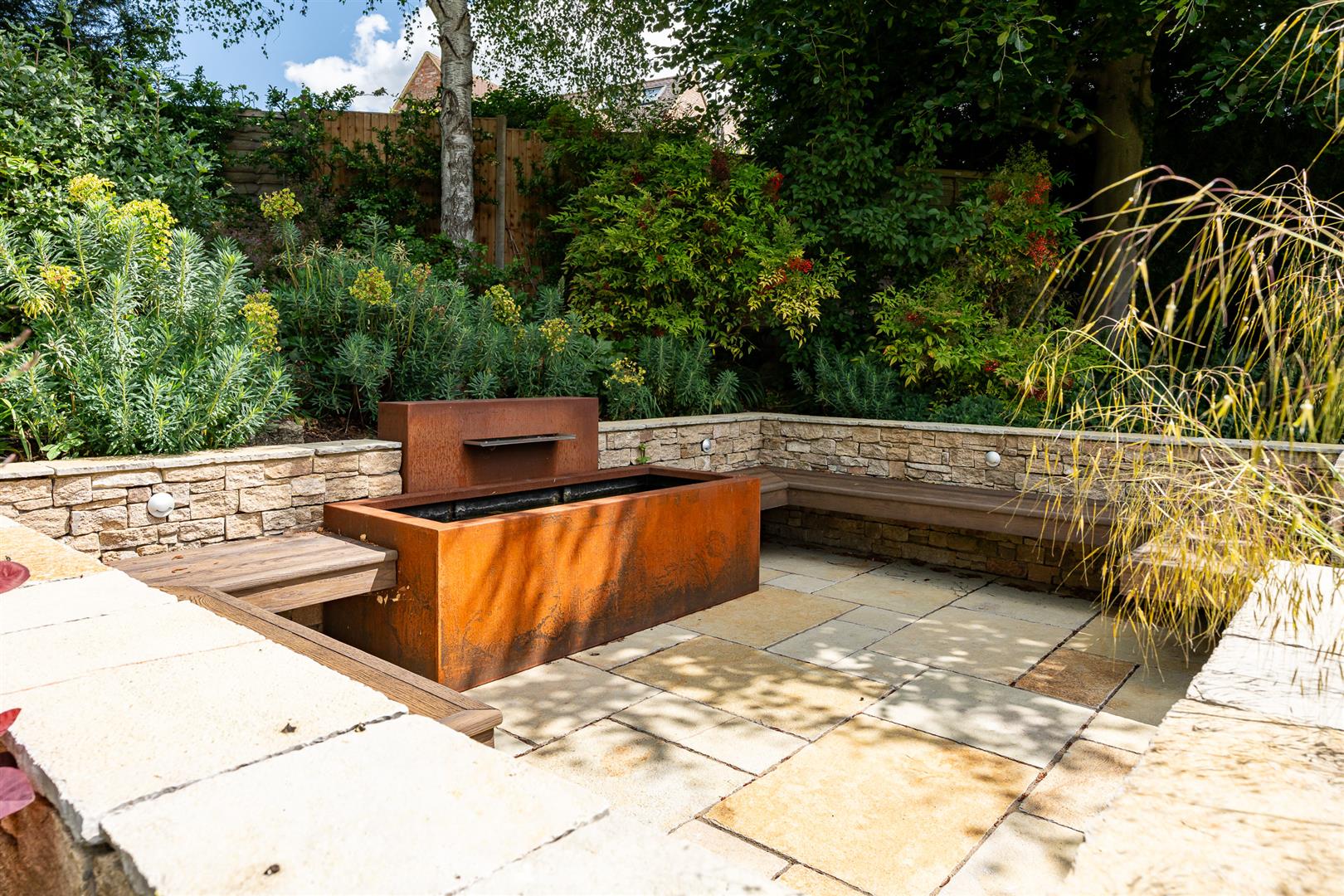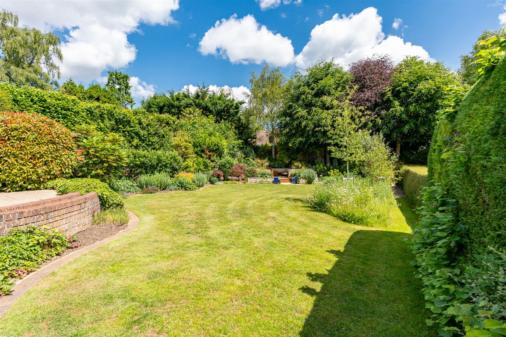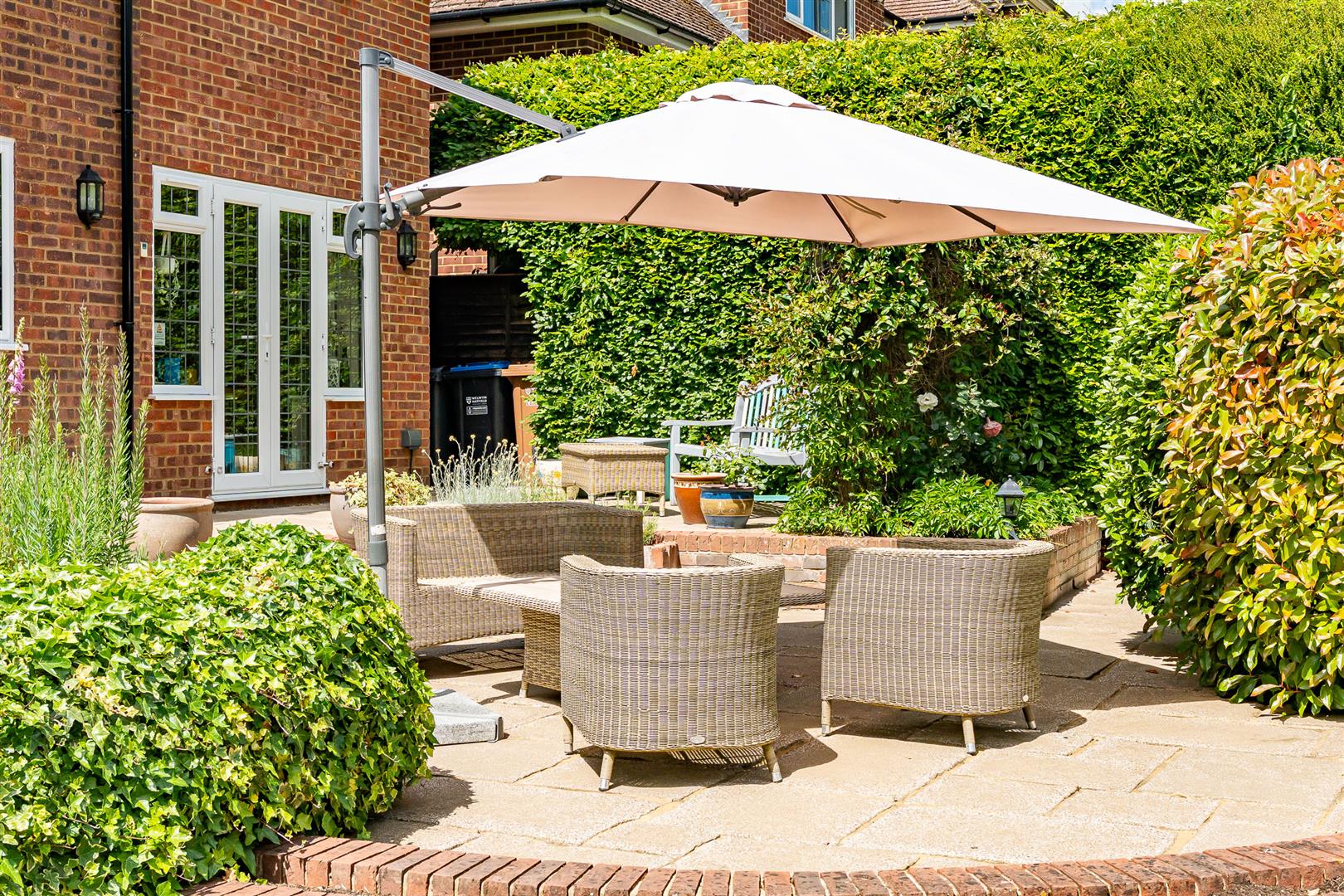 The frontage is both deep and wide, with a secure gated entrance opening into a substantial area running across the front of the house and the tandem double garage which is suitable for many cars. The well maintained boundaries of hedging on either side are nicely balanced by flower borders across the front of the house and along the front boundary, which are planted with myriad bushes and shrubs showing a great variety of colour and form. There is convenient separate access through to the rear garden, which is secure and fully enclosed and so eminently suitable for pets and children. The rear garden is an absolute triumph, with a paved patio running the full width of the house and garage that has been skilfully landscaped into multiple different levels offering a variety of areas that are all just perfect for relaxing, dining and socialising with friends and family. Beautifully curated borders surround the various patios, creating a wonderful combination of light, space and nature, which is echoed and elevated even further at the far end of the copious lawn, beyond the large potting shed and kitchen garden area, which presents an idyllic oasis of calm with hand crafted banquette seating lining a stone wall surrounded paved area with a stylish water feature taking centre stage. The whole garden is absolutely stunning, a wonderful place to relax, unwind and reset, and ideally designed to host any number of lucky guests.