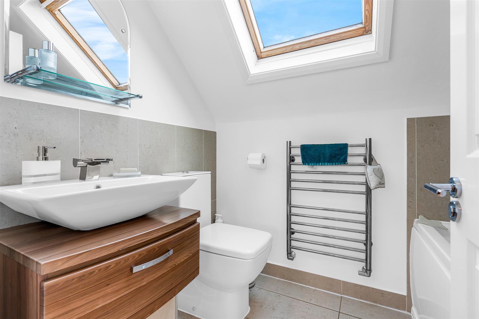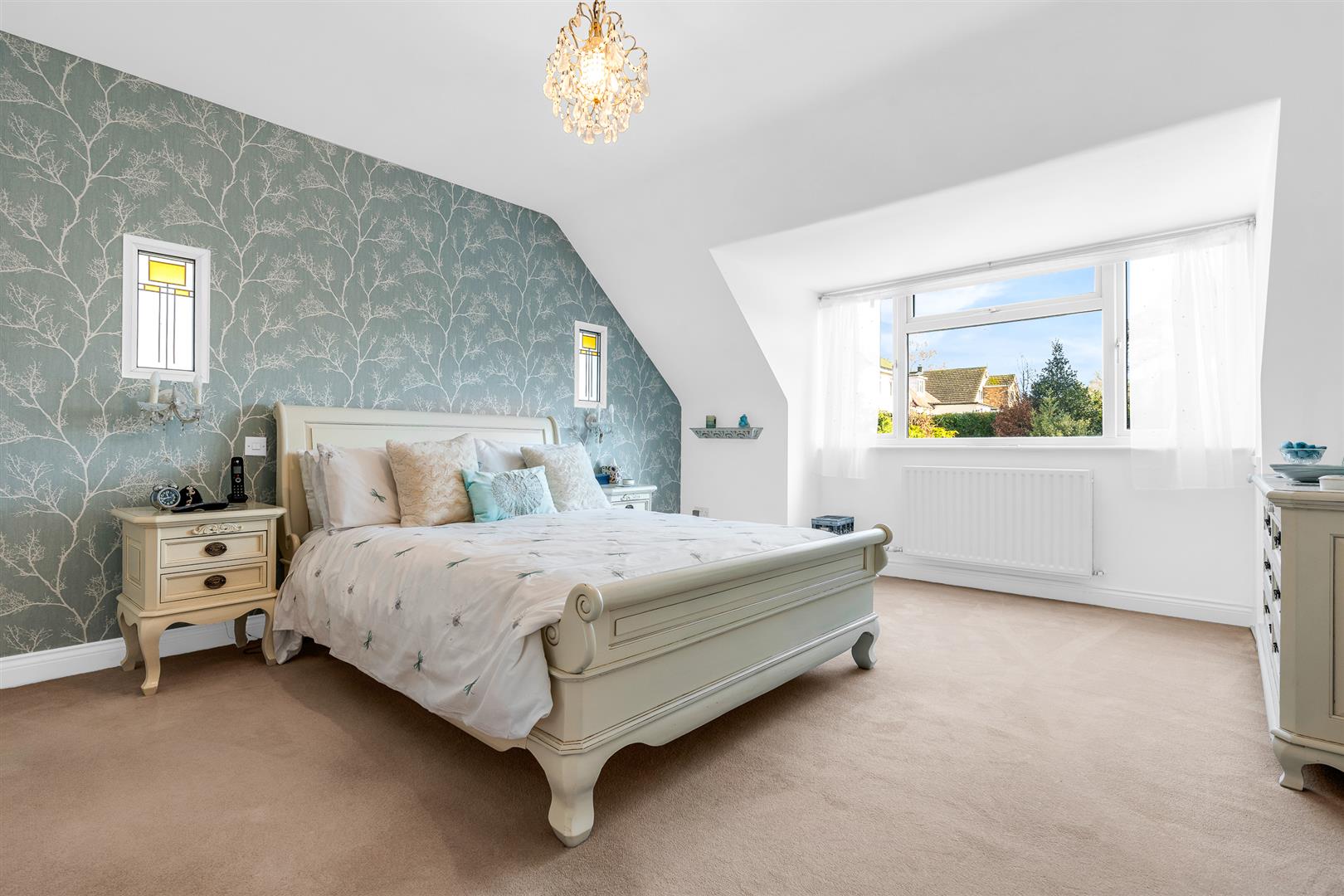Upstairs the generous hallway is a light and airy space thanks to the front facing window, and opens into the two bedrooms and the family bathroom. Both bedrooms should be considered as bedroom suites, with ample space for casual seating and other furniture as well as king size beds. Both have built-in wardrobes/cupboards with one of them boasting delightful banquette seating running along below the dormer window. It would be incorrect to describe either of them as the principal bedroom, they are both completely fabulous.