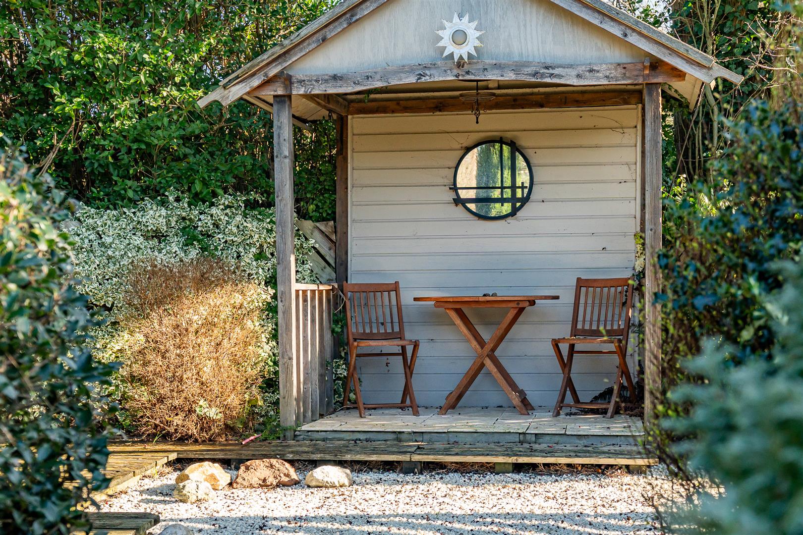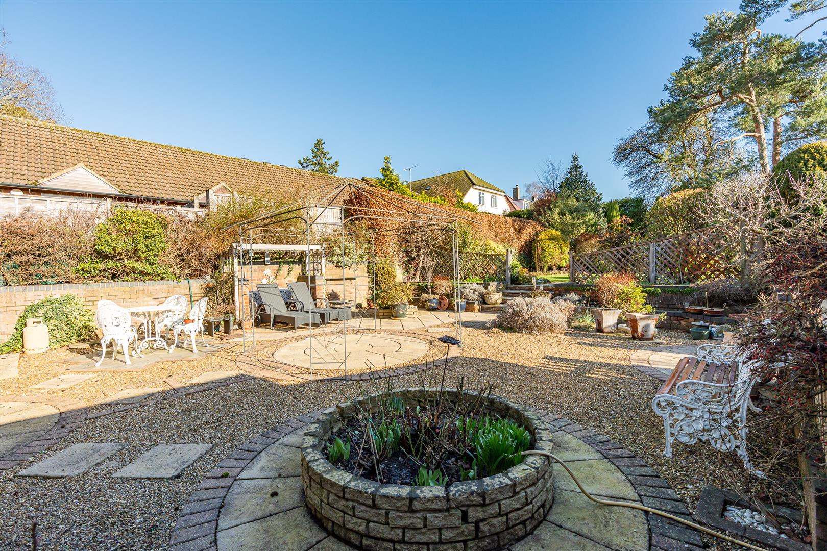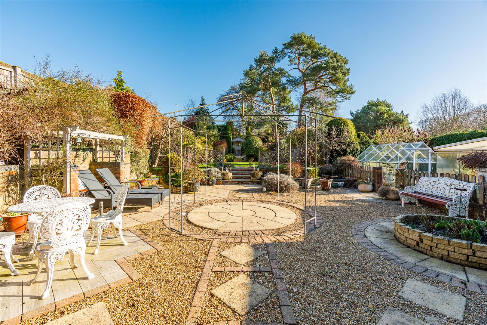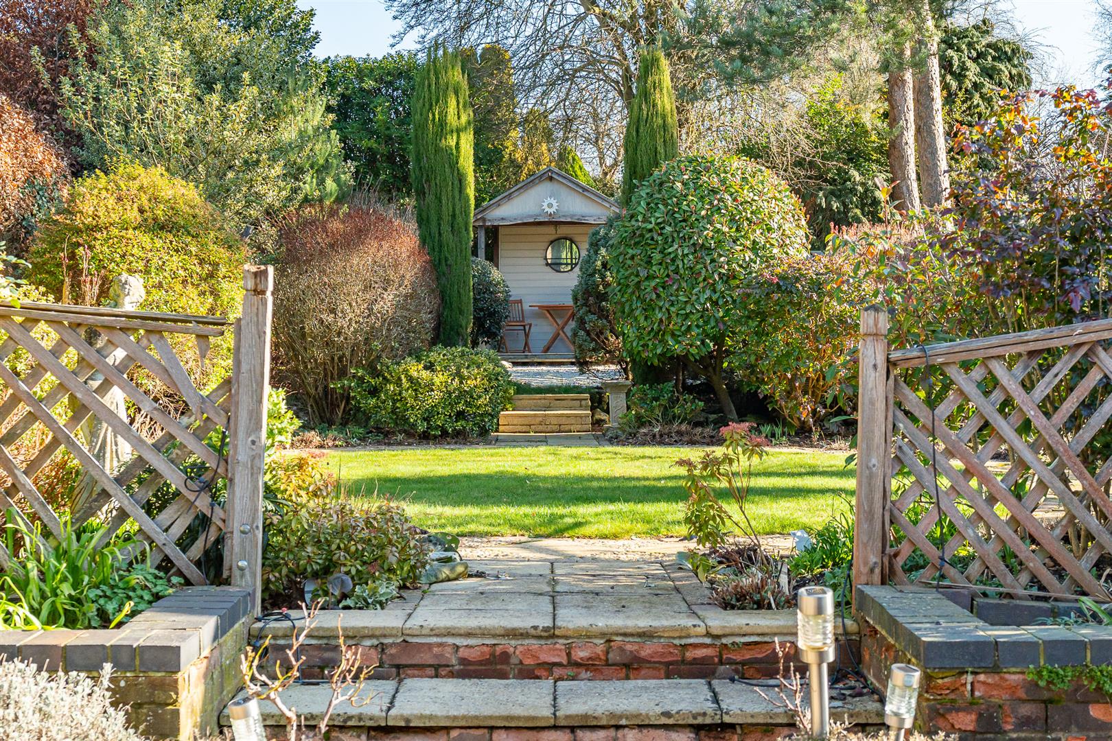 The house is set well back from the road with a large gravel driveway that leads up to the integral garage before sweeping past the front of the house and back out to the roadway through a second entrance. Large mature hedges line both side boundaries, with a pretty lawn in the centre set behind further mature hedging that offers a nice visual screen from the roadway beyond. The garage opens through a rear pedestrian door into a generous workshop some thirteen feet long that also has a separate access directly from the rear garden. It would be relatively simple to incorporate the garage and/or workshop into the main living space if required, subject to the necessary consents. There is a useful side gated access from the front into the rear garden, which is secure and enclosed and so is eminently suitable for children and pets. The rear garden is an absolute delight, covering a substantial area and absolutely full of wonderful architectural and landscaped features that present a real visual feast wherever you look. Multiple patios and seating areas are dotted throughout the grounds, with designated areas for greenhouses and sheds along with ornate shaped flower beds, pergolas and archways linked together by a huge variety of stone and block paved pathways, transitioning into an area displaying a circular lawn at its centre that opens on into a “secret” garden at the far boundary with a pond and an area of decking before a charming verandah. The gardens are just exceptional, carefully landscaped and delicately planted with a carefully curated variety of plants, shrubs, bushes and specimen trees to create an hour oasis of delight and wonder. A perfect place to relax, unwind and enjoy the company of friends and family.