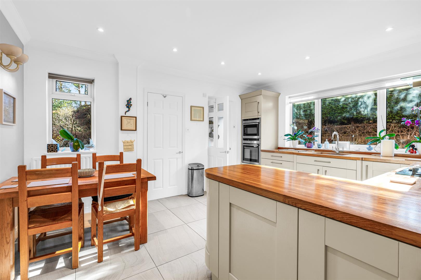 To the rear of the family room, with direct access from it and from the entrance hall, is the superb kitchen/breakfast room. This is another room that enjoys a nice square shape, giving ample space for extensive wall and floor mounted fitted cupboards to line the perimeter whilst still leaving plenty of free space for a dining table and chairs. Again windows to two aspects present lovely views out into the garden whilst allowing the light to flow in, which permeates throughout the room thanks to the light coloured floor tiles and the almond white cabinets. There is more storage than you are ever likely to need, boosted further by a terrific walk-in pantry, with gorgeous solid wood worktops stretching out onto a useful island offering a lovely warm colour highlight that contrasts perfectly with the colour of the curved front cupboards beneath. Integrated within the cabinets is a comprehensive collection of premium branded appliances. From the corner of the kitchen/breakfast room a door leads into an inner lobby area that opens out through an external door into the rear garden, and also opens directly into a fantastic utility/laundry room at the rear, fully specified for a washing machine and dryer, and boasting fitted cupboards and worktop matching those of the main kitchen.