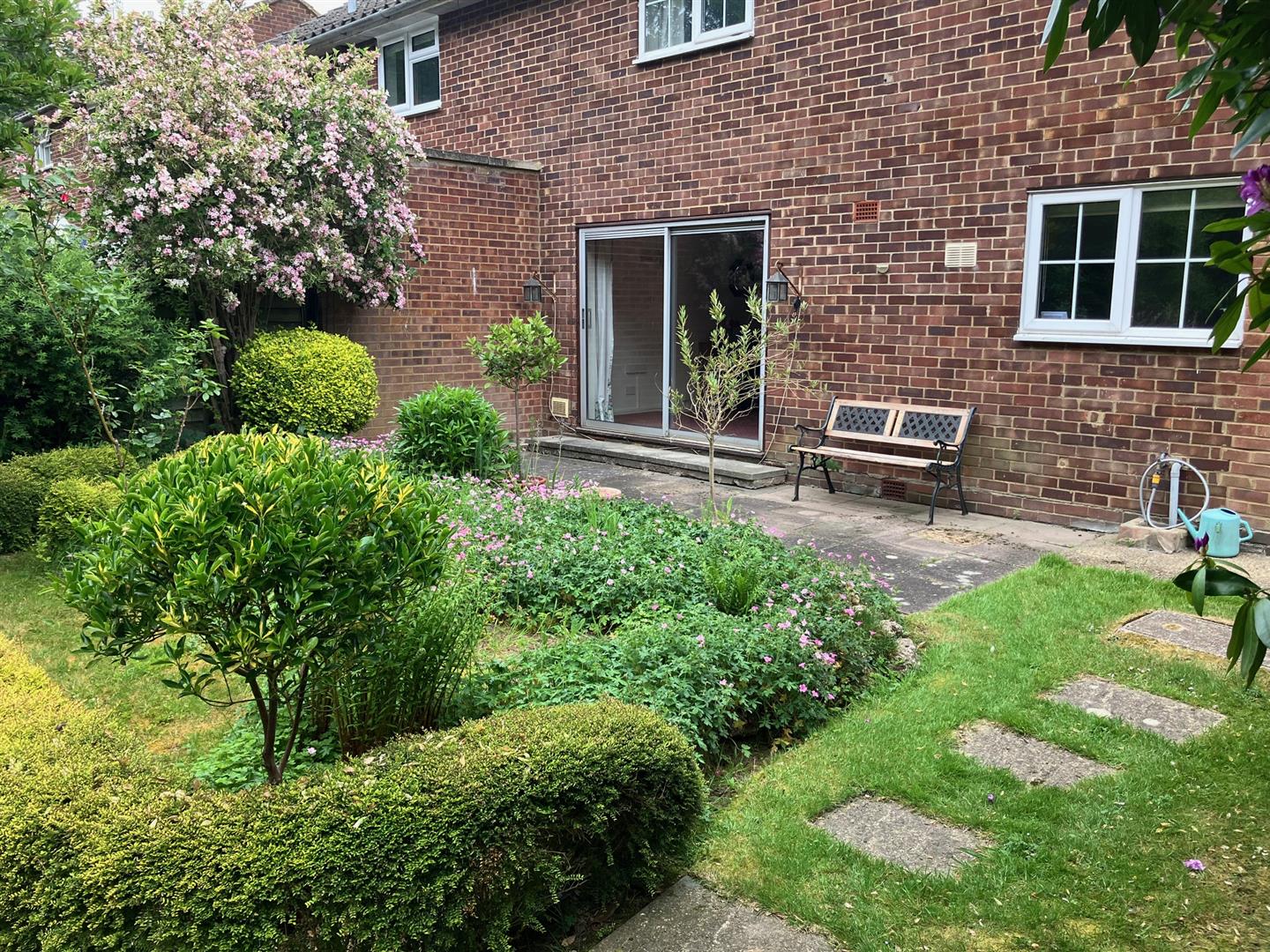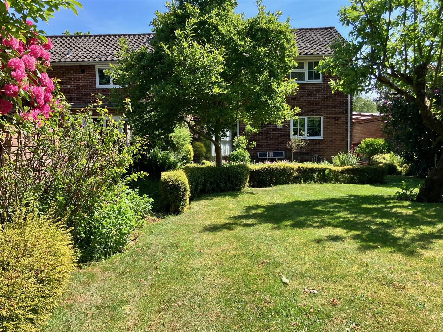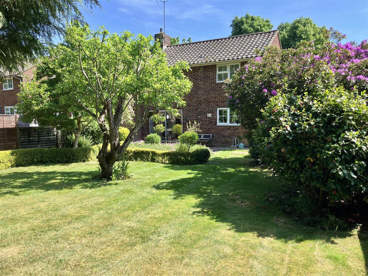 To the front a pretty garden is surrounded by a neat hedge, alongside which a private driveway runs up to the detached garage. The house is set on a small road set back behind a large grassed open space so has a lovely open aspect to the front. Separate access to the large rear garden is provided by a secure side gate. At the rear the garden opens out across the back of the garage and so is much wider than the house. It has a nice patio running across the back of the house and is creatively and attractively landscaped, showing different pathways, borders, low hedging and shaped flower beds throughout, interspersed with large areas of lawn and selected trees.This is a lovely place with a great natural feel to it and a super open aspect. It is fully enclosed and secure so ideal for pets and children. A large and wonderful space to spend time as a family.