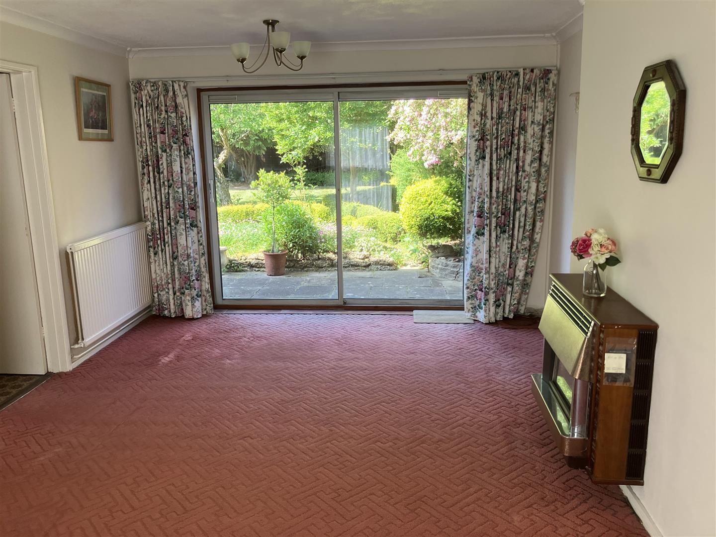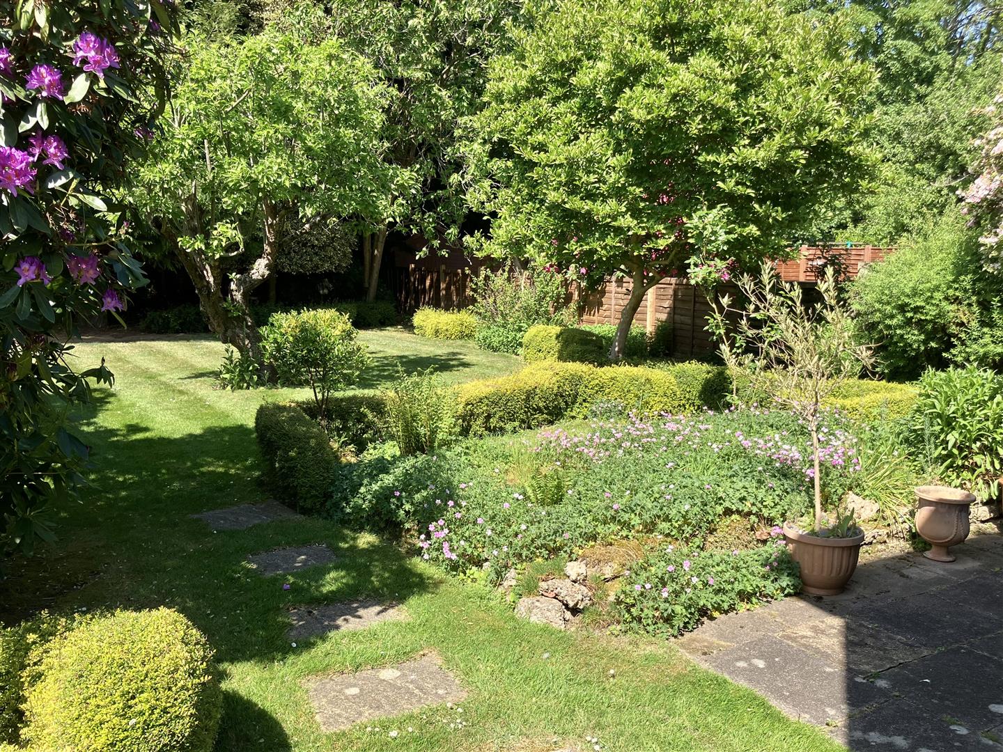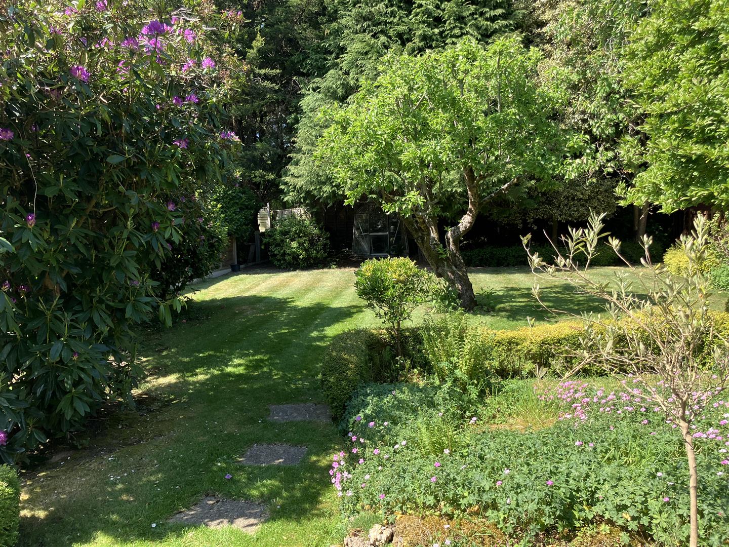 To the front a pretty garden is surrounded by a neat hedge, alongside which a private driveway runs up to the detached garage. The house is set on a small road set back behind a large grassed open space so has a lovely open aspect to the front. Separate access to the large rear garden is provided by a secure side gate. At the rear the garden opens out across the back of the garage and so is much wider than the house. It has a nice patio running across the back of the house and is creatively and attractively landscaped, showing different pathways, borders, low hedging and shaped flower beds throughout, interspersed with large areas of lawn and selected trees.This is a lovely place with a great natural feel to it and a super open aspect. It is fully enclosed and secure so ideal for pets and children. A large and wonderful space to spend time as a family.
