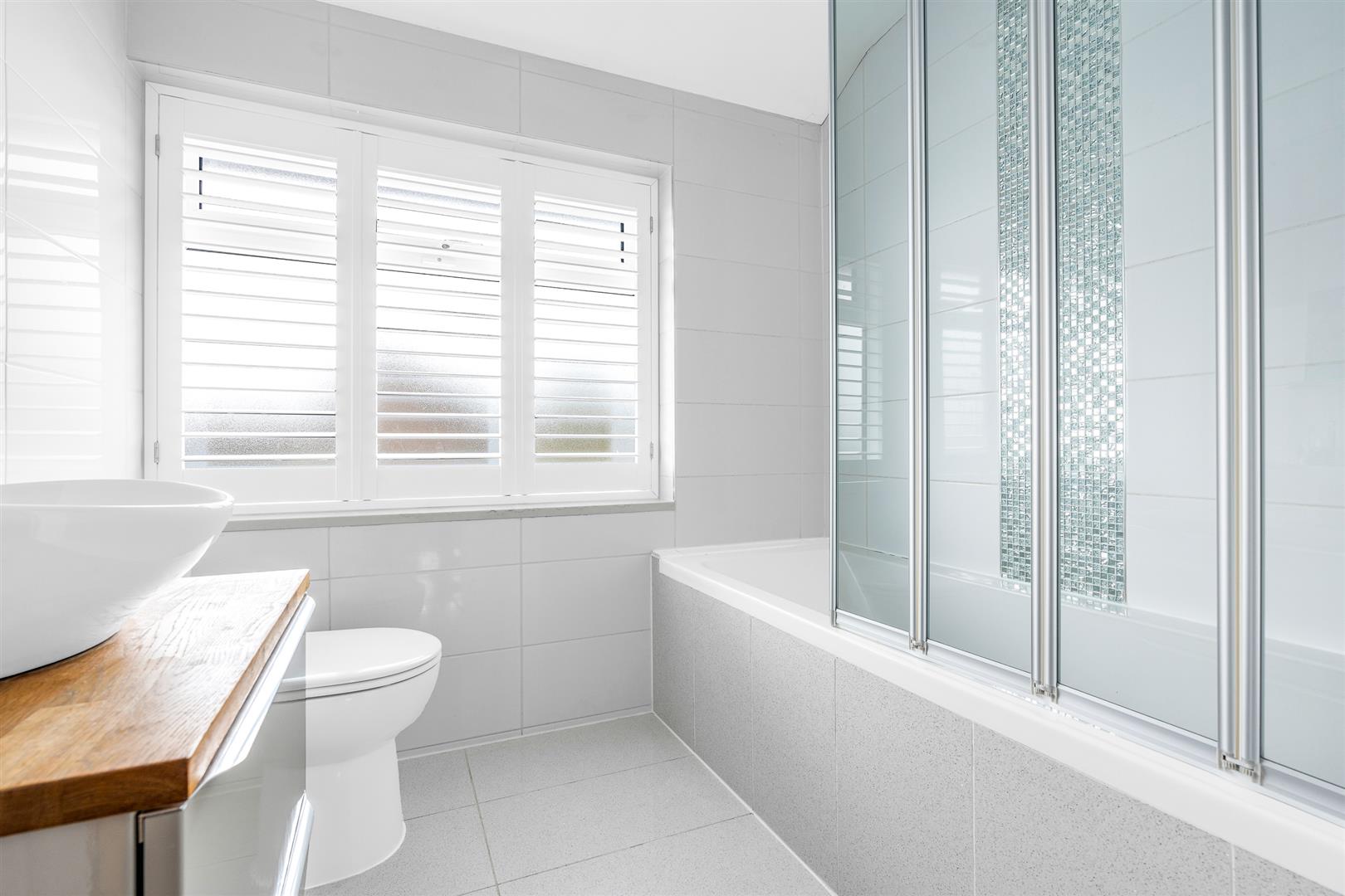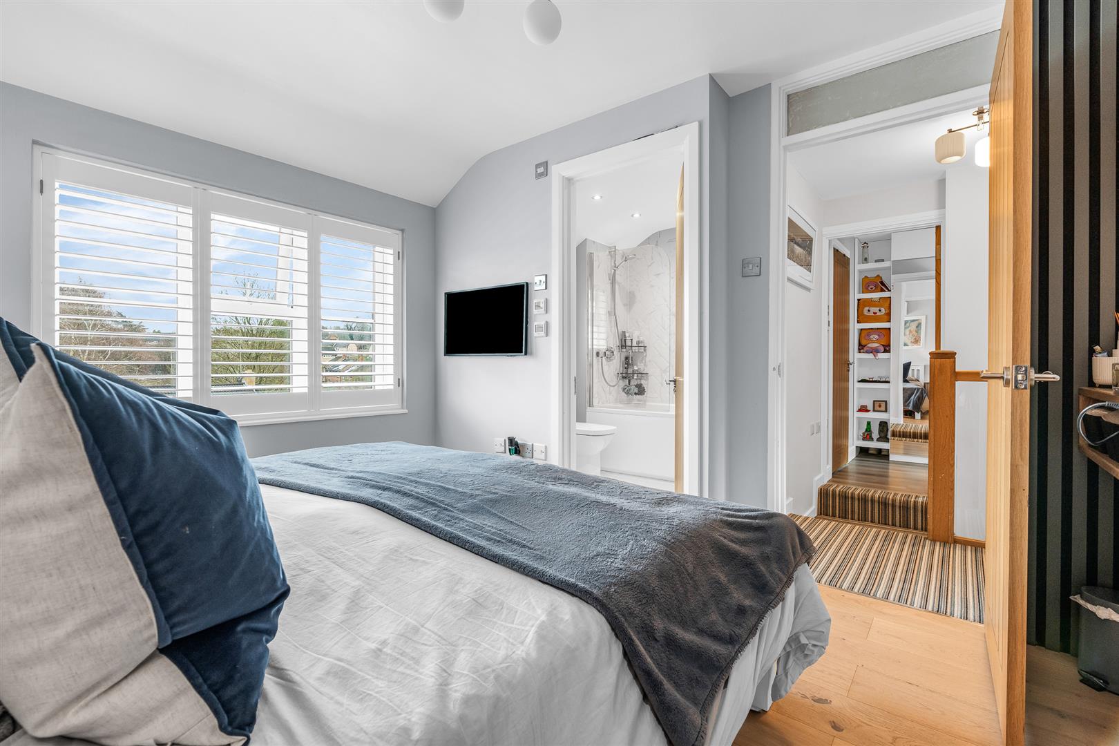 Extending across the back of the house, accessed down a few steps from the dining room, is a superb family room that is absolutely flooded with natural light thanks to the full width folding glass doors that occupy the whole of the rear wall and the large rectangular roof light in the centre of the ceiling. Fitted with an attractive slatted feature wall that co-ordinates with the living room, as well as the stylish bespoke window shutters, this is another room of well balanced proportions that joins with the other living rooms in making this house so flexible and adaptable.