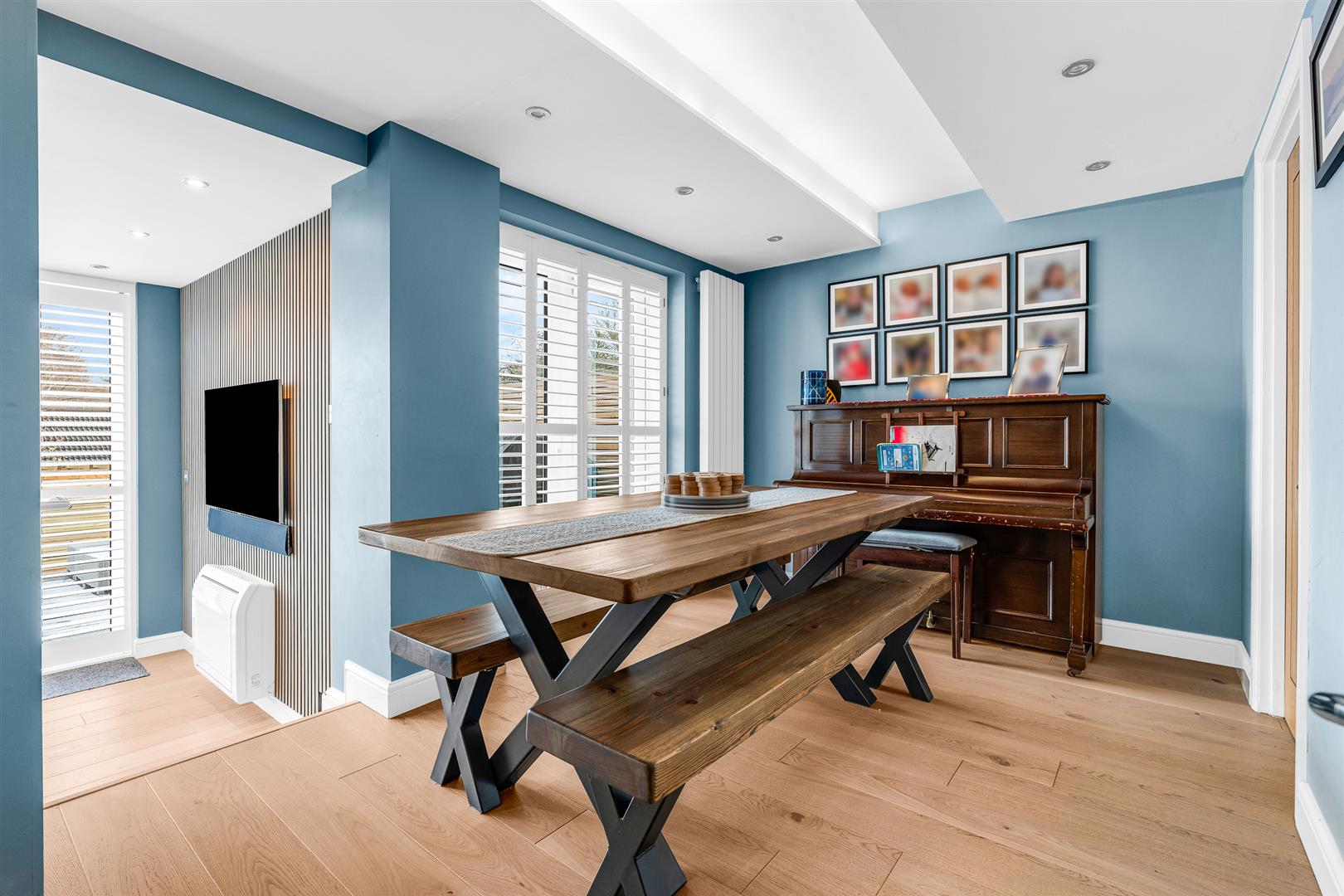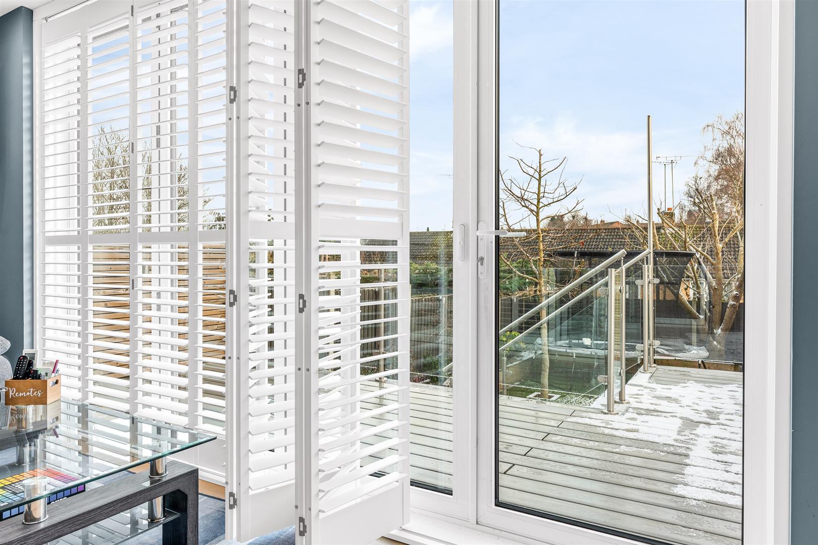 Beyond a fully glazed door from the kitchen is the smart dining room, featuring a clever ceiling design with concealed lighting that brings some real architectural flair to the space, further enhanced by the stunning bespoke window shutters that grace the fully glazed doors opening out onto the rear terrace.