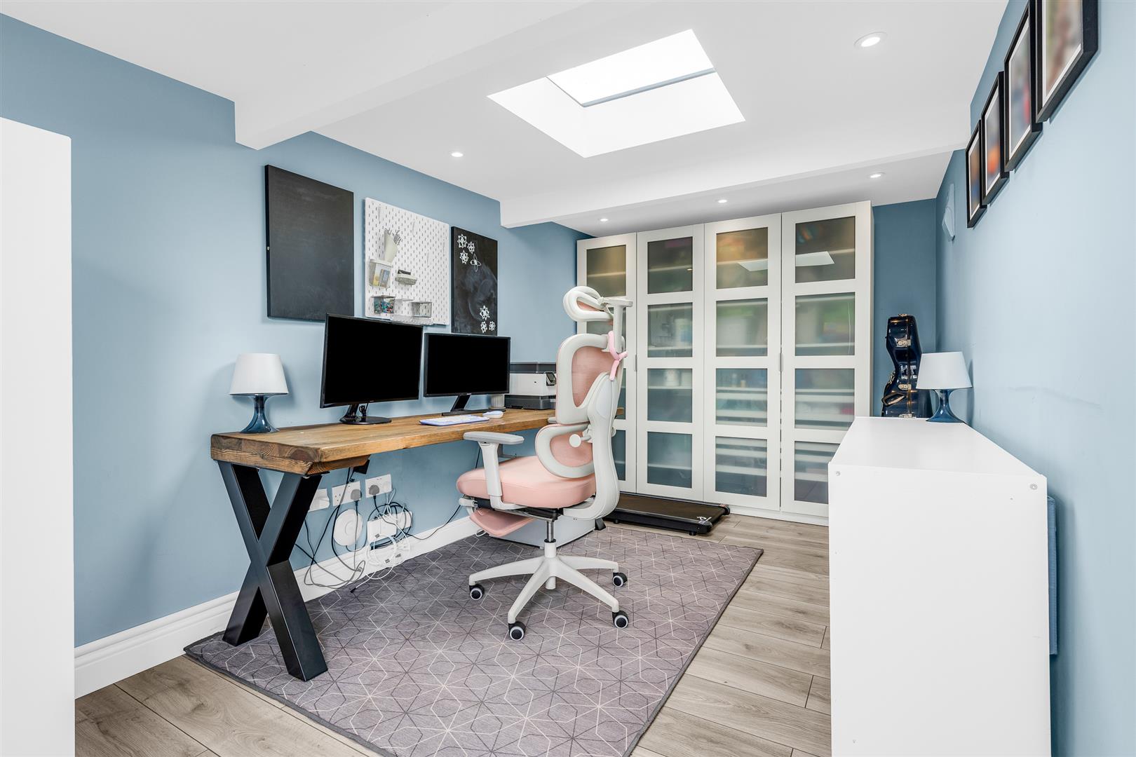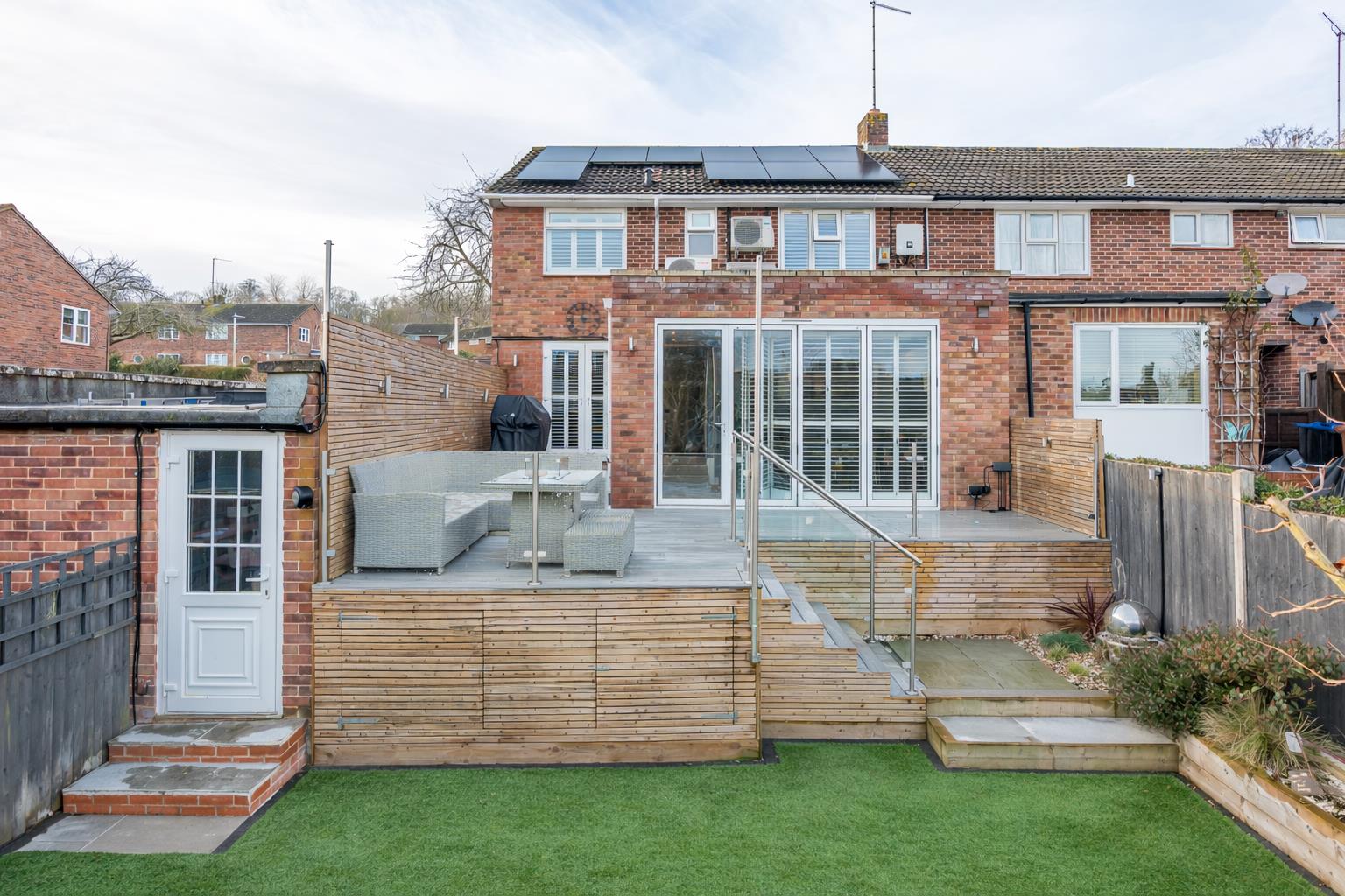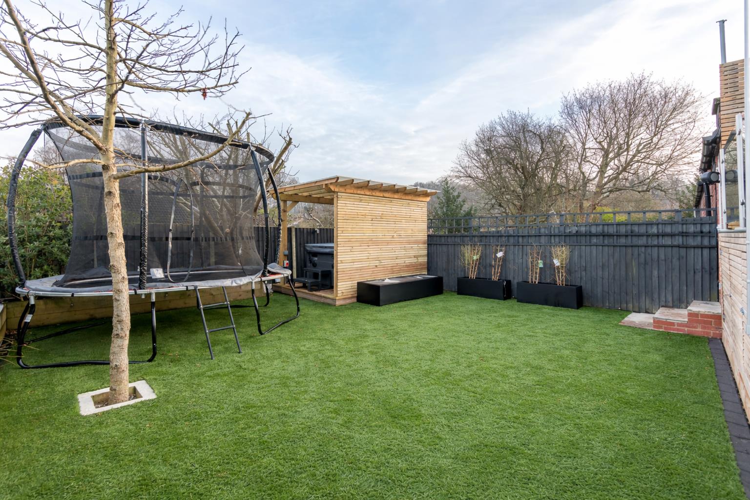 The front garden has been neatly landscaped to provide attractive terraces that each have raised beds and low maintenance artificial grass lawns alongside the paved steps leading to the house. To the rear is a fabulous all weather decking terrace that is just perfect for outdoor casual seating and dining, edged by a safety glass balustrade which extends down a short flight of steps to the garden below. Clever use of the space under the decking has generated a useful storage area for toys and garden furniture. The garden is a good size with raised flower beds along two sides and a lovely pergola in the corner, perfect for a hot tub/jacuzzi. High quality, minimum maintenance artificial grass has been laid throughout, giving a practical surface for children to play on, along with easy access to the separate office/studio. The garden is completely secure and enclosed and so is ideal for pets and children.