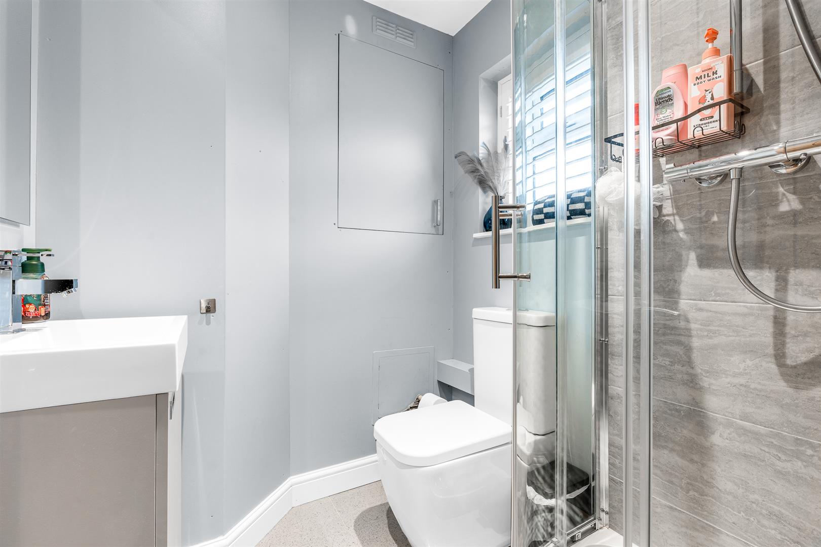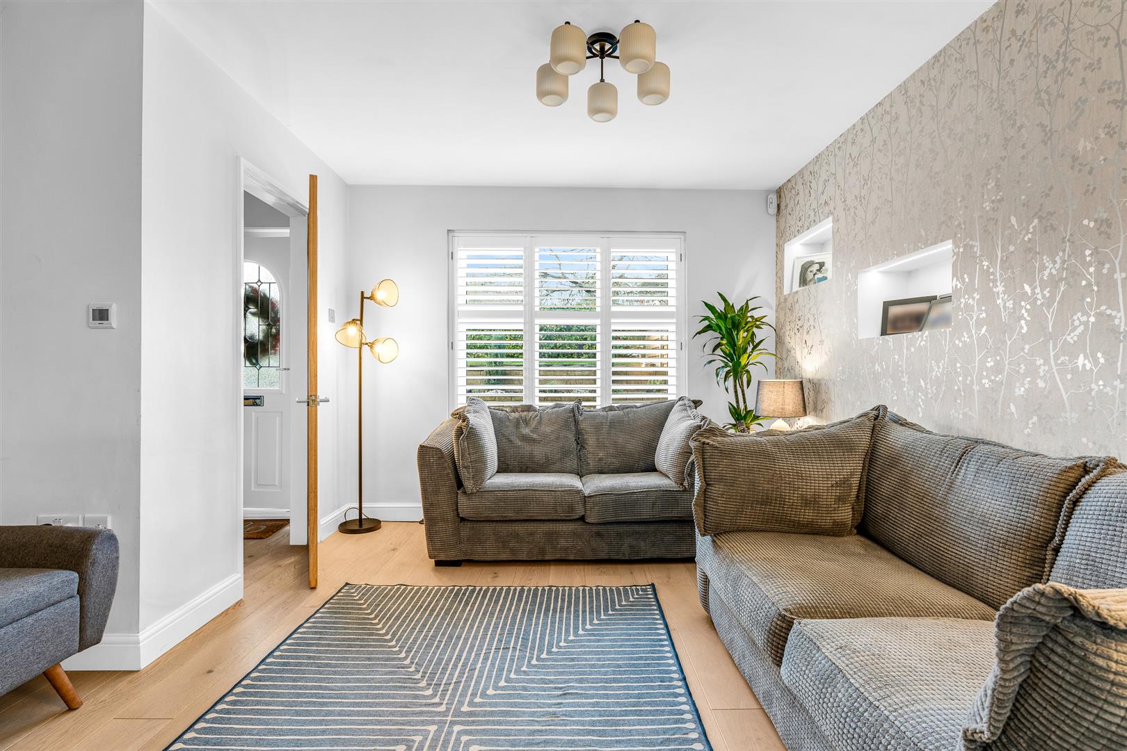 The pretty front door, with an attractive shaped leaded light window, opens into a smart entrance hall, which leads into the large living room on one side, and into the ground floor shower room beyond the staircase on the other.
