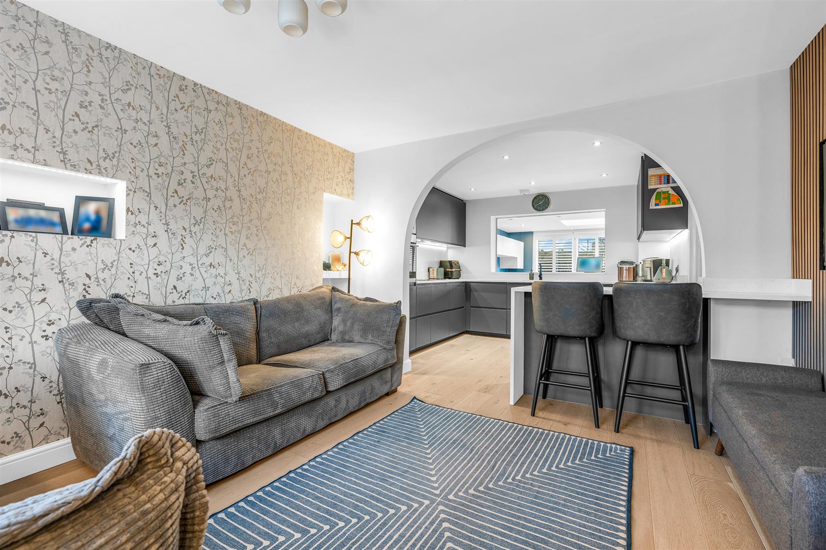The living room is a good size and a nicely balanced virtually square shape, allowing it to be furnished in a variety of ways to suit your needs. The room is elegantly designed, with a modern flame effect fire set into one feature wall and a number of stylish recesses into the wall opposite. Comfortably large enough for multiple sofas and chairs, the room is kept light and bright throughout the day thanks to the large front facing window and the open plan arched connection with the rear facing kitchen.