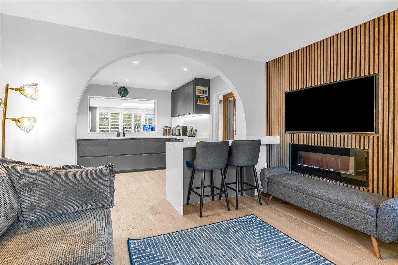 The kitchen is cool and chic, with a comprehensive array of wall and floor mounted cupboards finished in matt grey lining the perimeter, ensuring you will never run low on storage space. Under-cabinet lighting illuminates the bright white worktops, whilst a full complement of premium brand appliances are integrated within the units. This really is a kitchen that is full of style and practicality in equal measure, topped off by an island helping to delineate the space from the adjacent living room that offers more storage cupboards beneath a neat breakfast bar.