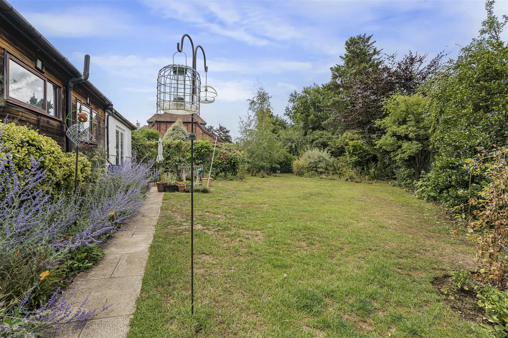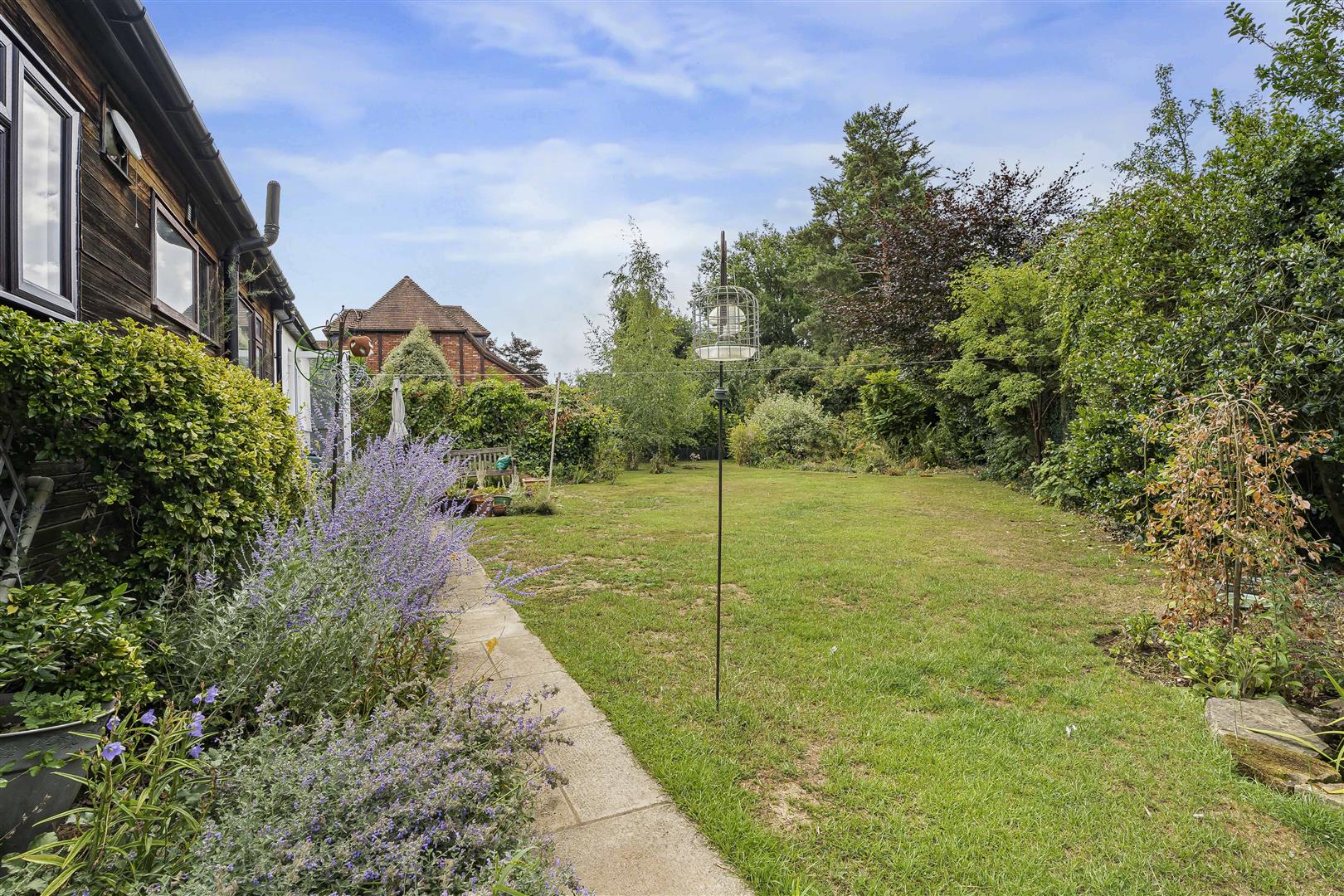 The substantial front garden is a wonderful amalgam of colour and texture achieved through creative and skilful planting, whilst still leaving plenty of space for a large driveway that provides parking for multiple cars as it approaches the detached double garage. A separate gated entrance leads from the driveway along the side of the garden/storage room giving convenient direct access into the rear garden, which can also be achieved from front to rear through the garden/storage room.
