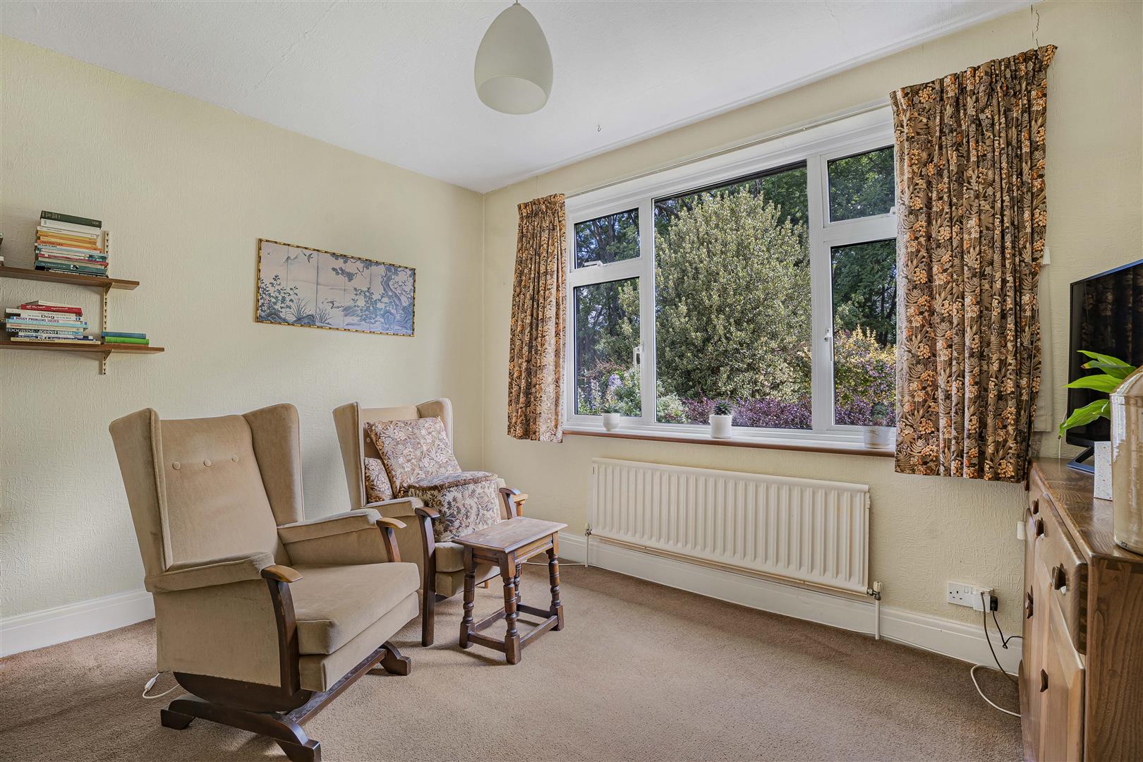 The house is barely visible from the road, nestled behind a mature well planted garden with a wide variety of bushes, shrubs, specimen trees and areas of lawn through which snakes the path leading up to the main entrance. Decorative windows flank the door, which has its own stained glass shaped panel and is set beneath a neat protective tiled porch roof.