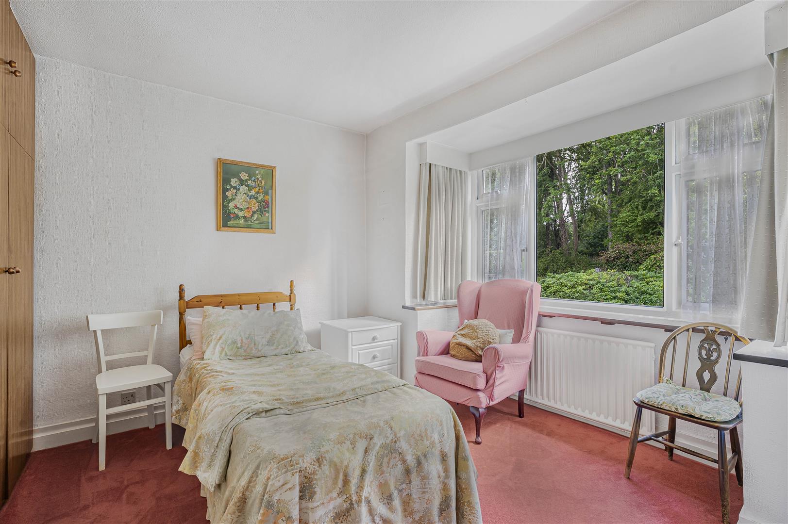 The larger room in the front corner is configured as a bedroom and is eminently suitable for the task. A fabulous bay window overlooks the front garden and allows the natural light to fill the room, which is fitted with multiple wardrobes and cupboards, still leaving plenty of open floor space for other occasional furniture.