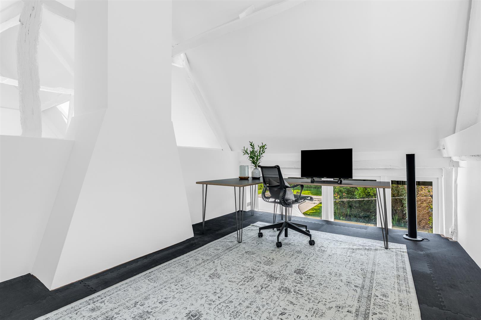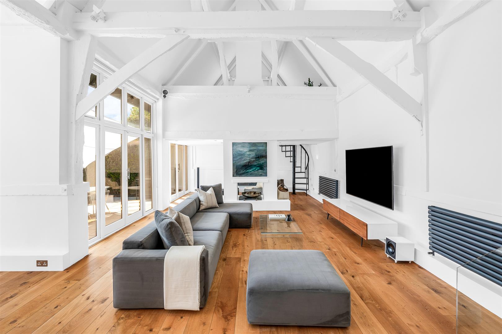 The main barn comprises a new 1909 Kitchen with a range of based and eye level units, waterfall granite, two dishwashers, chef’s pantry, washing machine, Quooker boiling / cold filtered water tap and American fridge/freezer. The principle reception has 6.5m vaulted ceilings and a double sided open log burning fireplace refurbished and swept in November 2022. New gallery style dimmer controlled lighting and new coping/cabling for surround sound audio. The main staircase is refurbished in January 2023 and a new spiral staircase leads to a refurbished gym.