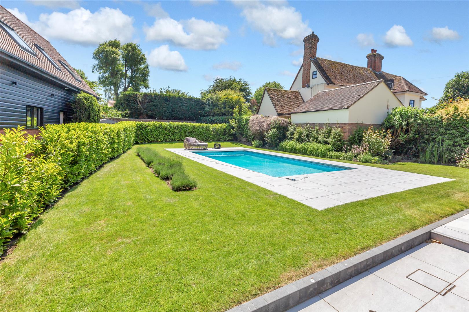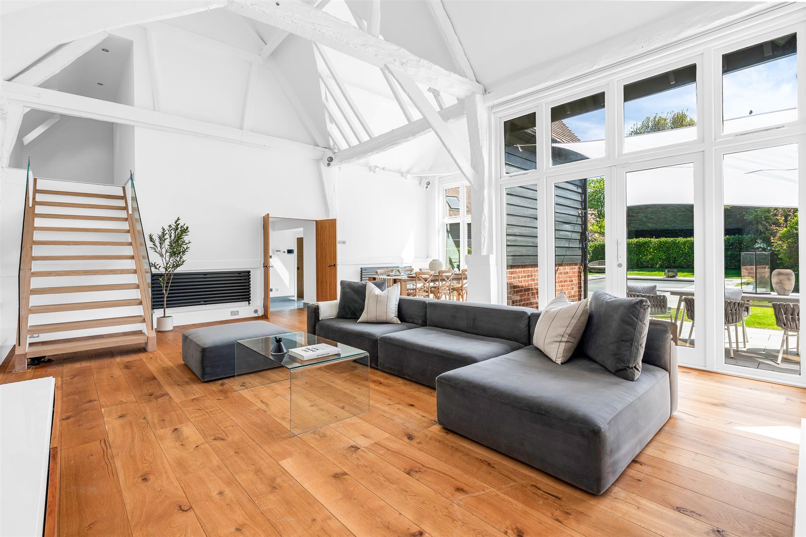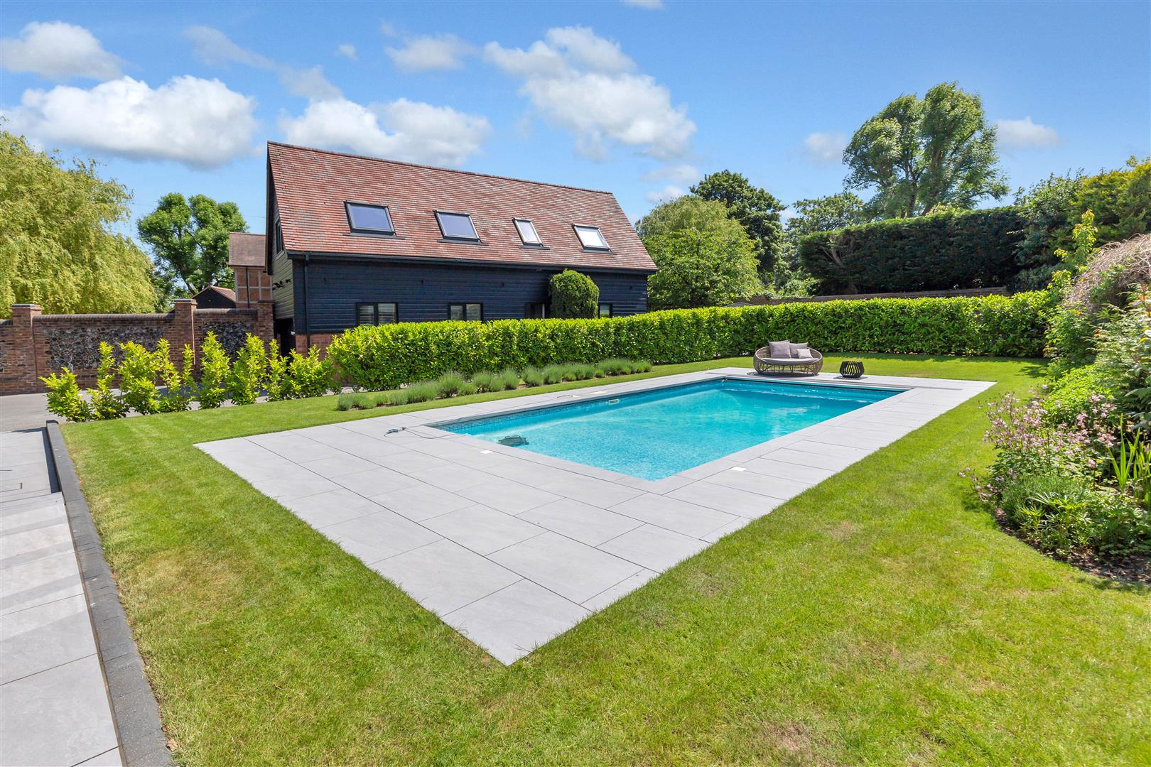 17th Century Detached Barn Conversion recently refurbished to an exacting, no expense spared standard throughout – offering 5 bedrooms, 4 bathrooms, 21 feet vaulted ceilings to the principle reception, air conditioning to both first floors, a detached self contained annexe, garage, underfloor heating, Gym, walled garden, gated driveway and a refurbished heated swimming pool.