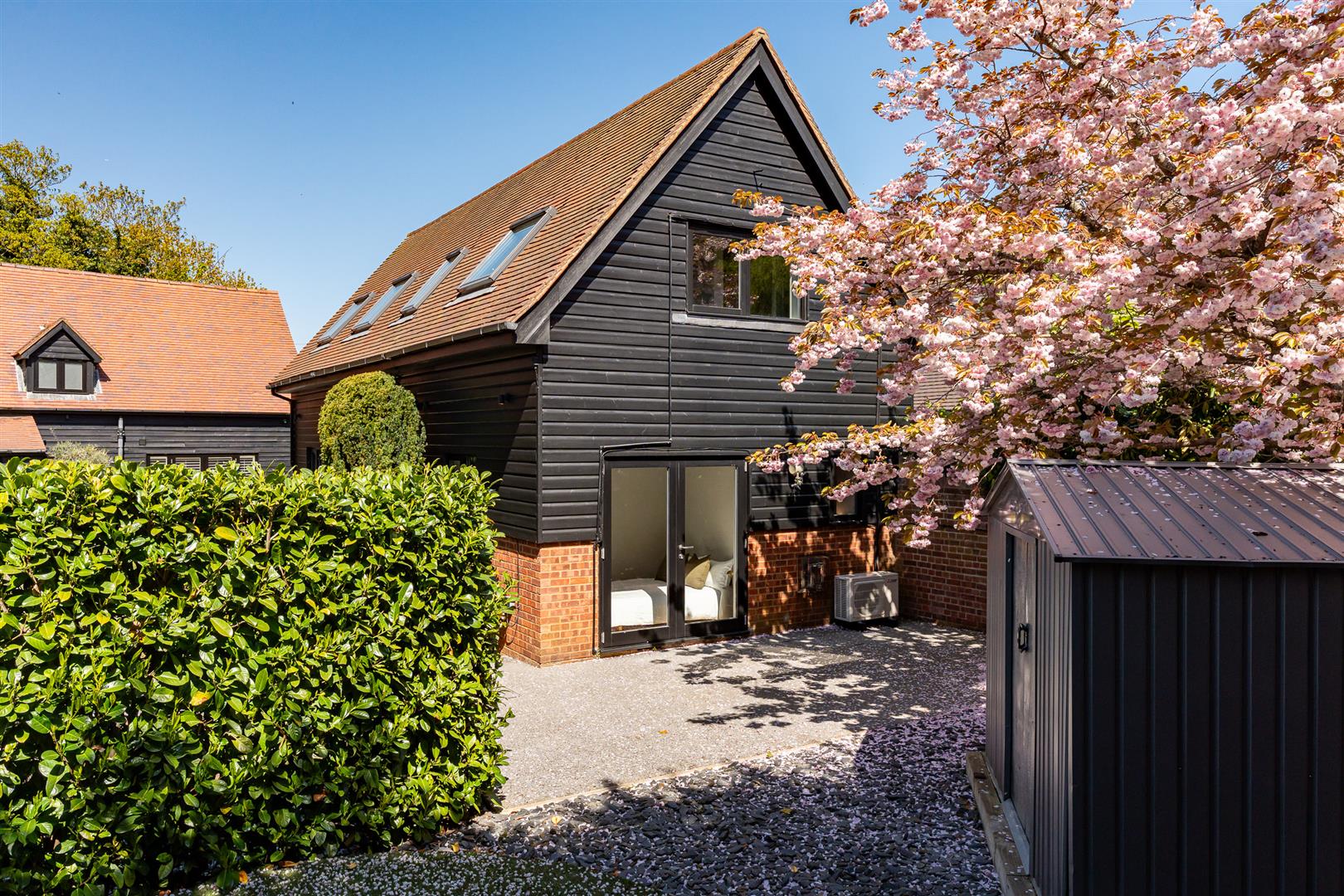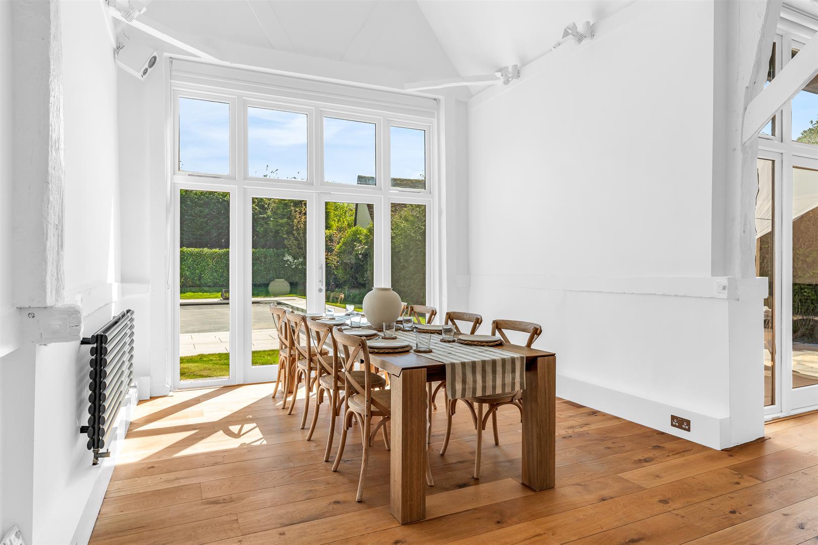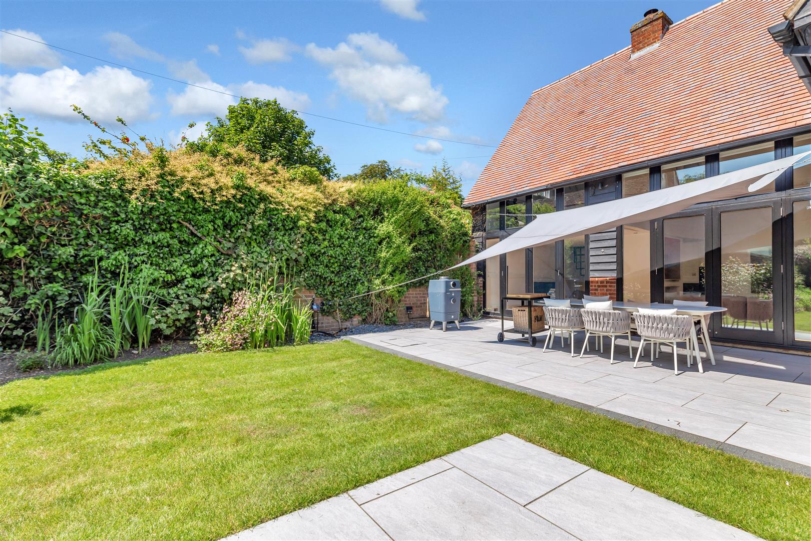 17th Century Detached Barn Conversion recently refurbished to an exacting, no expense spared standard throughout – offering 5 bedrooms, 4 bathrooms, 21 feet vaulted ceilings to the principle reception, air conditioning to both first floors, a detached self contained annexe, garage, underfloor heating, Gym, walled garden, gated driveway and a refurbished heated swimming pool.
