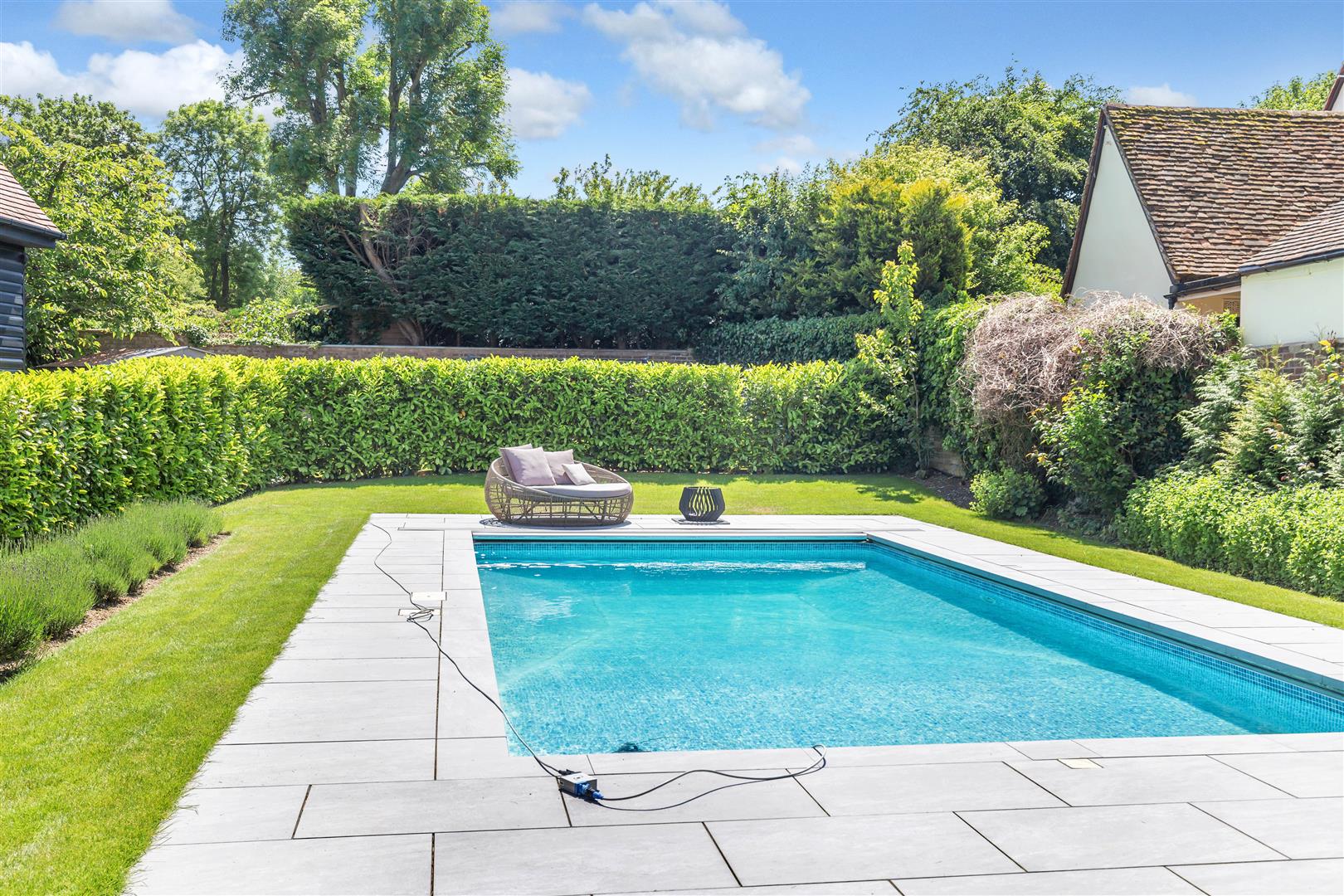 The walled garden has been completely re-landscaped including the refurbished in ground heated swimming pool with a 7 feet depth diving end. The pool is protected by a new in built electric (walk on) safety cover and cleaned by a new electric underwater (bottom and sides) robot pool cleaner (1 or 3 hour cycle) as well as a new pool cover surface water extraction pump. The swimming pool is served by a new pool plant shed with newly refurbished equipment and a high powered air source heat pump which can heat the pool to 33 degrees.