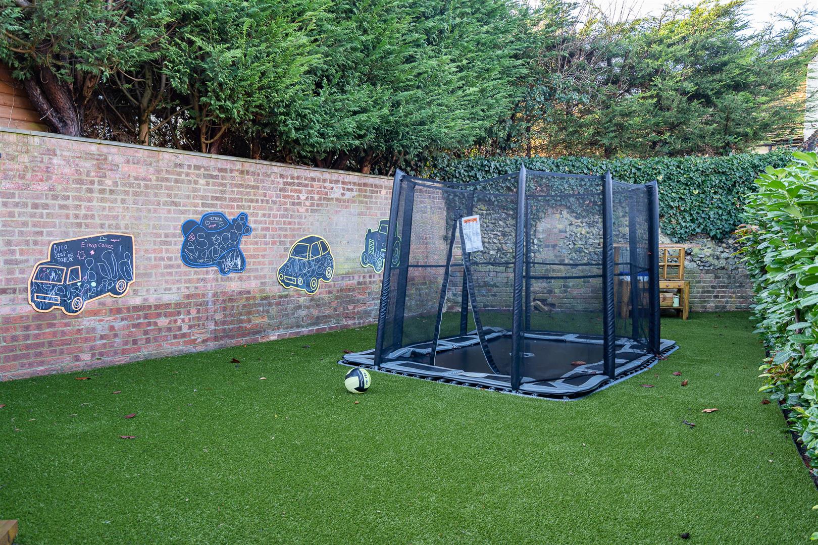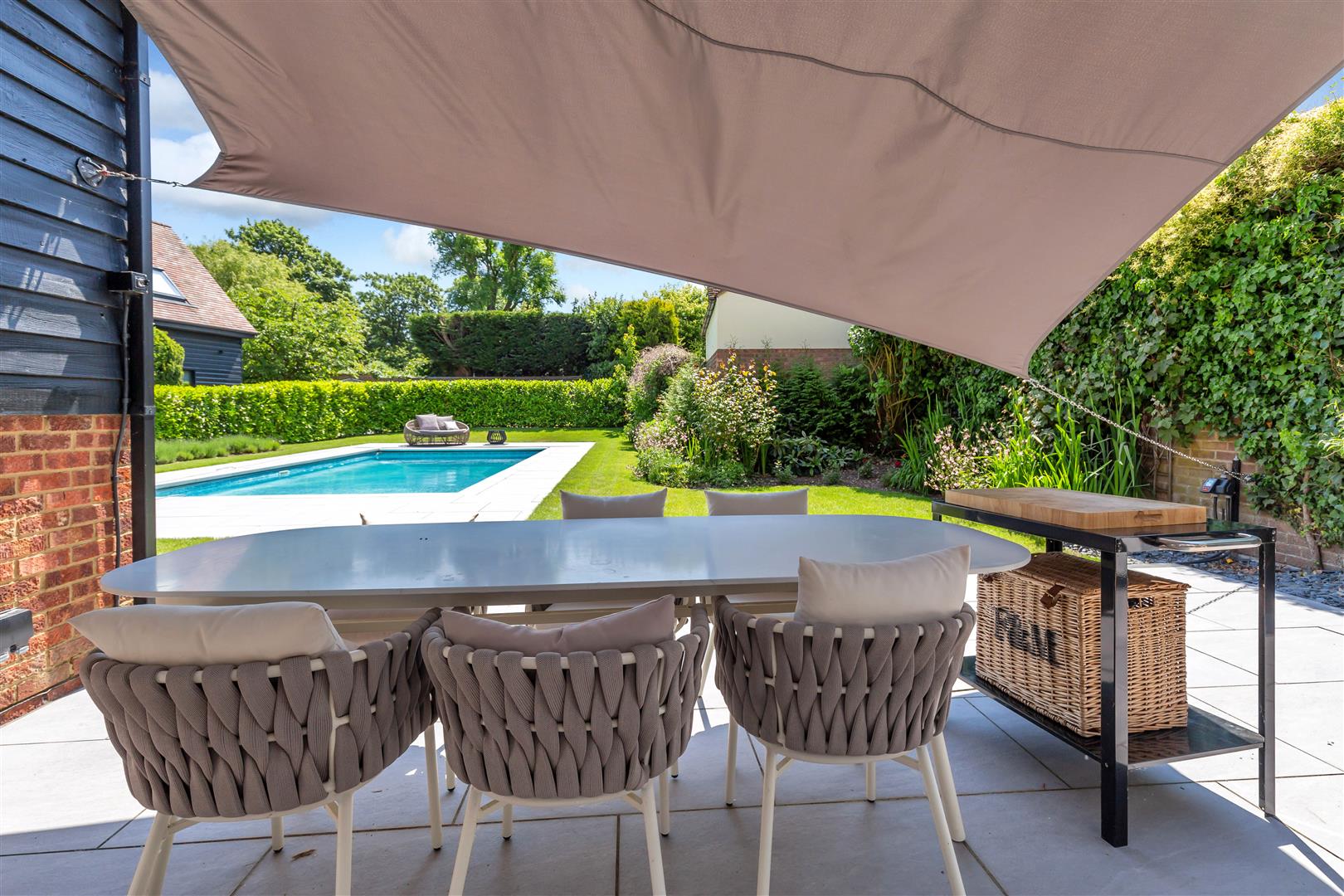 A newly tiled patio and walk way lead around the pool and garden to a new children’s play area with astroturf and sunken trampoline. Off the house is a large patio area with new 4m x 3m UV waterproof and hurricane proof sail. The planting benefits from a new underground electronically timed sprinkler system which also covers the lawn. At night the garden, driveway and pool are lit up by an extensive installation of exterior lighting all controlled by the Aone app.