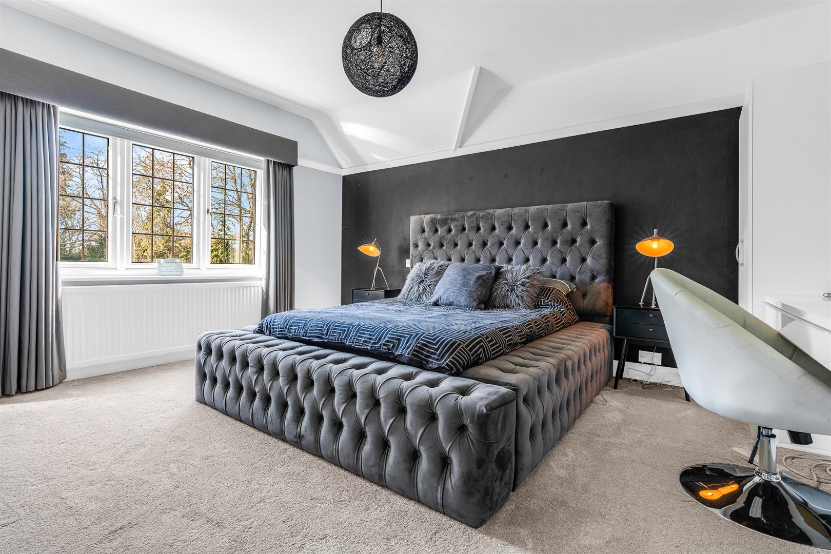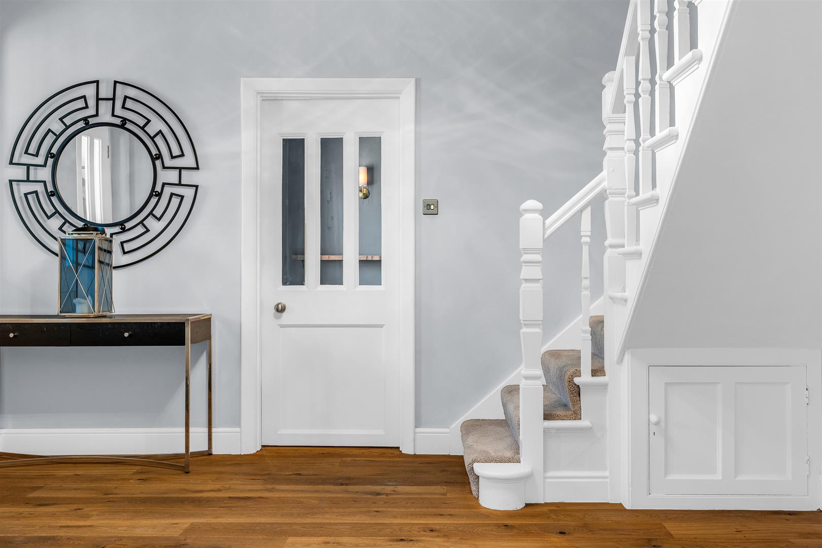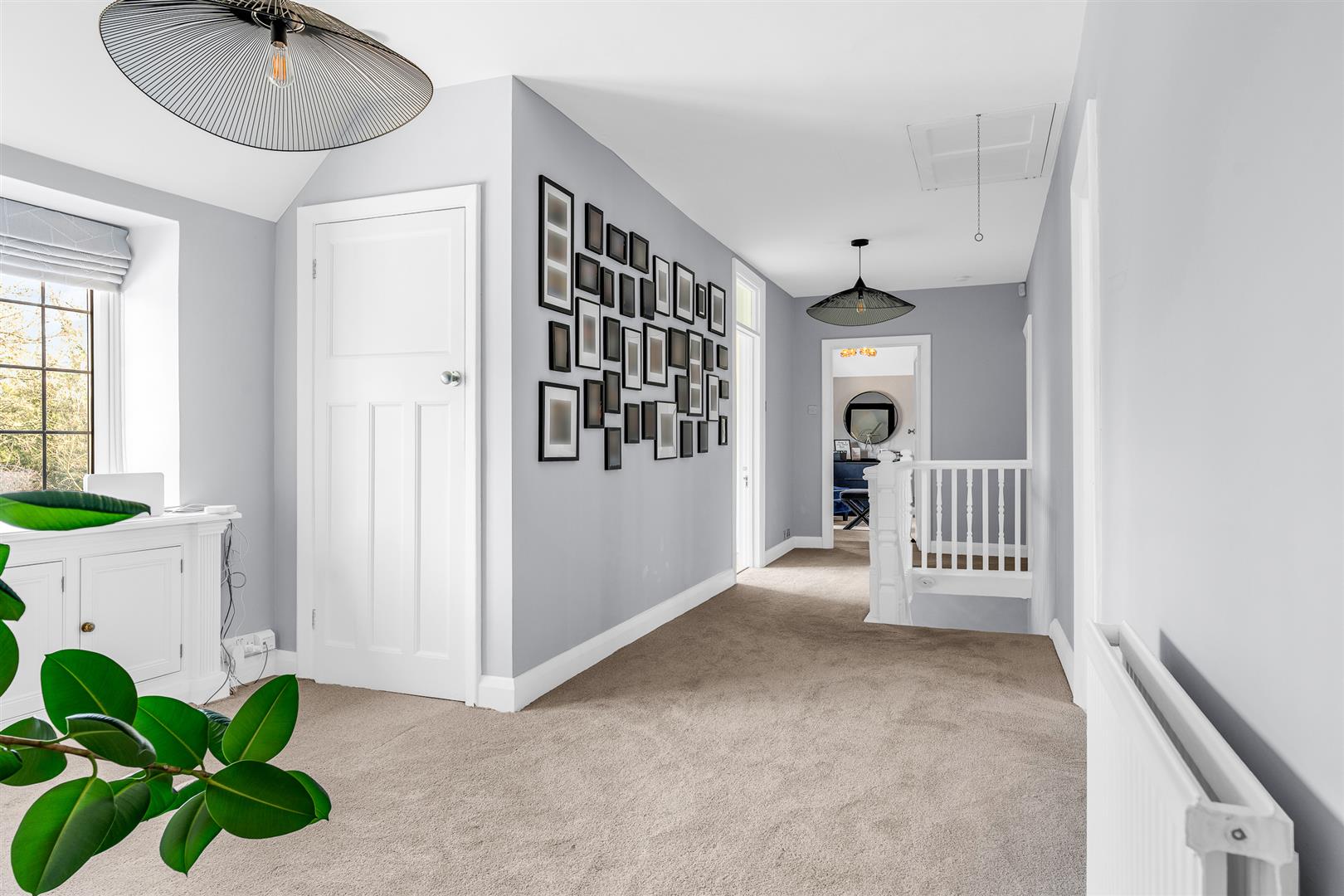 Upstairs is a galleried hallway running through the house, abundantly lit by a window to the front, which opens onto the six double bedrooms and three bathrooms, with intelligent design enabling the best bathroom access for all. Two of the bedrooms share an en-suite bathroom between them which boasts twin sinks along with a separate bath and shower. There is a family bathroom also with a separate bath and shower, whilst the principal bedroom enjoys a wall of fitted wardrobes and a very large en-suite shower room. Five of the six bedrooms enjoy far reaching views out across the extensive rear gardens, with one of them having an enchanting pair of full height stained glass French doors, with matching windows either slide, opening onto a glass Juliet balcony.
