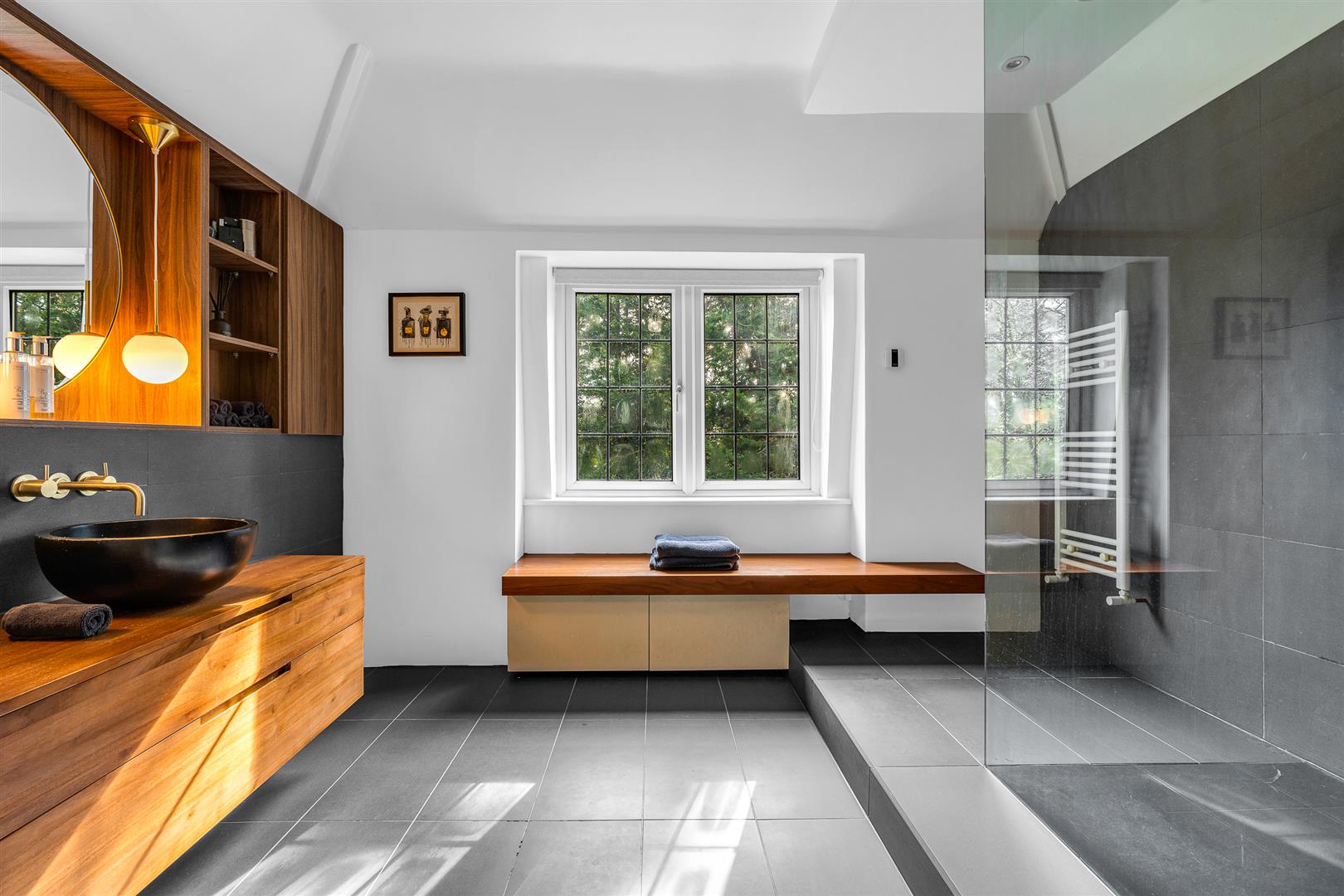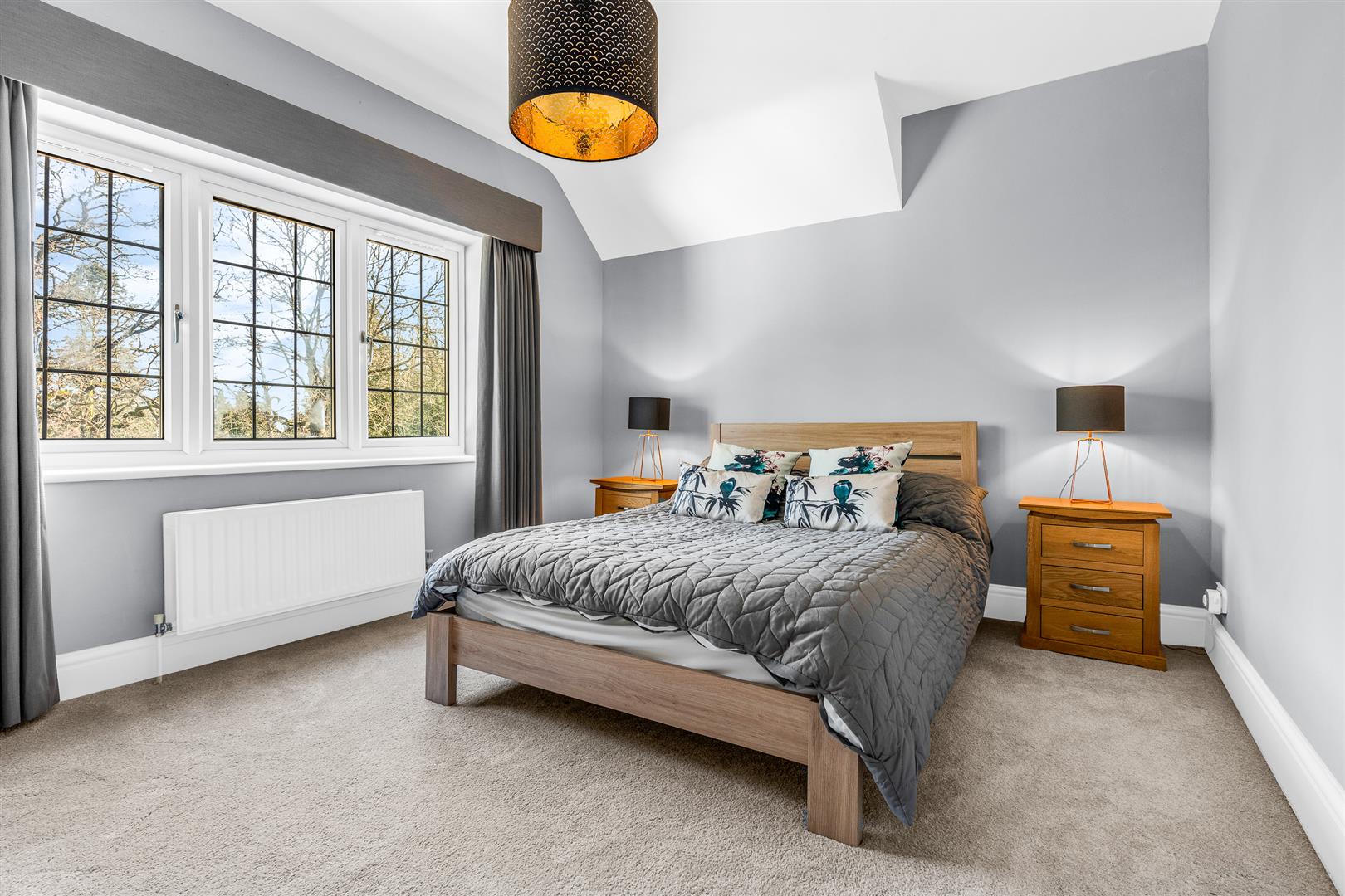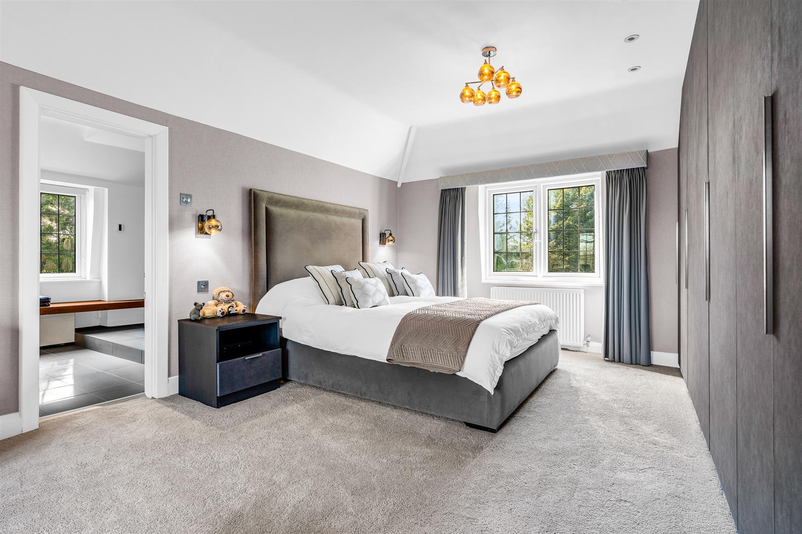 Upstairs is a galleried hallway running through the house, abundantly lit by a window to the front, which opens onto the six double bedrooms and three bathrooms, with intelligent design enabling the best bathroom access for all. Two of the bedrooms share an en-suite bathroom between them which boasts twin sinks along with a separate bath and shower. There is a family bathroom also with a separate bath and shower, whilst the principal bedroom enjoys a wall of fitted wardrobes and a very large en-suite shower room. Five of the six bedrooms enjoy far reaching views out across the extensive rear gardens, with one of them having an enchanting pair of full height stained glass French doors, with matching windows either slide, opening onto a glass Juliet balcony.