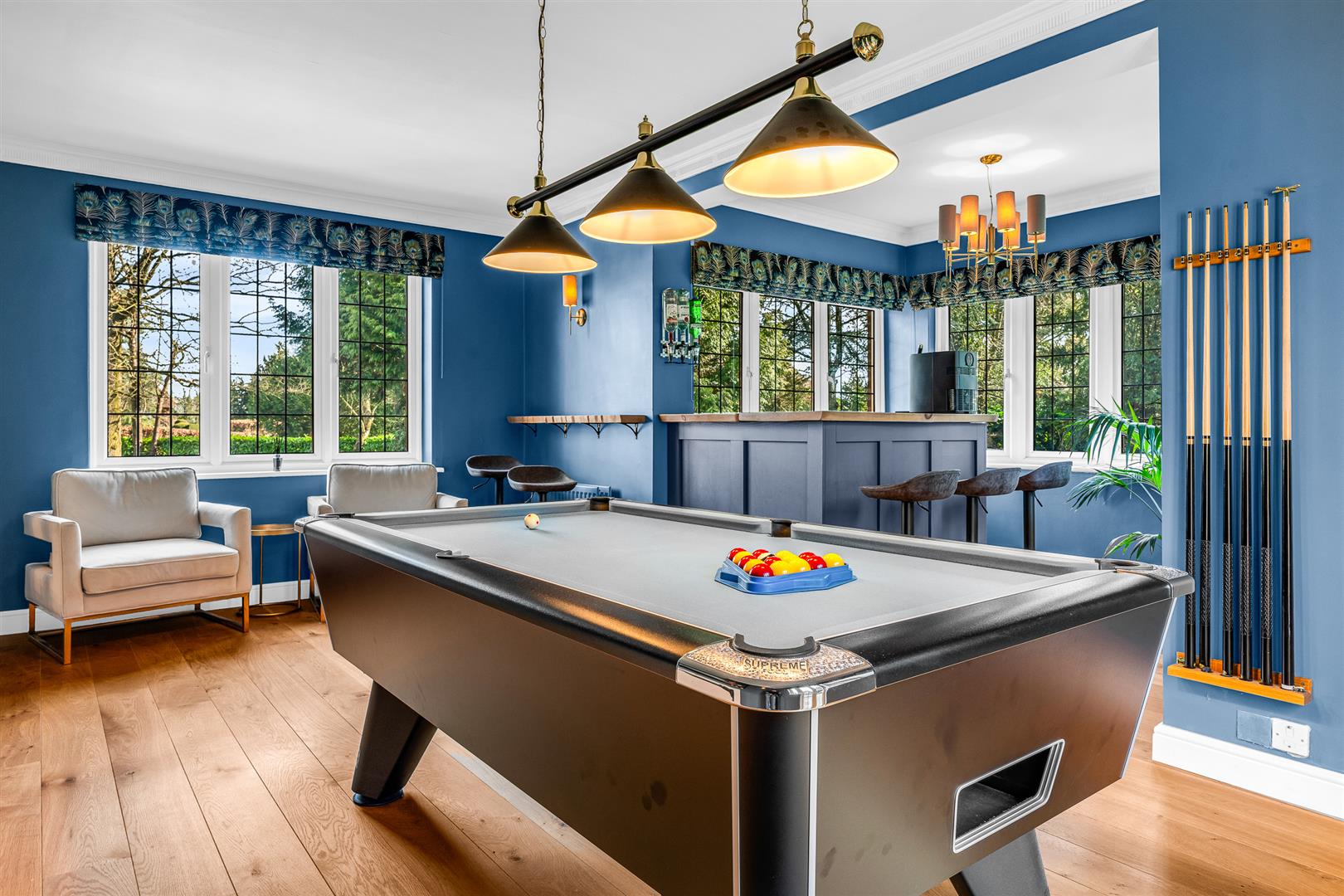 The games room takes up one wing of the house and is a simply fabulous facility to have. Windows adorn no less than five separate aspects, filling the room with light whatever the time of day, with the rear windows flanking a pair of French doors that open directly out onto the rear patio. There is ample space in the main part of the room for the games equipment of your choice, along with a really cool bar built into an ideally configured recess that is fully surrounded by windows overlooking the extensive grounds. This is a perfectly placed and proportioned space in which to spend time with family and friends.