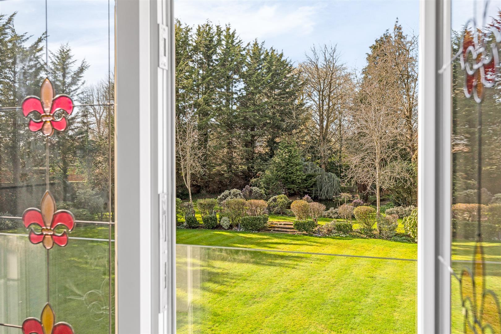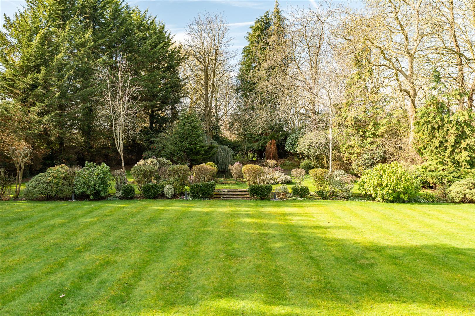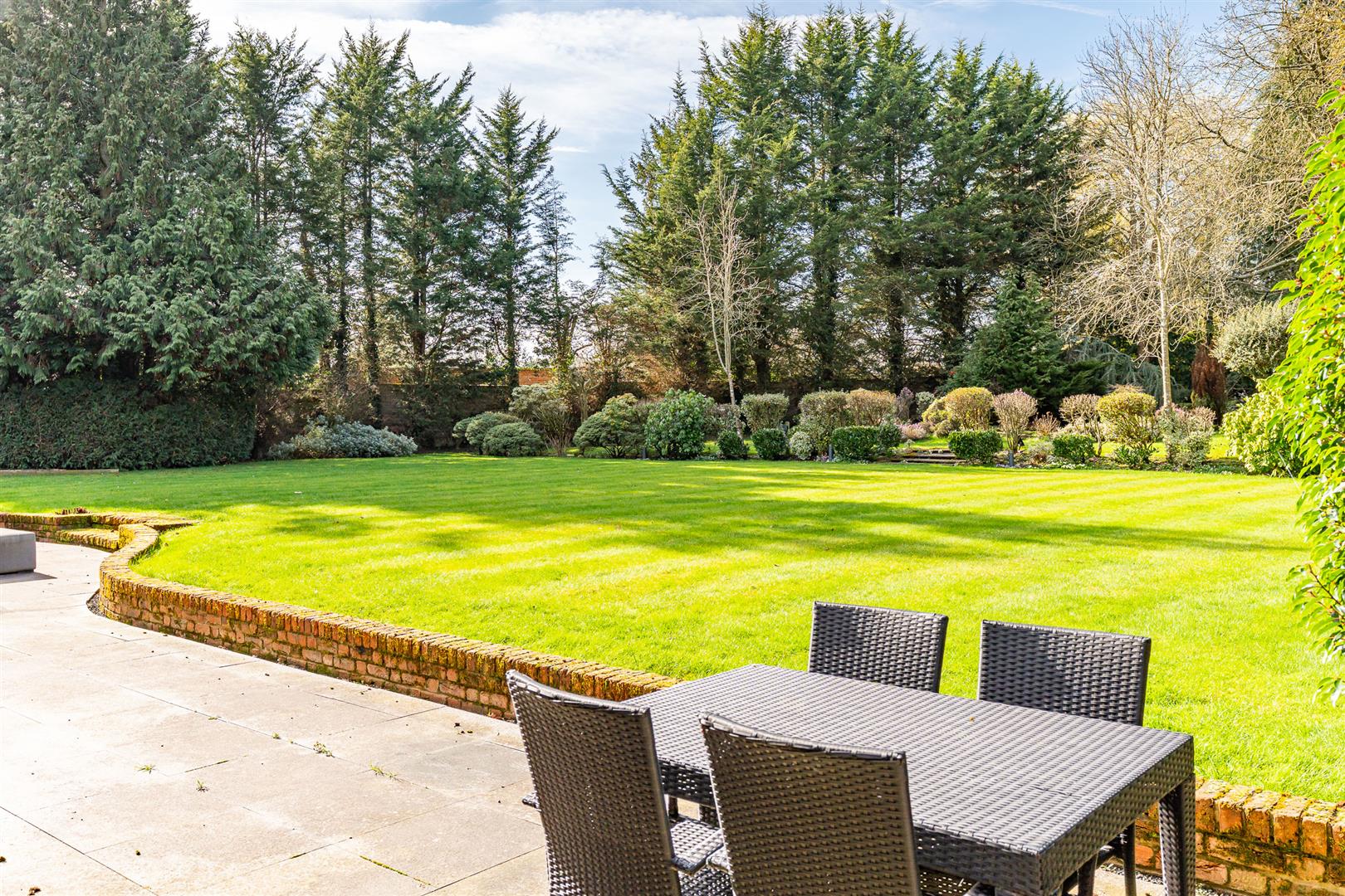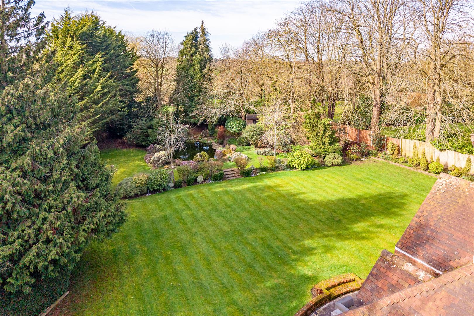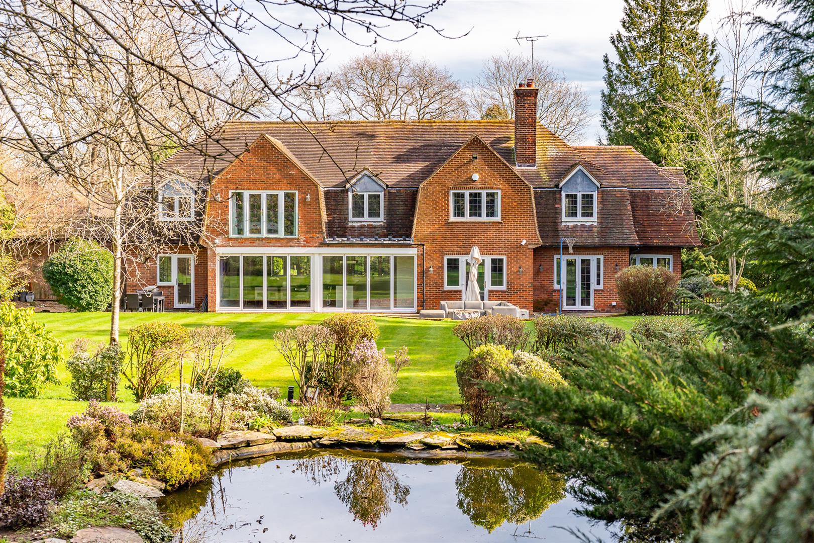 The house is set well back from the country lane on which it sits, with a few other large detached houses and open countryside as its only neighbours, offering a tranquil and secluded rural setting. The long carriage driveway approaches the house before sweeping around a large island with a lawn and flower beds at its centre, continuing towards the multi-car garage before looping back to exit the gated entrance to the roadway beyond. The grounds wrap completely around the house, with a deep paved patio stretching fully across the rear, ideal for casual seating and al fresco dining furniture. The rear gardens are elegantly and subtly landscaped with a raised lawn of substantial proportions running back from the large rear patio before stepping up through a deep flower border to a further lawn with a delightful pond at its centre. The whole garden, which is south west facing, is maintained to an extremely high standard, but is designed and planted in a wonderful parkland style that effortlessly offers an authentic natural environment, with a skilfully curated variety of planting that celebrates every different size, form and colour of shrubs and bushes interspersed with a selection of stunning specimen trees.