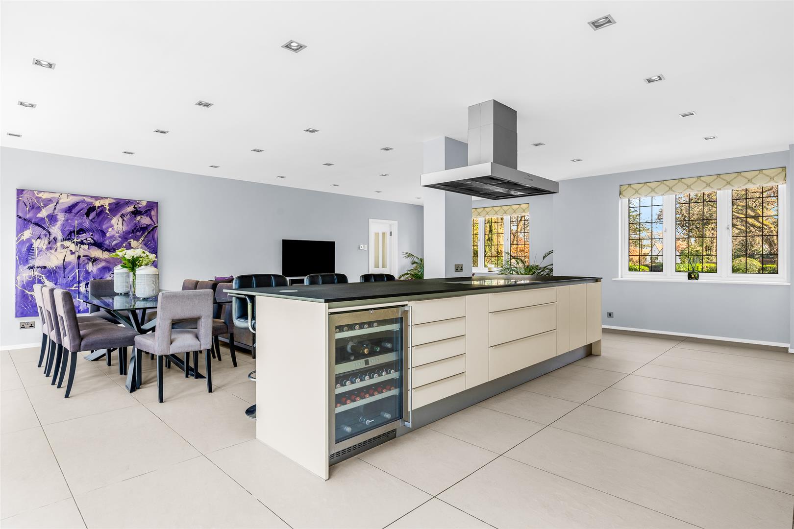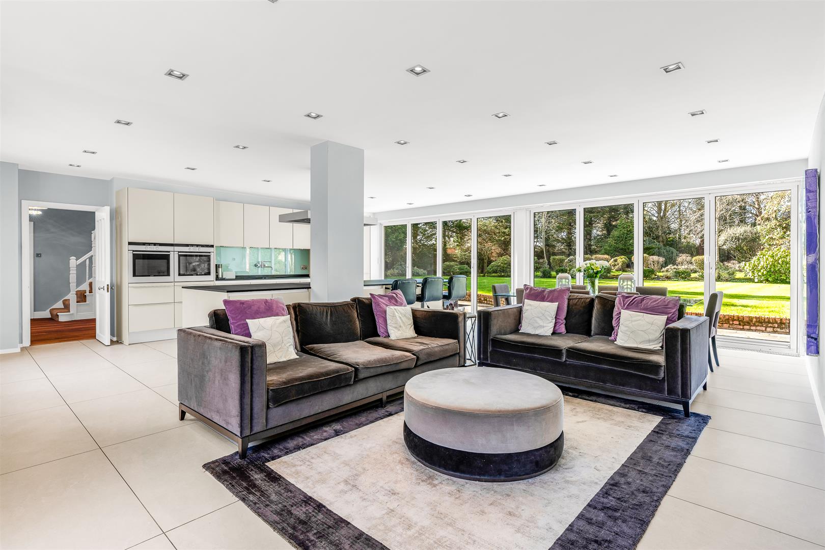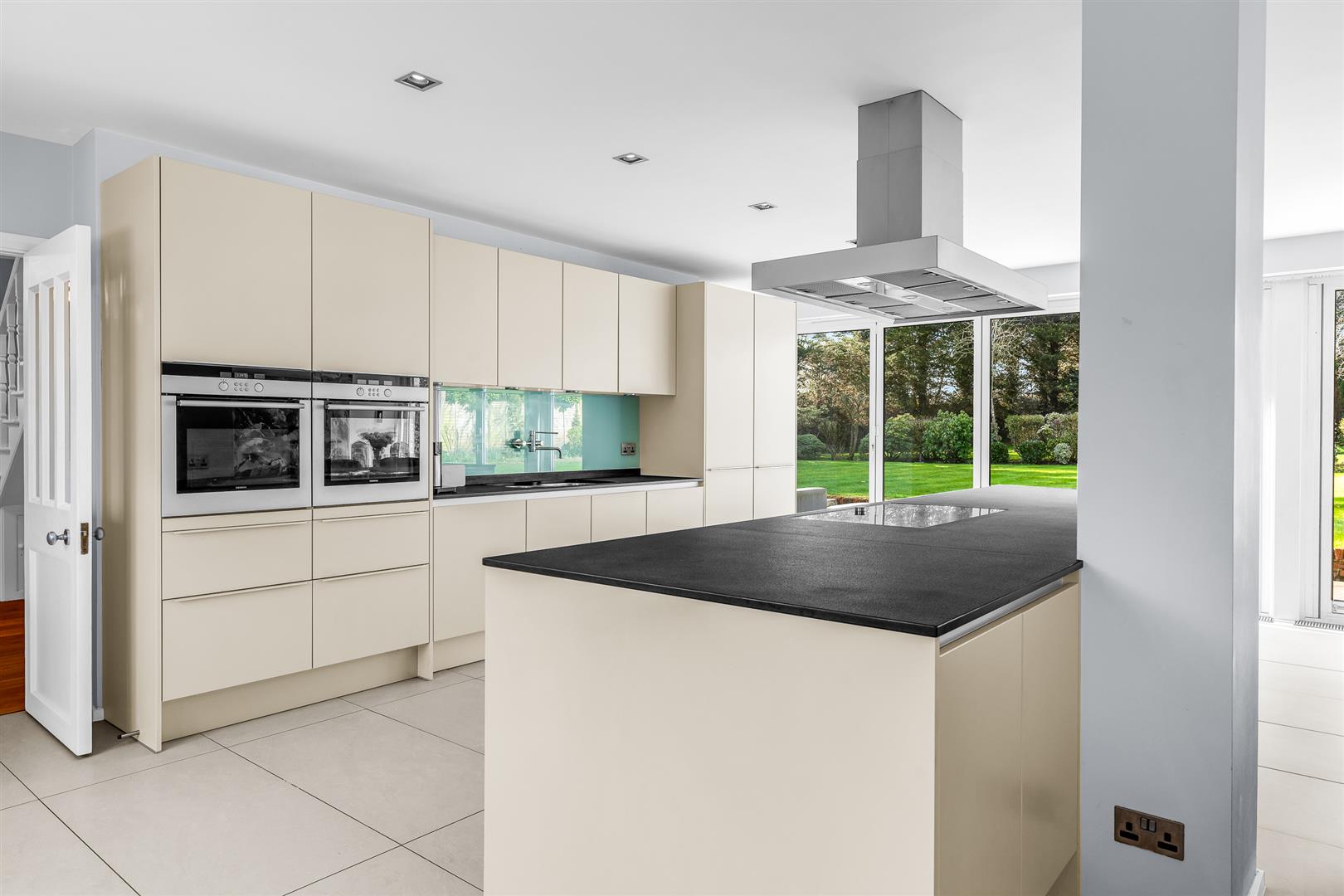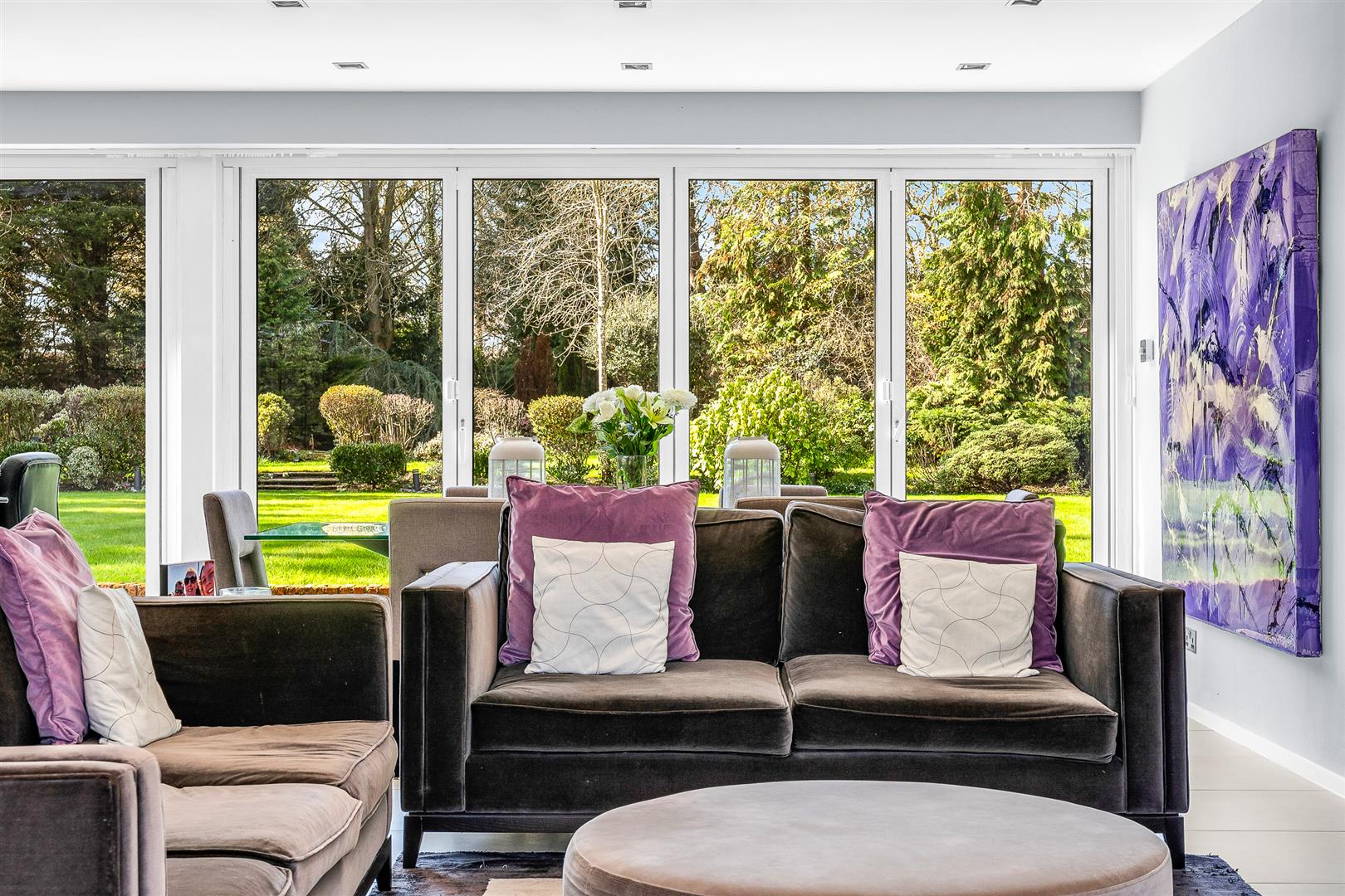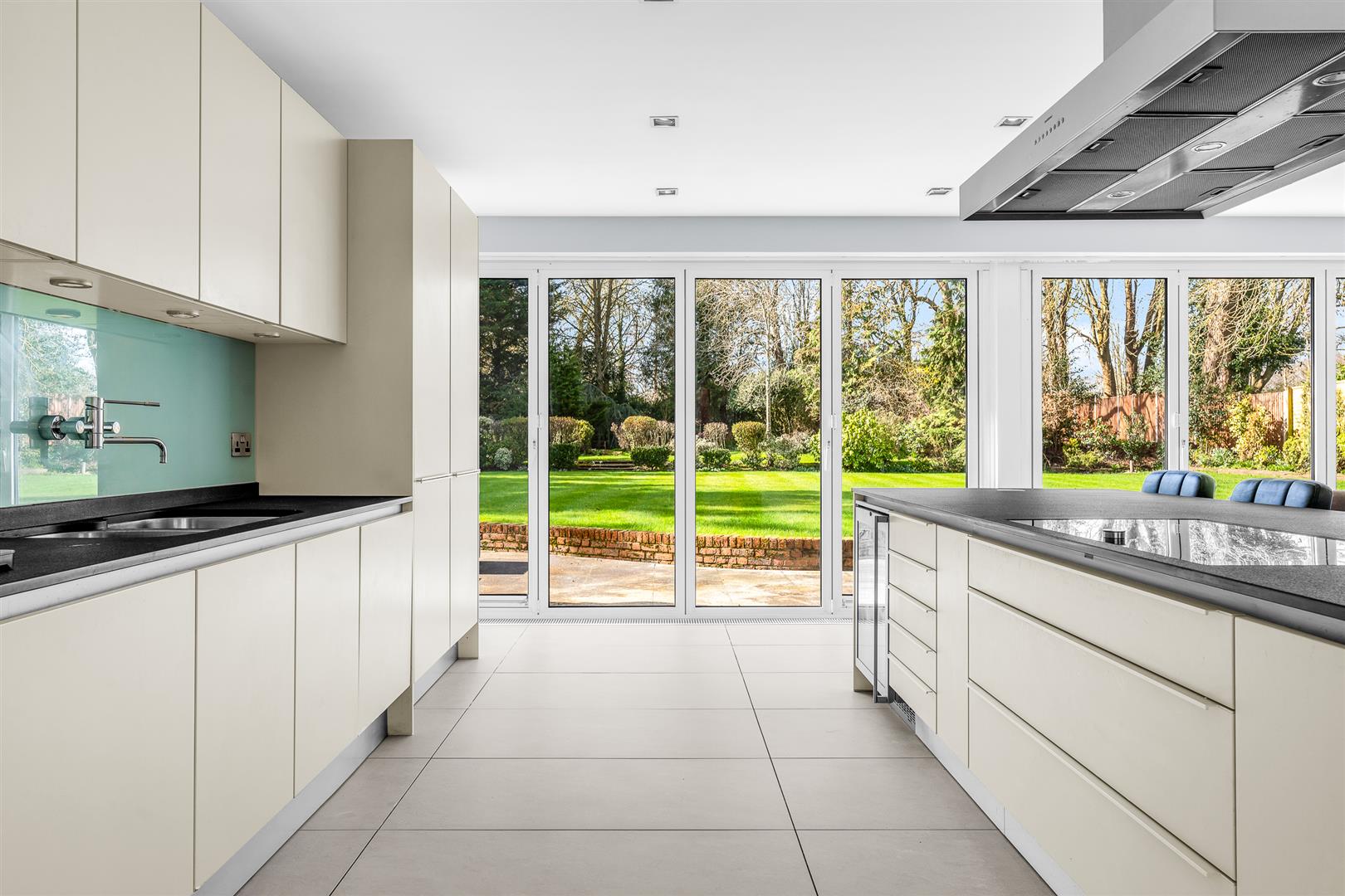 The kitchen/dining/family room is just superb. A capacious open plan area that stretches fully from the front to the rear of the house. Two large front facing windows work in harmony with two sets of four panel bi-fold glass doors at the rear to absolutely fill the whole room with both natural daylight and the glorious garden views that surround the house. It is a delightful room in which to spend time together and is sure to become the hub and beating heart of this fabulous home. A substantial island helps to delineate the working kitchen area, both physically and visually, whilst also offering plenty of food preparation space, an inset hob with extractor above and other integrated appliances including a large wine cooler as well as a neat breakfast bar. Behind the island is a full wall of high and low level fitted cupboards, ensuring more than ample storage space and containing further integrated premium quality appliances. The remainder of the room is wide open, unencumbered floor space for you to configure and furnish in any way that best suits your family’s needs. It has a substantial footprint giving you the freedom to easily include a number of sofas and chairs as well as a generous dining suite, plus other occasional furniture should you desire it. Flexible, adaptable, spacious and fully connected to the beautiful grounds outside, this is a very special room indeed!