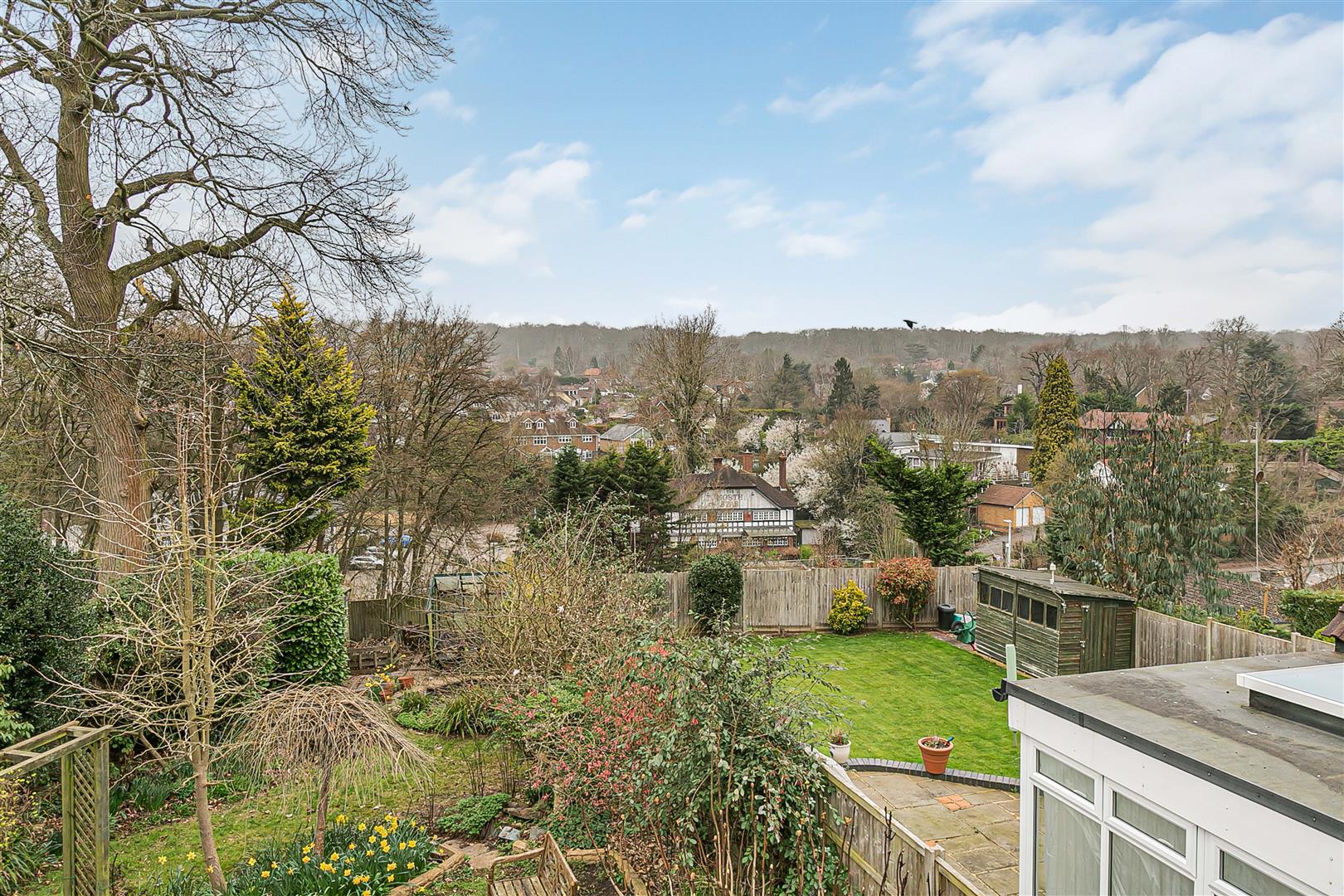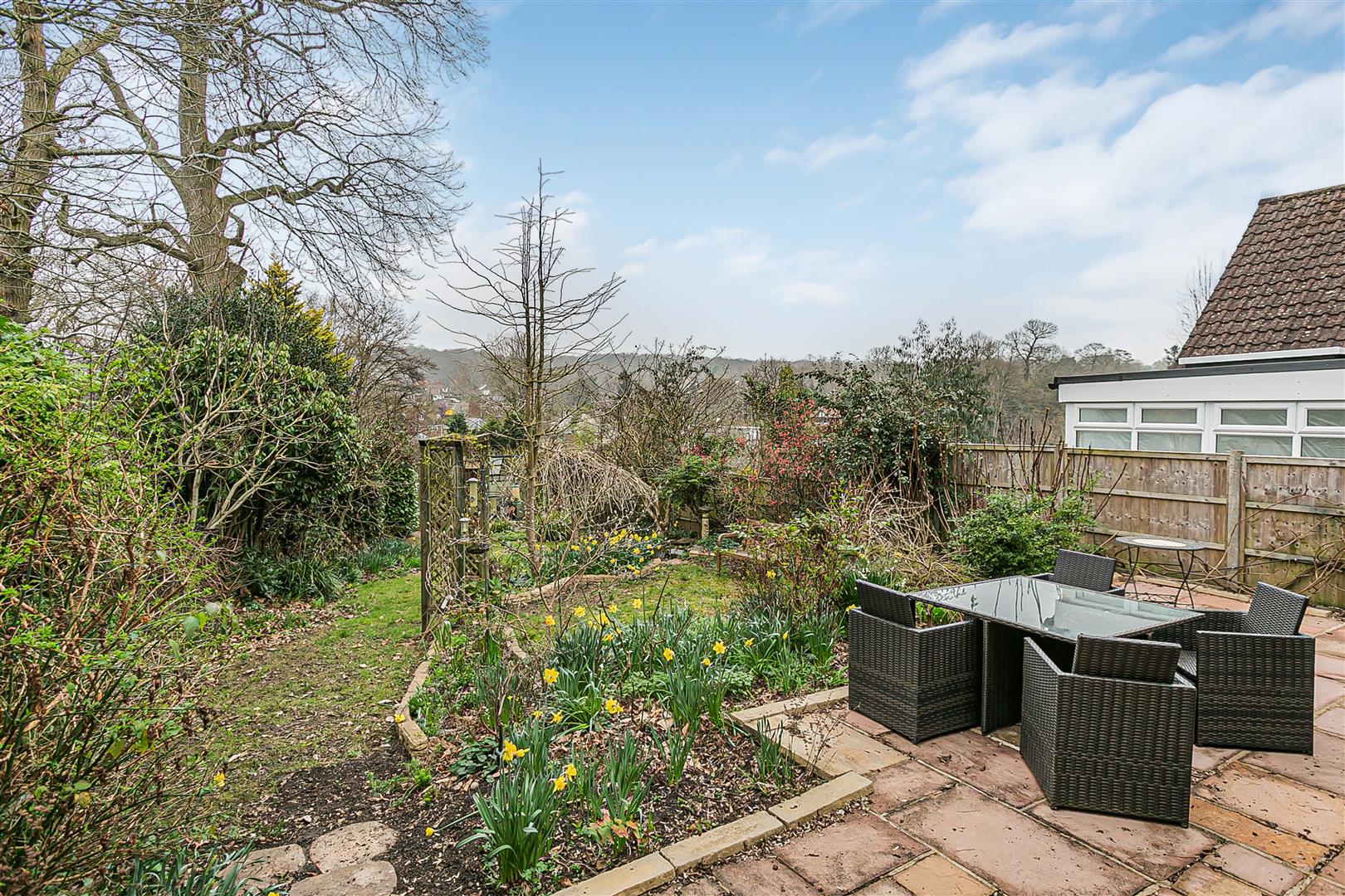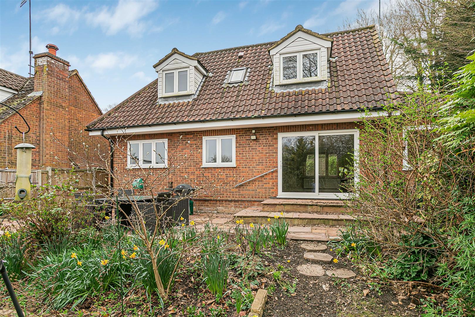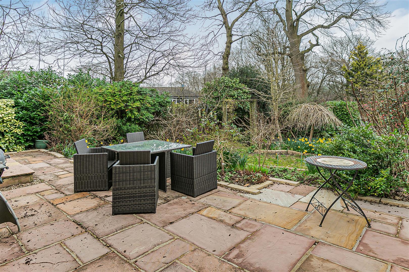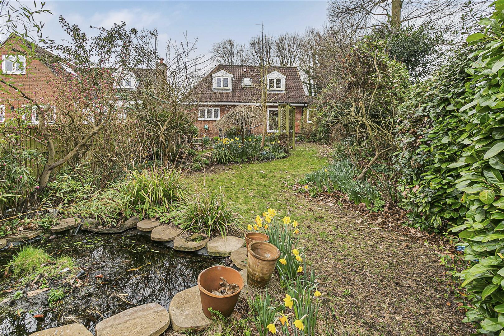 The house is set well back from the road, with a gated entrance opening onto a very large block paved driveway that extends past the detached garage up to the front of the house, ensuring more than ample parking for family and visitors. A couple of steps lead down from the driveway to a nice paved courtyard that links the front door to the glazed French windows opening out to the front from the living room, extending across the rear of an attractive raised flower bed that runs along the edge of the drive. There is useful separate access along the side of the house into the rear garden, which is secure and enclosed and so ideal for pets and children. A large paved patio runs across the full width of the rear of the house, slightly elevated over the gently sloping garden and just perfect for outdoor casual seating and dining furniture. The remainder of the garden has been skilfully landscaped into a number of interlinking terraces, all of them completely full of a wonderful blend of flowers, shrubs and bushes interspersed with neat areas of lawn, along with an ornamental pond at the far boundary. Blessed with a fabulous open aspect, it is a wonderful place to relax together as a family and ideal for entertaining guests.