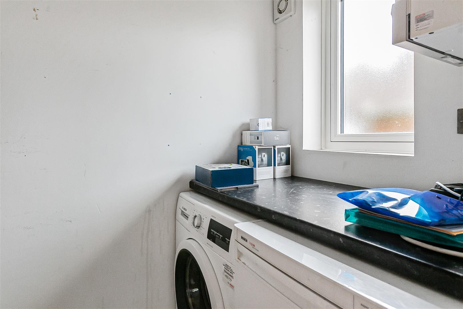 One wing of the house is taken up by the kitchen/dining room. This is another large room, stretching the full width of the house, again with plenty of natural light flooding in through two generous front facing windows arranged along its length. One end of the room has been sensibly designed as the working kitchen area, ensuring everything you need falls readily to hand. There is a comprehensive array of wall and floor mounted cabinets fitted around the perimeter, that extend along the whole of the outside wall, making sure you will never run low on storage space or work preparation worktop area. Within the cabinets is a full complement of integrated appliances sure to fulfill your day to day needs, along with a planned in open space ready to accept a full height fridge/freezer plumbed in for a watercooler/ice maker. Despite the extensive cupboard space, there is still ample free floor area remaining for a good sized dining table and chairs, with a nice free flow in and around the dining area from the adjoining reception room. From the corner of the kitchen there is a convenient external door leading out to the side of the house, along with access through to a well placed utility/laundry room fitted for a washing machine and dryer.