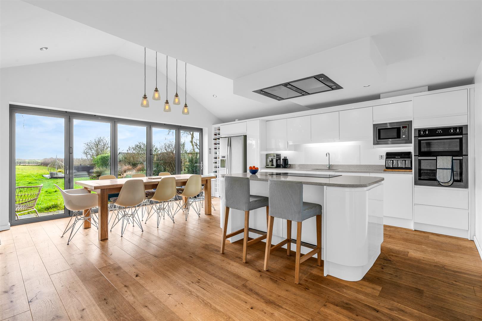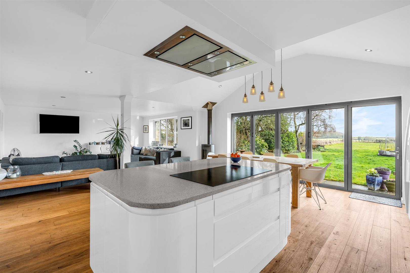 Taking the whole of the rear part of the house is the stunning kitchen/dining/family room. This room is an absolute triumph of light and space led design that stretches to nearly thirty-three feet in length. Virtually the whole of the rear wall is glass, with a large set of picture windows at one side joining with the five panel bi-fold doors at the other to flood the space with natural daylight and the beautiful uninterrupted views along the garden to the open countryside beyond. There is more than ample space in the room to comfortably fulfil all three separate functions, and the architect has done a brilliant job in offering some physical and visual elements that help delineate the different spaces without hampering the wonderful free flow between them. The working kitchen area occupies one end of the room, neatly designed to incorporate a full complement of wall and floor mounted fitted cupboards presented in a crisp gloss white finish that offer abundant storage and food preparation worktop area. Further supplementing both of these aspects is a gorgeous curved edge central island that houses the inset hob, with twin extractors above, as well as a spacious breakfast bar. Integrated within the cabinets is a complete collection of premium branded appliances, with designated space for a double width fridge/freezer. Of course the kitchen is generously supported by the separate large utility/laundry room, fitted for a washing machine and dryer, that also has a useful external door to the side of the house, making it perfect for cleaning muddy boots and muddy dogs when you have been out enjoying the fabulous Hertfordshire countryside that is right on your doorstep. The area behind the fitted kitchen is perfect as a dining room, bathed as it is in the natural daylight that cascades in through the bi-fold doors. In this area the ceiling opens into the full pitch of the roofline, giving it some added theatre as well as a different atmosphere to the kitchen area. It is easily able to accept a substantial dining suite. As the space opens out into the large family room, there is a geometric pillar in the centre and a contemporary log burner to the rear, both of them neat styling details to help differentiate the different spaces. The family room is a large space in its own right, allowing you myriad options on layout and furniture. This inspired room just works so well, both as a whole and as individual spaces, and is sure to become a strong family social meeting point, the heart and hub of this delightful home.