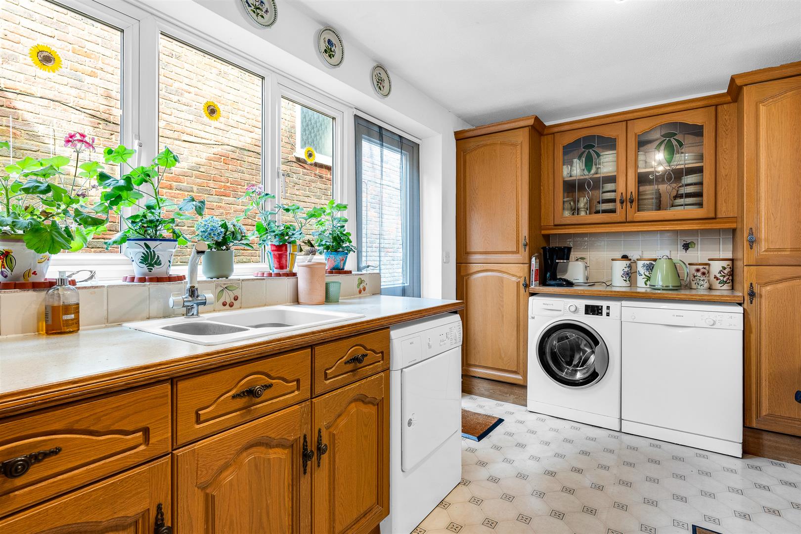 The front corner of the house contains the kitchen, which is blessed with a full length run of windows along the outside wall, culminating in a part glazed door opening onto a gated pathway running from the front garden to the rear. The kitchen enjoys a strong ergonomic design ensuring everything you need falls readily to hand and has a comprehensive array of wall and floor mounted cupboards fitted around the entire perimeter of the room, providing a tremendous amount of storage space and worktop area. Multiple appliances are integrated into the cabinets, with additional floor space planned in to accept a number of free standing items.