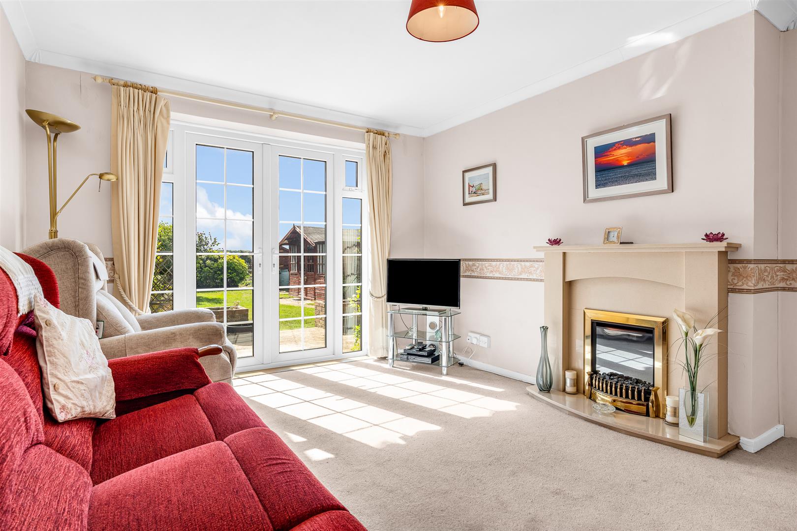 Taking up the rear corner of the house is the spacious living room. Glazed French doors with additional windows either side virtually fill the rear wall, giving easy, convenient access out onto the patio as well as filling the room with both abundant natural light and wonderful views out across the rear garden. An attractive fireplace with a coal effect fire adorns one wall, offering a nice visual focal point and welcome winter warmth, with the room being comfortably large enough for multiple sofas and chairs to be placed in any way that you may wish.