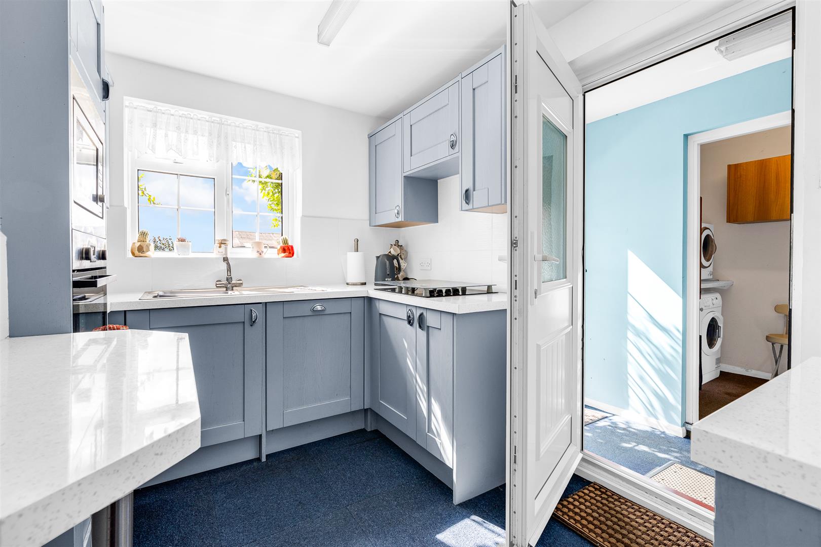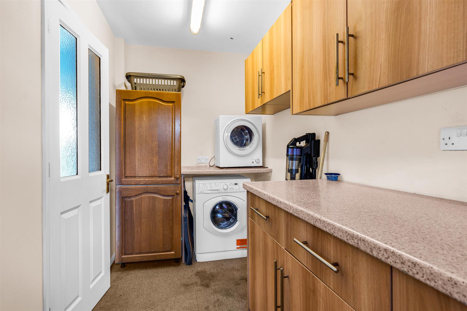 At the rear of the entrance hall, just beyond a practical understairs cupboard, is the kitchen, which has been cleverly fitted with a good range of wall and floor mounted cupboards to offer plentiful storage space, a number of integrated appliances and even a neat breakfast bar. A side door opens from the kitchen into a hallway which runs fully from the front to the back of the house offering a really useful direct access from the driveway into the rear garden. Across the hallway is a substantial utility/laundry room with a full wall of floor and wall mounted cupboards providing additional storage and an ideal location for a washing machine and tumble dryer.