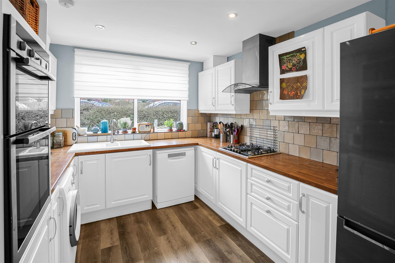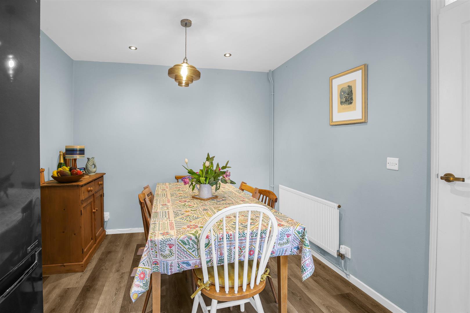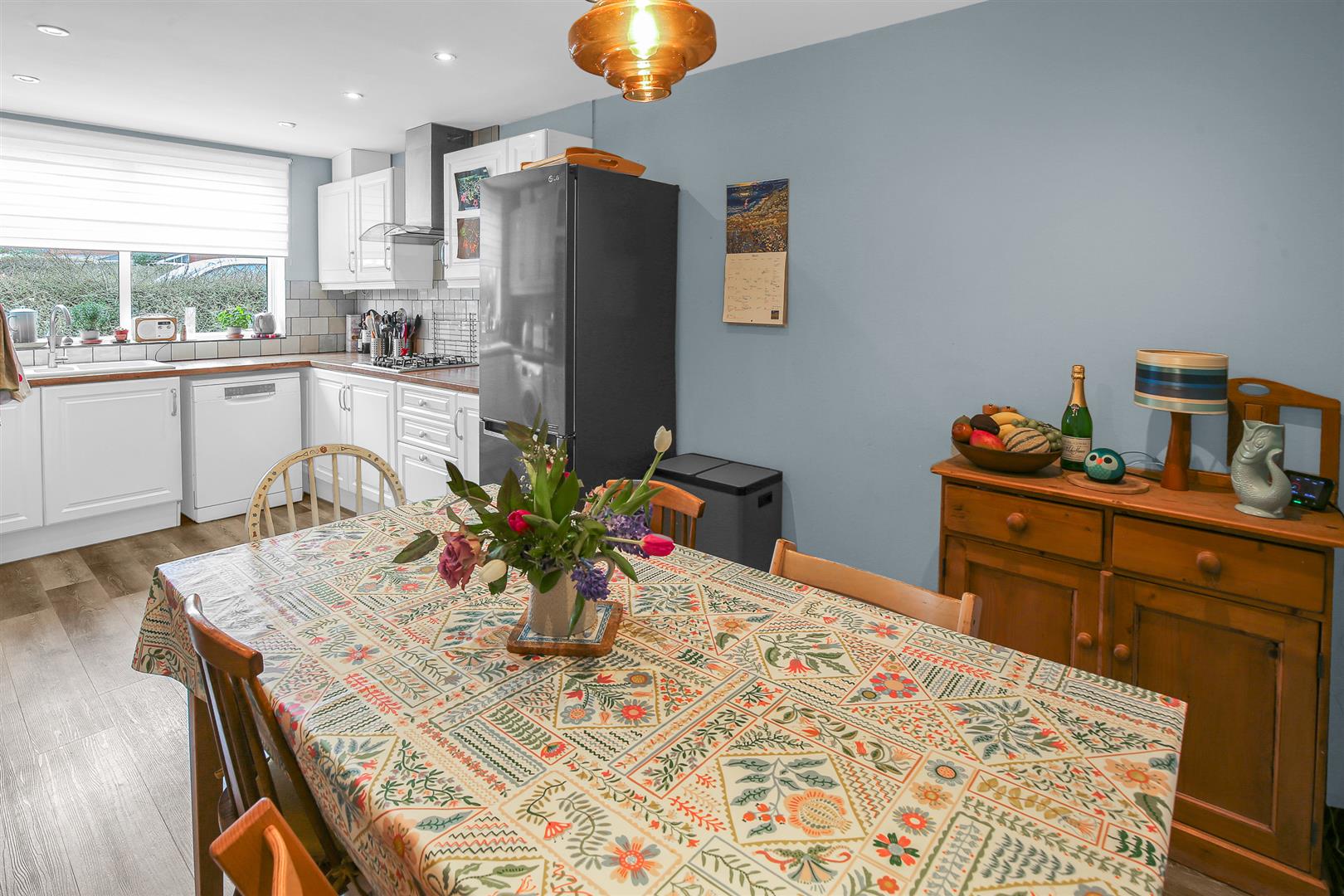 The kitchen/dining room is a large room by any measure at well over eighteen feet long and is ideally configured to make the very best use of the generous space available, with a large front facing window almost filling the whole wall doing a great job of keeping the entire room light and bright throughout the day. The front part of the room has been neatly planned as the working kitchen area, and enjoys a comprehensive array of wall and floor mounted cabinets lining the perimeter. There is ample storage and food preparation worktop available, along with a selection of integrated appliances that include a double oven and gas hob with extractor unit above it. Additional free standing appliances are well catered for by a number of designated spaces included in the layout, and there is a lovely tiled splashback all around the wall in a variety of subtle pastel colours. The remainder of the room is left as open floor space for you to use in any way that best suits your family’s needs and is certainly easily able to accept a generous dining table and chairs, still leaving space for other occasional furniture if so desired.