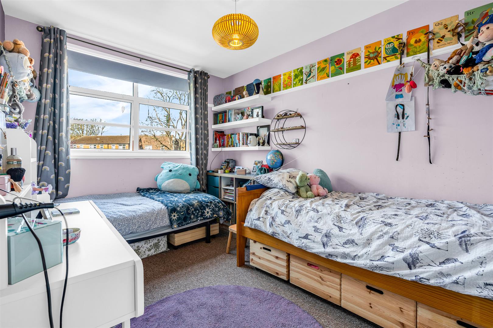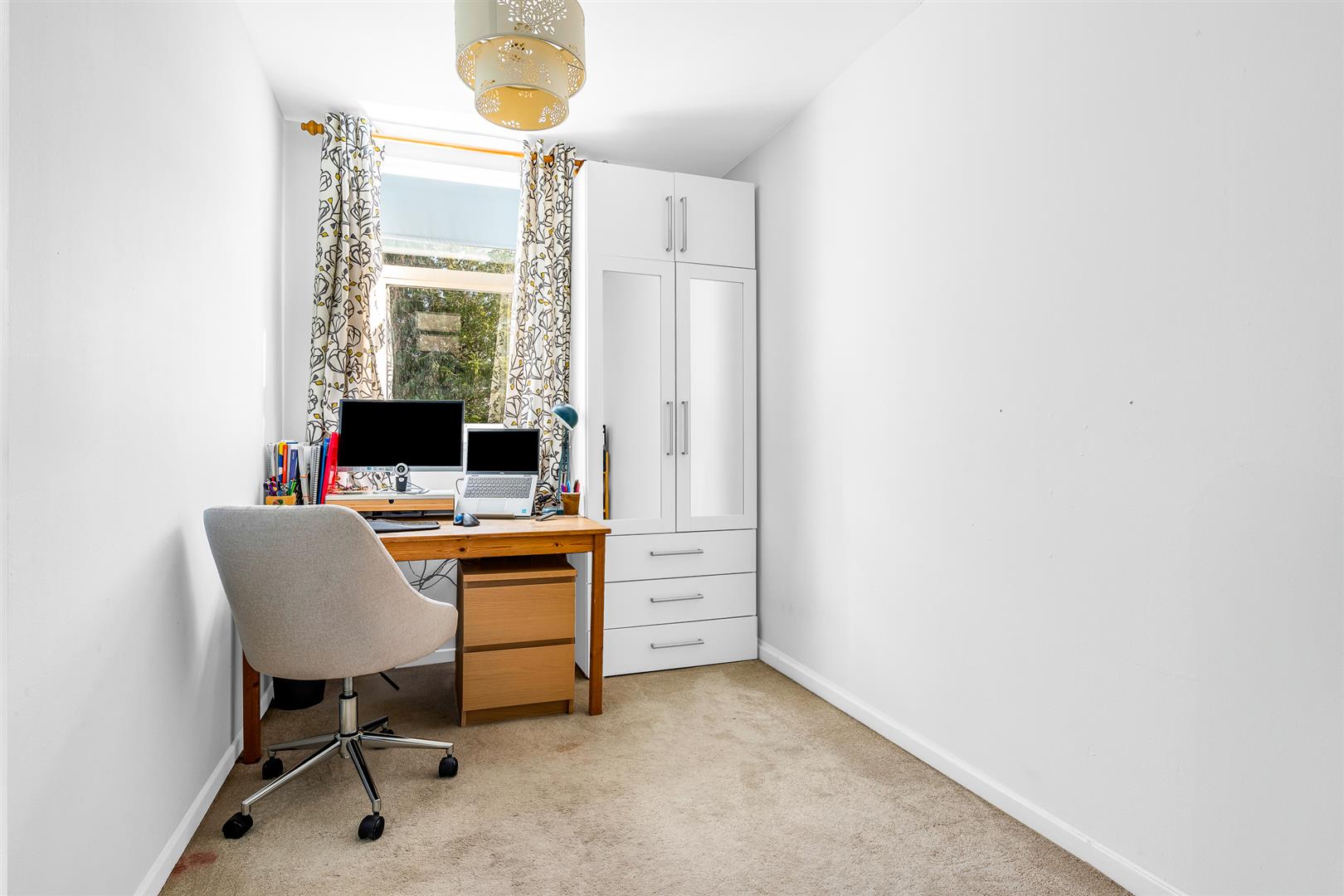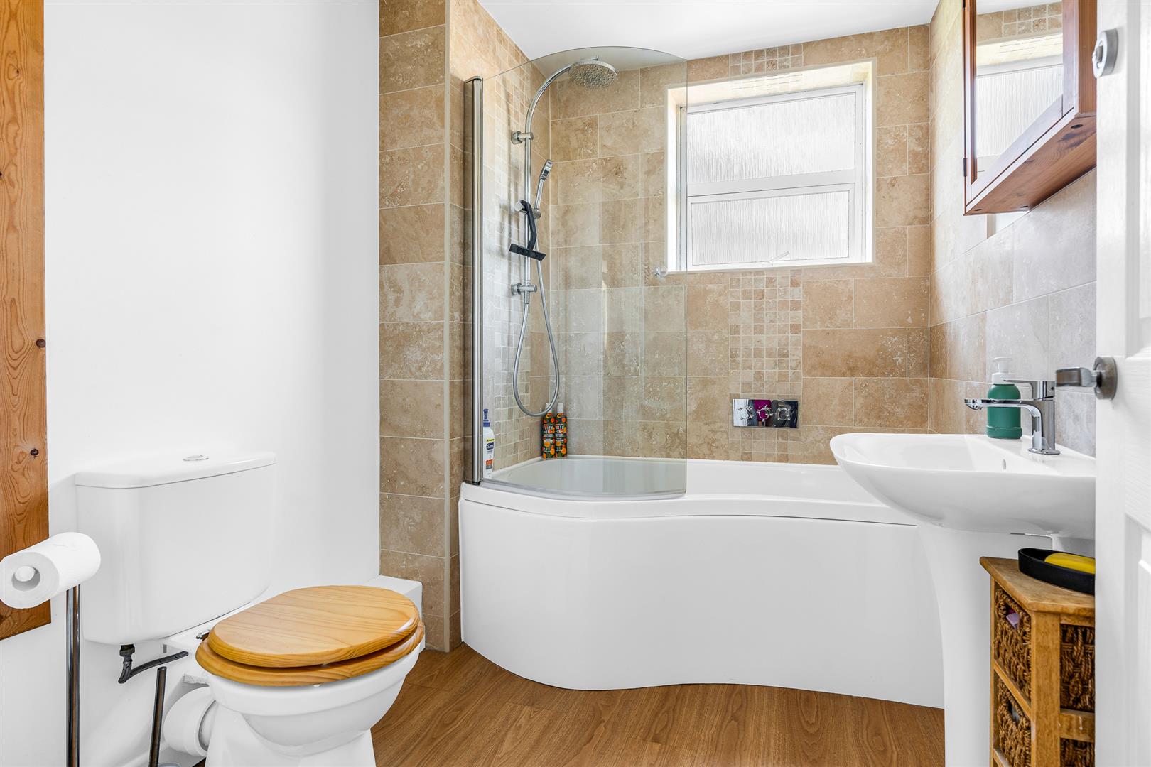 Upstairs, is a pretty galleried hallway that leads to the three bedrooms and family bathroom. Two of the bedrooms have built-in wardrobes, with the principal bedroom also having a separate walk-in wardrobe. The newly-refurbished, spacious, family bathroom is beautifully appointed, with a built-in cupboard, decorative tiling around the walls and a ‘P’ shaped bath with an integrated shower and screen fitted above it.