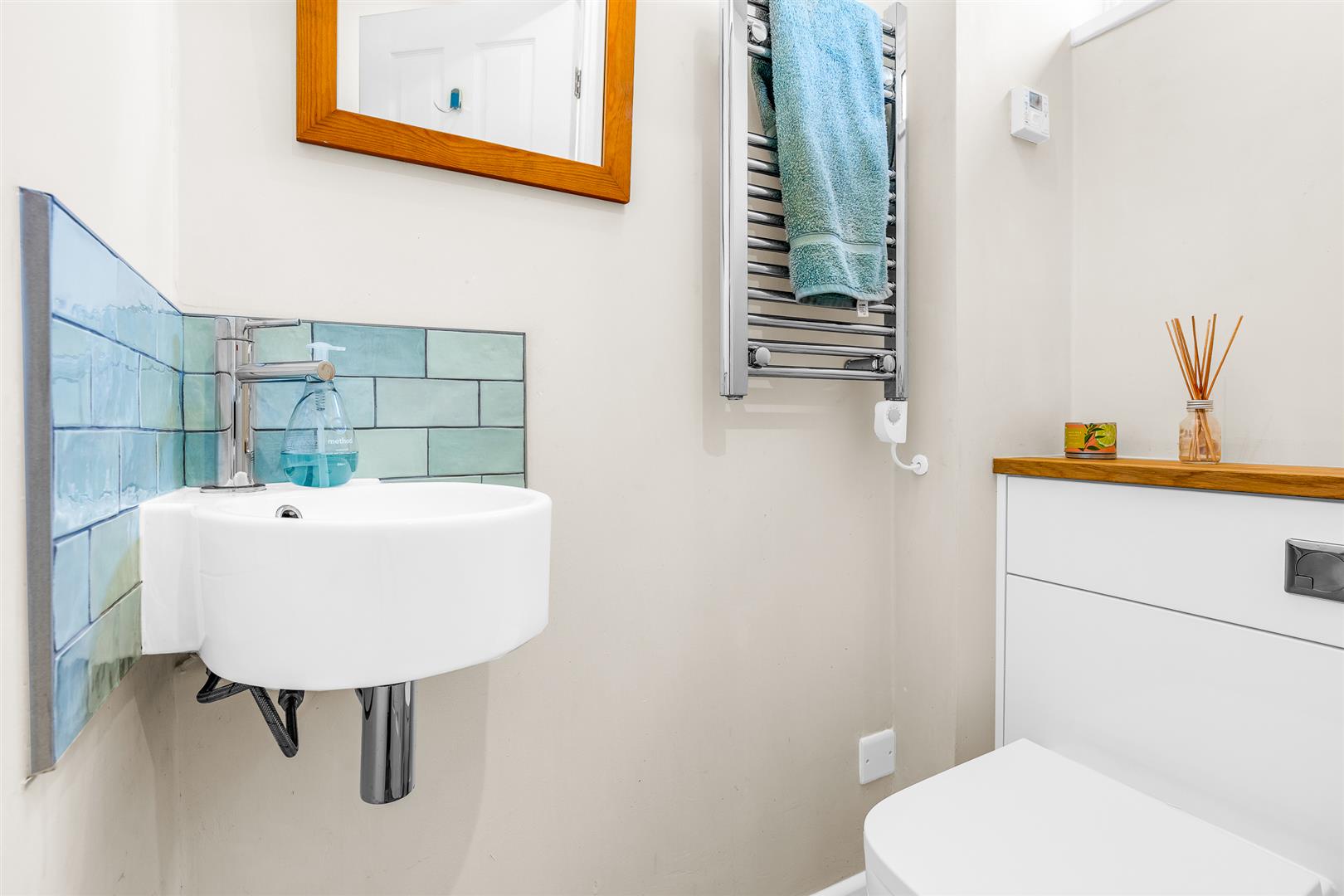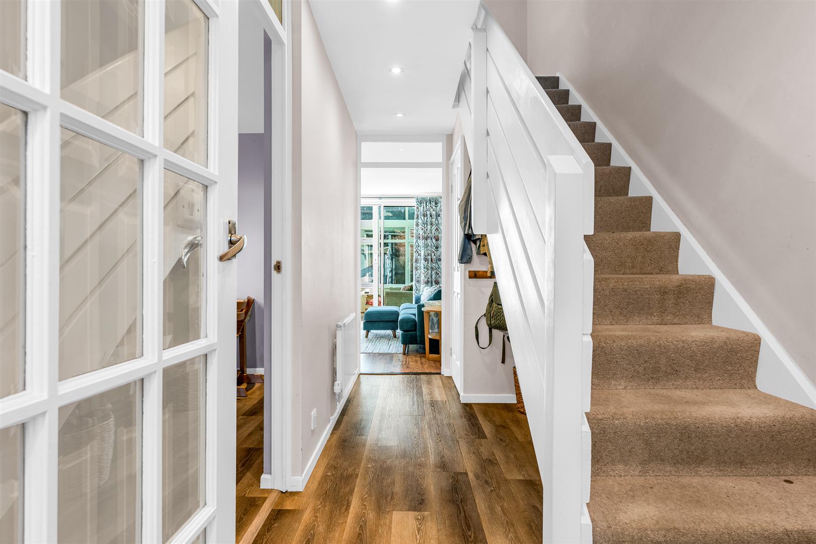 The pretty front door, inset with opaque leaded light windows, welcomes you into a neat entrance lobby within. From here a glass panelled door opens into the main hallway, with an additional door into the ideally placed guest cloakroom which has its own opaque window to the front. The hallway gives access to the smart, modern staircase and the front facing kitchen/dining room, then leads past a useful downstairs storage area and a built-in cupboard before opening directly into the large living room to the rear. The clever planning of the hallway gives it a spacious open feel that is accentuated by the extended view along its full length that continues through the living room and conservatory to the garden beyond.