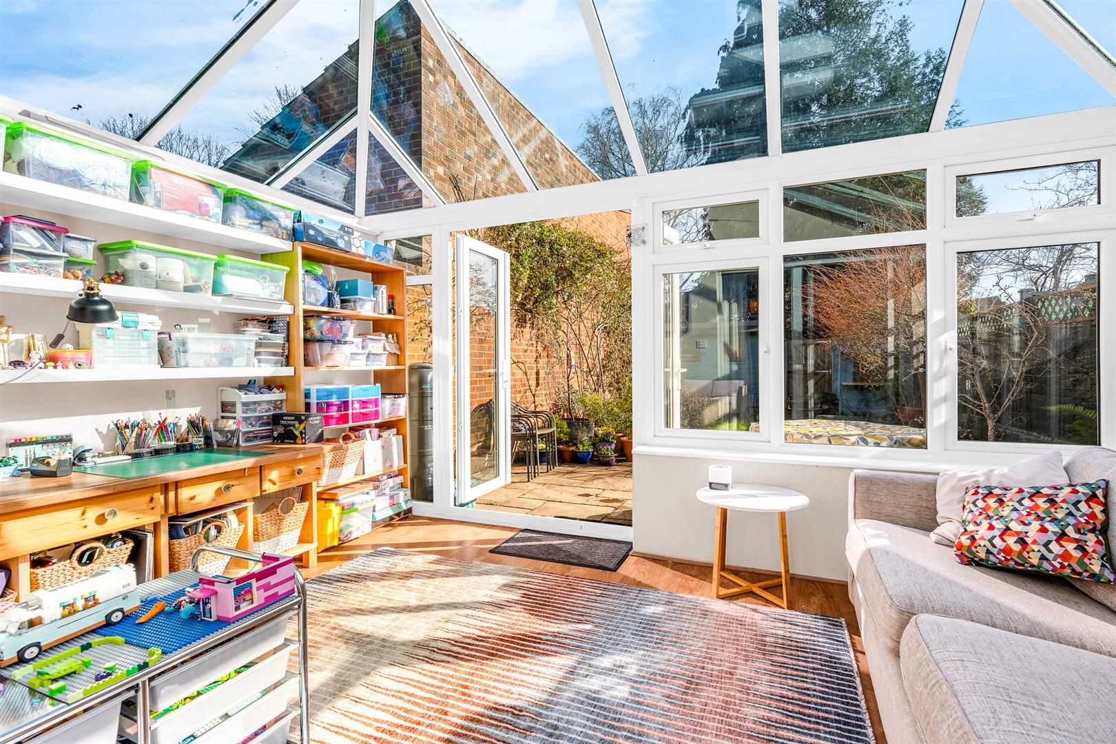 The conservatory is a wonderful addition to this already spacious and flexible home. It is a top quality installation that pretty much runs the full width of the house, fitted with multiple opening windows and glass double doors that combine to allow full temperature management throughout the day as well as easy access out into the garden. This really is a fully usable room all year round, and could cope with any number of functions you may need, ranging from a dining room to an office, playroom, games room, arts and crafts studio or just a lovely family room.