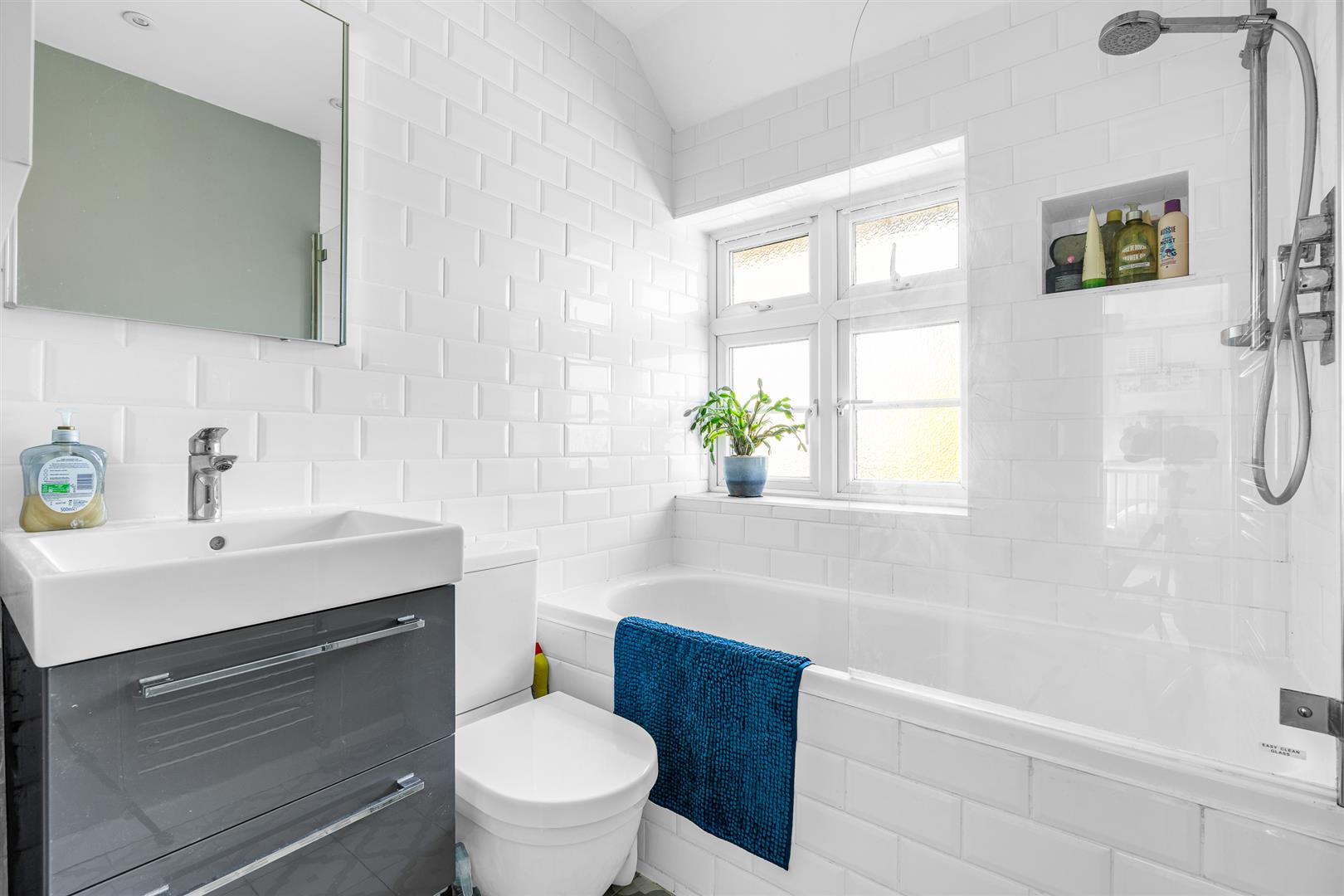 Upstairs are the three bedrooms and family bathroom. Two of the bedrooms are large doubles, one of which has a super fireplace, a large set of fitted wardrobes and an attractive ceiling fan. The bathroom is fully tiled and has a fresh, white suite installed, which incorporates a cupboard under the sink along with a shower fitting and screen over the bath.