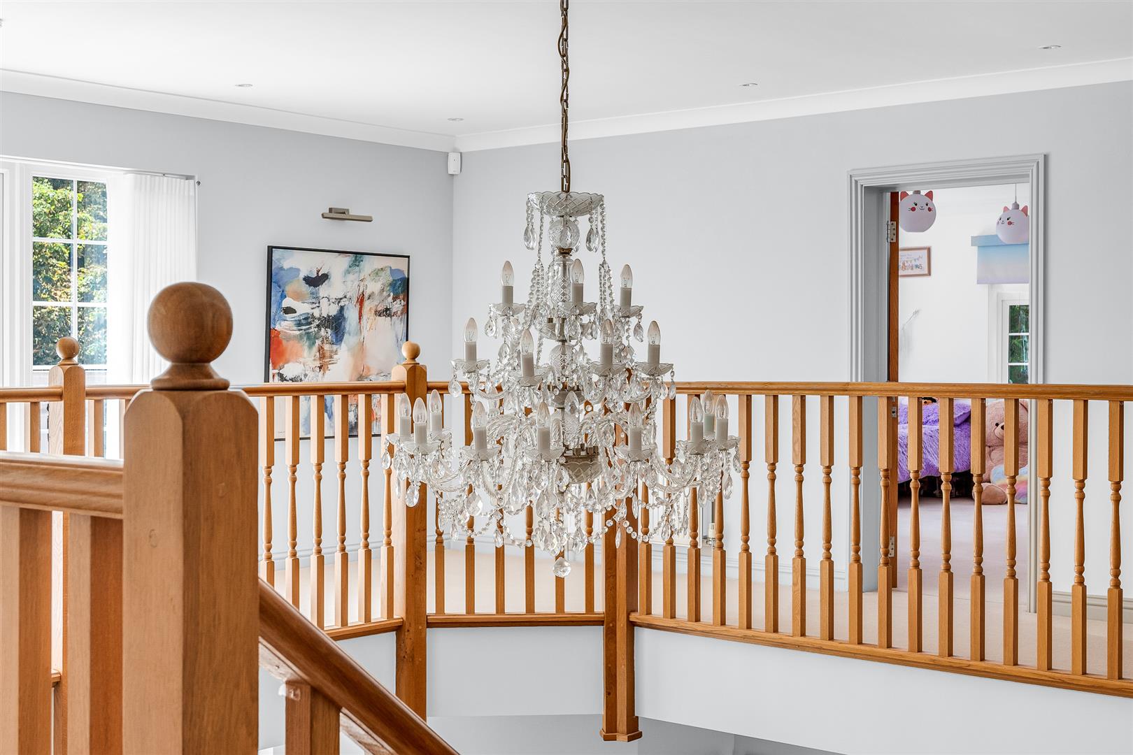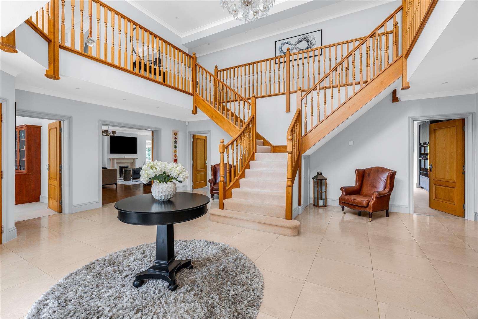 Inspired architectural design has placed the house perfectly into the natural topography of the grounds, allowing the ground floor living rooms to open directly out onto the rear patio, whilst enabling windows to grace the front of the basement level. This also provides a fabulous opportunity to instil grandeur into the front of the house by creating a glorious staircase rising up to the imposing and attractive double doors, set beneath a beautifully curved, pillared first floor balcony. Inside, your first impression will be repeated throughout the tour, epitomised by the dramatic visual impact of the entrance hall. This is a beautiful house with clean, modern lines, exhibiting the very pinnacle of contemporary design and faultless craftsmanship through the perfect management of an abundant light and space. This property has been carefully thought through to provide exemplary living areas arranged in a manner that gives the best service to you, your family, and any guests. The entrance hall has a real WOW factor, yet remains a comfortable, welcoming space, with the imposing staircase dividing part way up to join the full 360' gallery that graces the first floor landing. Substantial glass doors and windows lead out onto the front facing balcony above, which along with the textured full height windows that flank the main entrance doors, ensure the entrance hall is wonderfully illuminated. The porcelain tiled floor extends around the bottom of the stairs and along to an inner lobby that has a separate external door to the side, and leads into a well placed boot room at the rear which opens directly out into the rear garden. Within the main entrance hall there are doors through to the family room, study/office and kitchen/dining room, as well as double doors opening into the drawing room. Either side of the main entrance is both a useful cloaks cupboard and a conveniently located guest cloakroom.