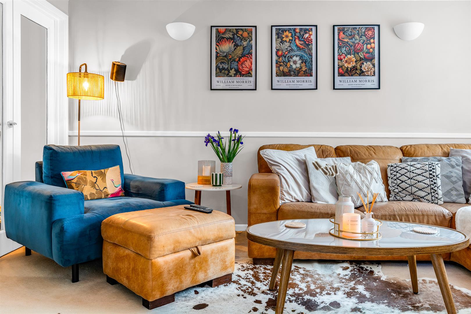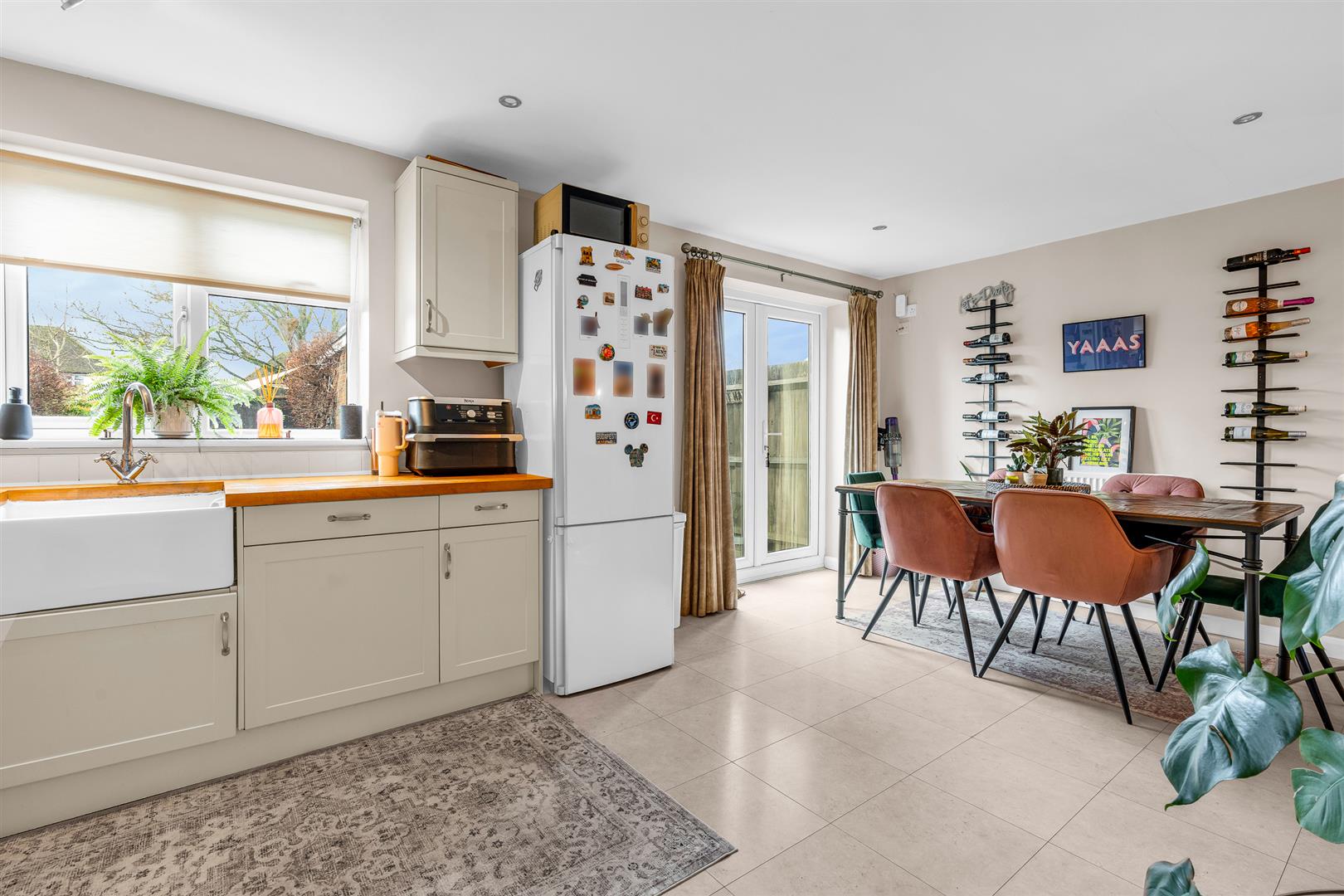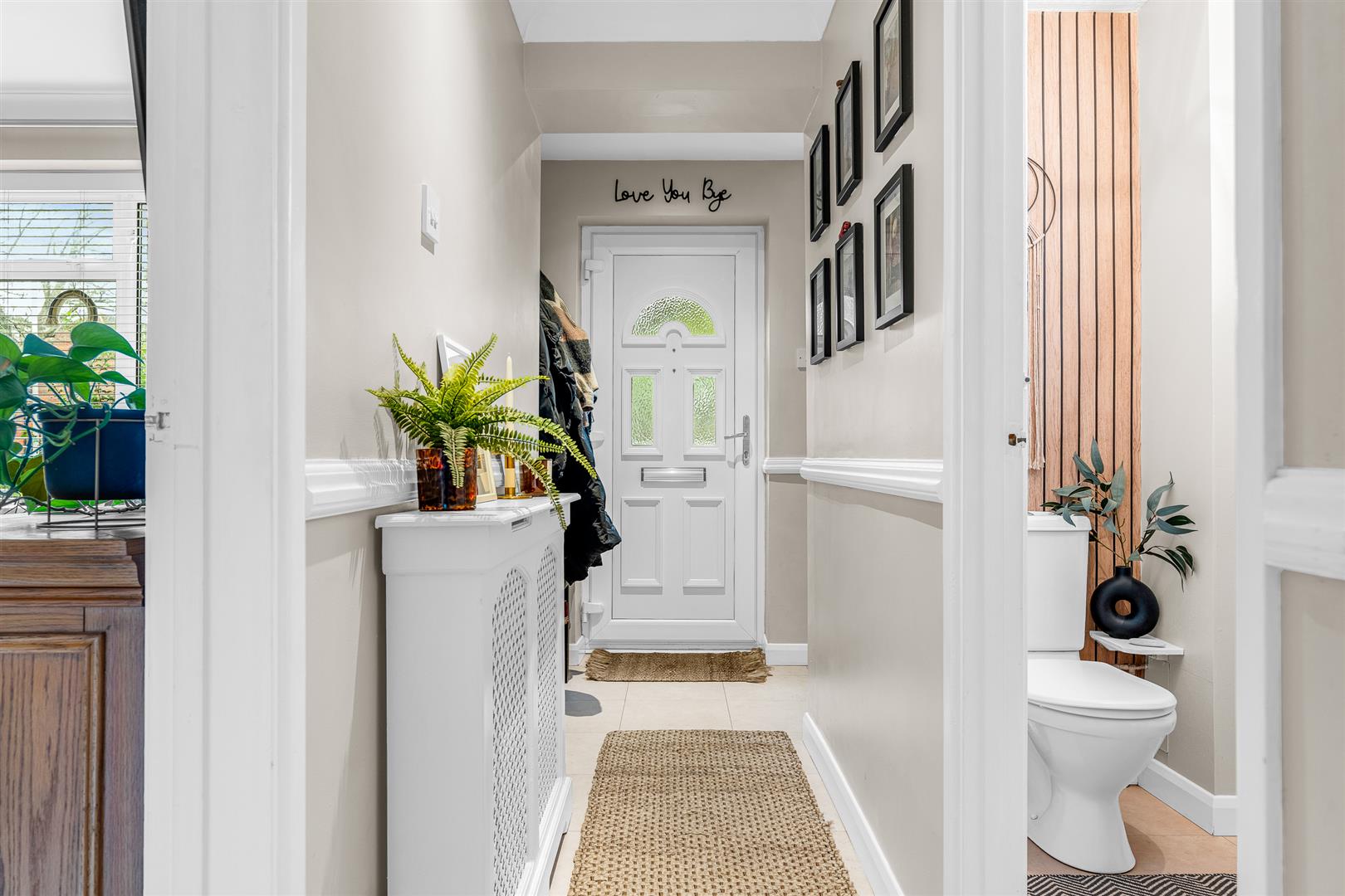 The pretty front door, inset with a number of patterned glass panels, opens into a nice entrance lobby that boasts its own front facing window, before leading through to an inner hallway that passes the door to the living room and a separate guest cloakroom before opening into the large kitchen/dining room beyond the stairs.