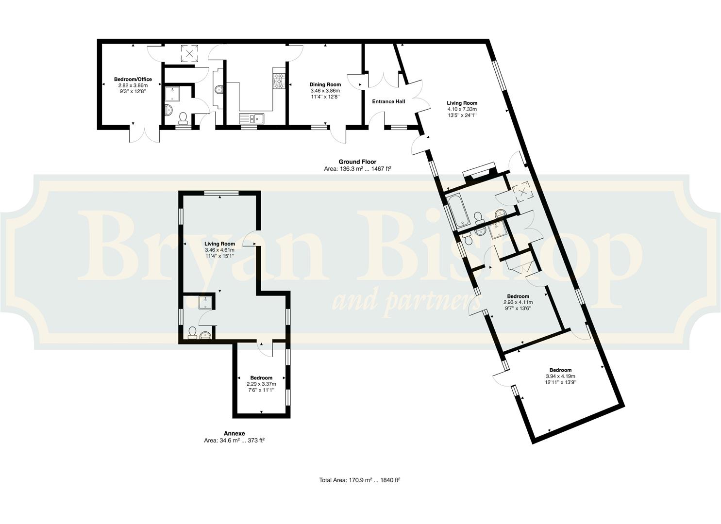 Within the garden is a brick-built annexe, again a conversion of part of the original farm buildings and likewise arranged on a single floor. A substantial living room benefits from windows to three separate aspects and extends into a recess which would comfortably accommodate a kitchen/dining area. There is also a separate shower room and a good sized bedroom.