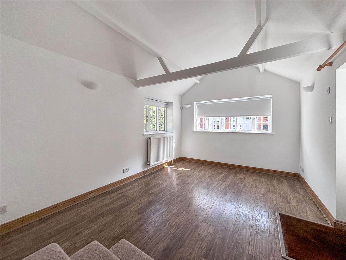 Fully glazed double doors lead off to the right from the hallway into the large living room. This is a generously sized room by any measure, at over twenty-four feet long, and is bathed in natural light from the windows set into opposite walls, as well as the doorway opening out onto the inner courtyard. The solid wood floor and a feature wood burning stove, bring a real charm and warmth to the room, along with the braced wooden door that leads to the inner hallway.