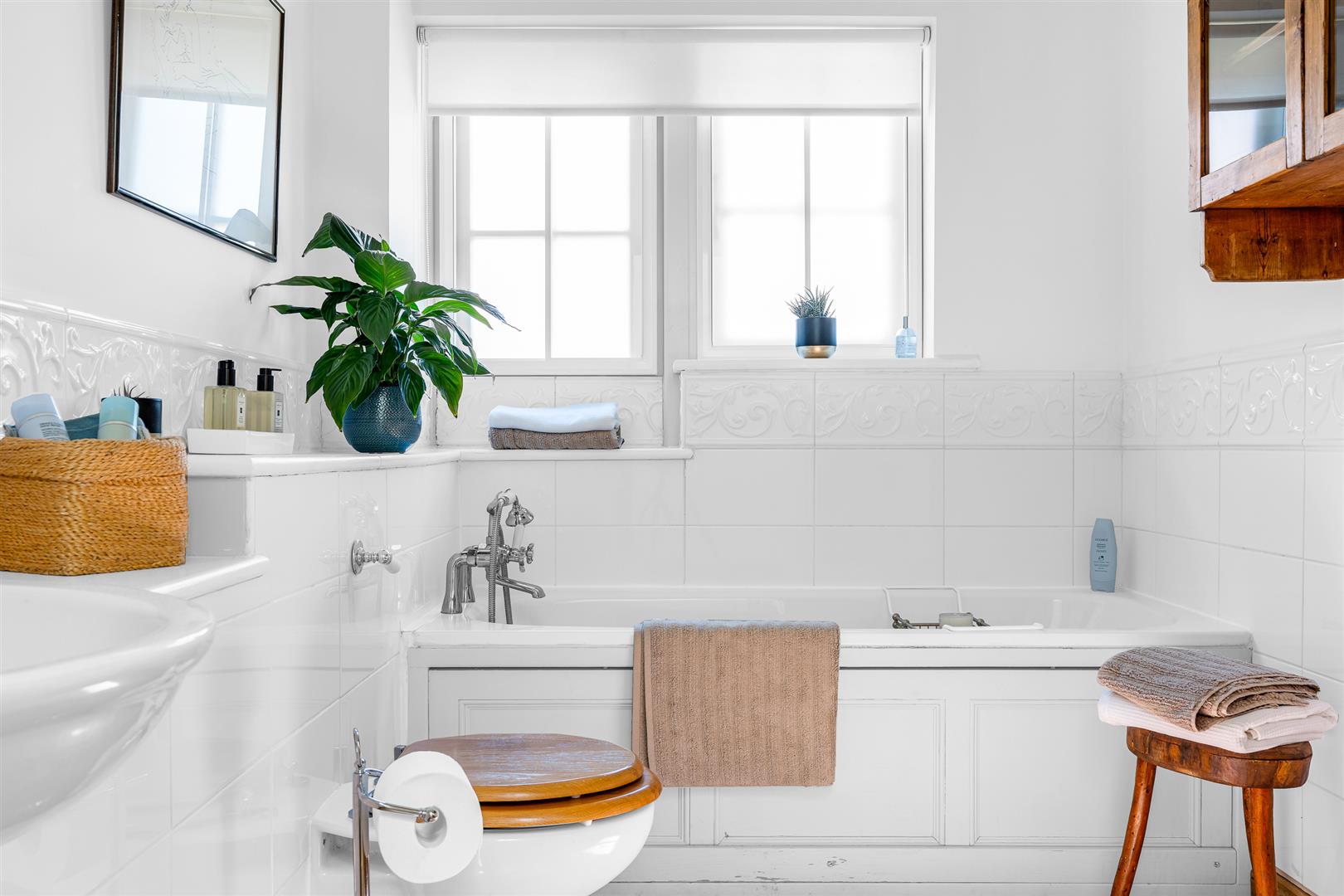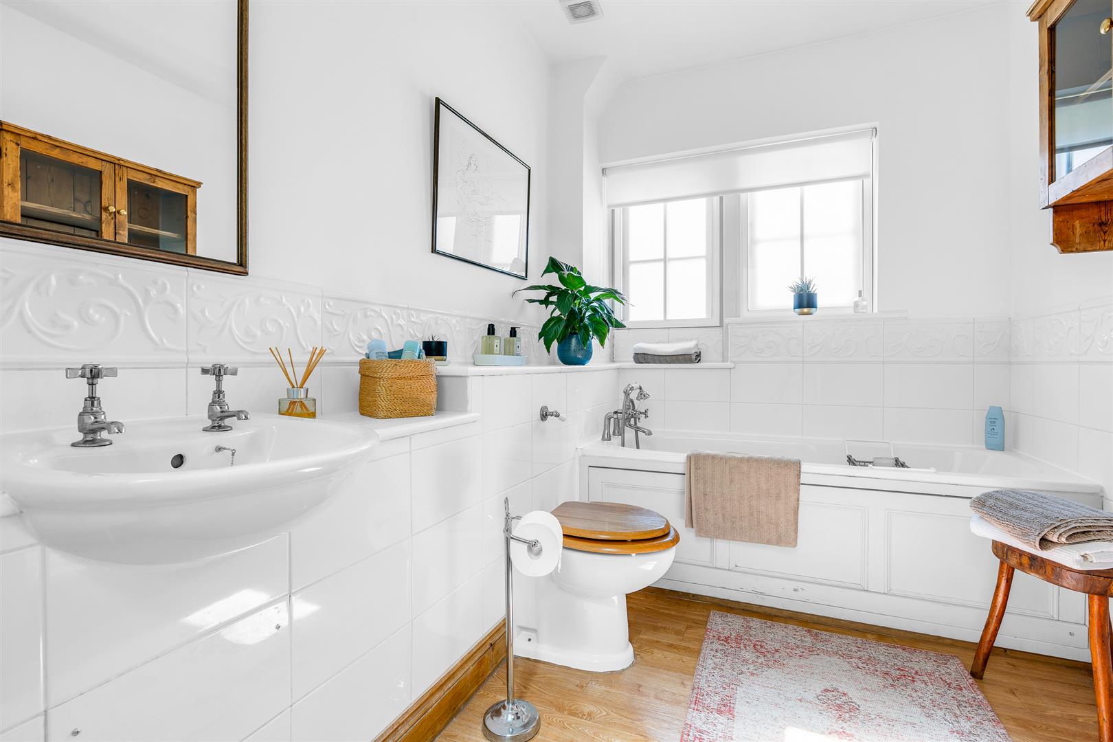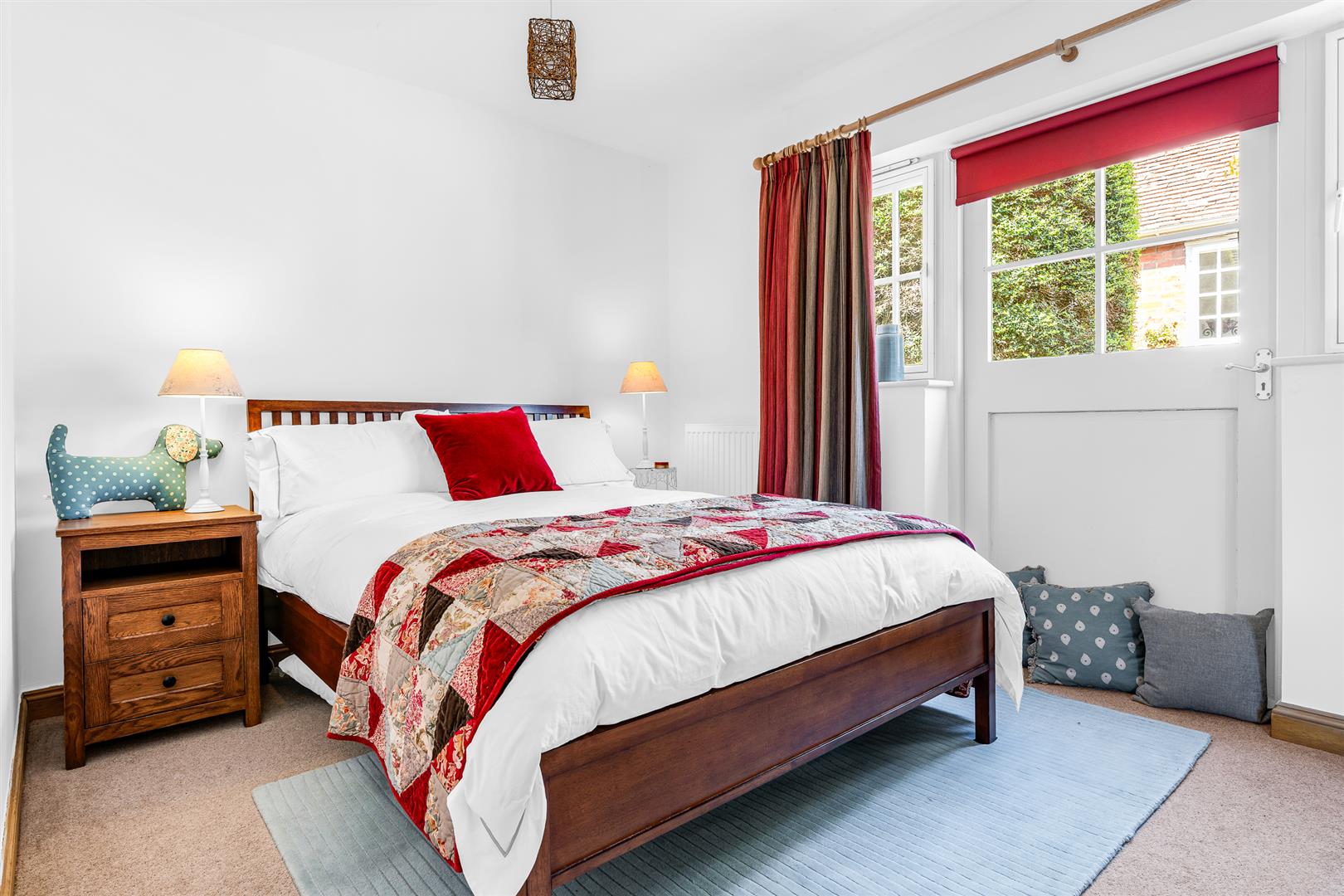 Beyond the living room the hall runs along the outside of the property, leaving all of the rooms overlooking the garden to the inside. There are two substantial bedrooms, comfortably doubles in size, both of which have external doors within them, and a generous family bathroom with a bath fitted with a shower attachment. One of the bedrooms also boasts a neat en suite shower room.