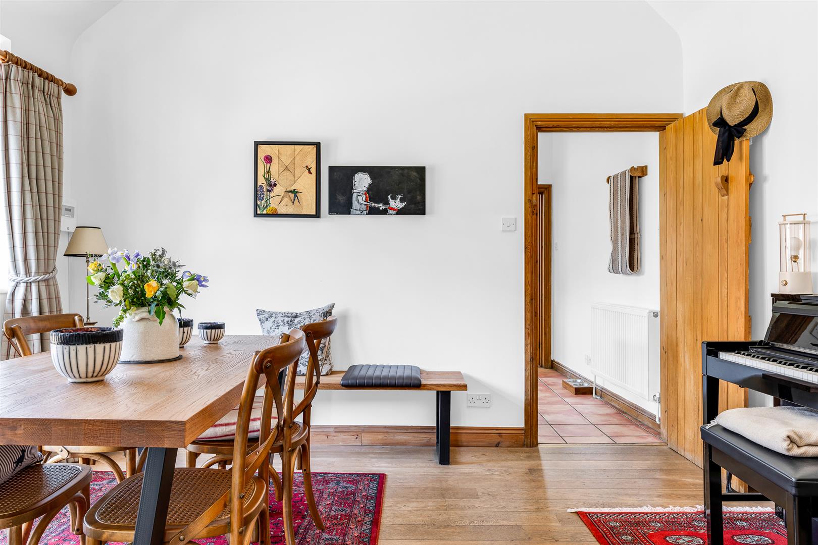 On the other side of the main entrance hall is the lovely dining room. Abundant light floods in through the window and fully glazed door to the courtyard, making this well proportioned room a warm and welcoming place to eat as a family or to entertain guests. It is easily spacious enough for a substantial dining suite and other occasional furniture besides, and ideally located adjoining the kitchen.