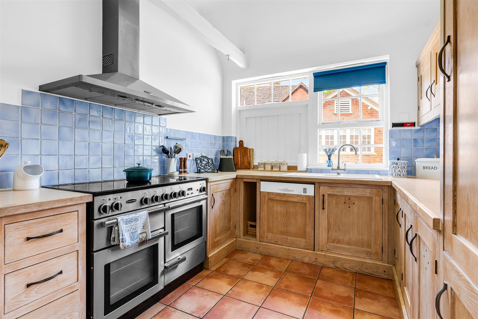 The kitchen is fully fitted with a range of wall and floor mounted cupboards ensuring ample storage, as well as a full complement of integrated appliances and appropriate floor space for a double oven range style cooker. Natural stone floor tiles are both practical and appealing, nicely complementing the light blue tiled splashbacks.