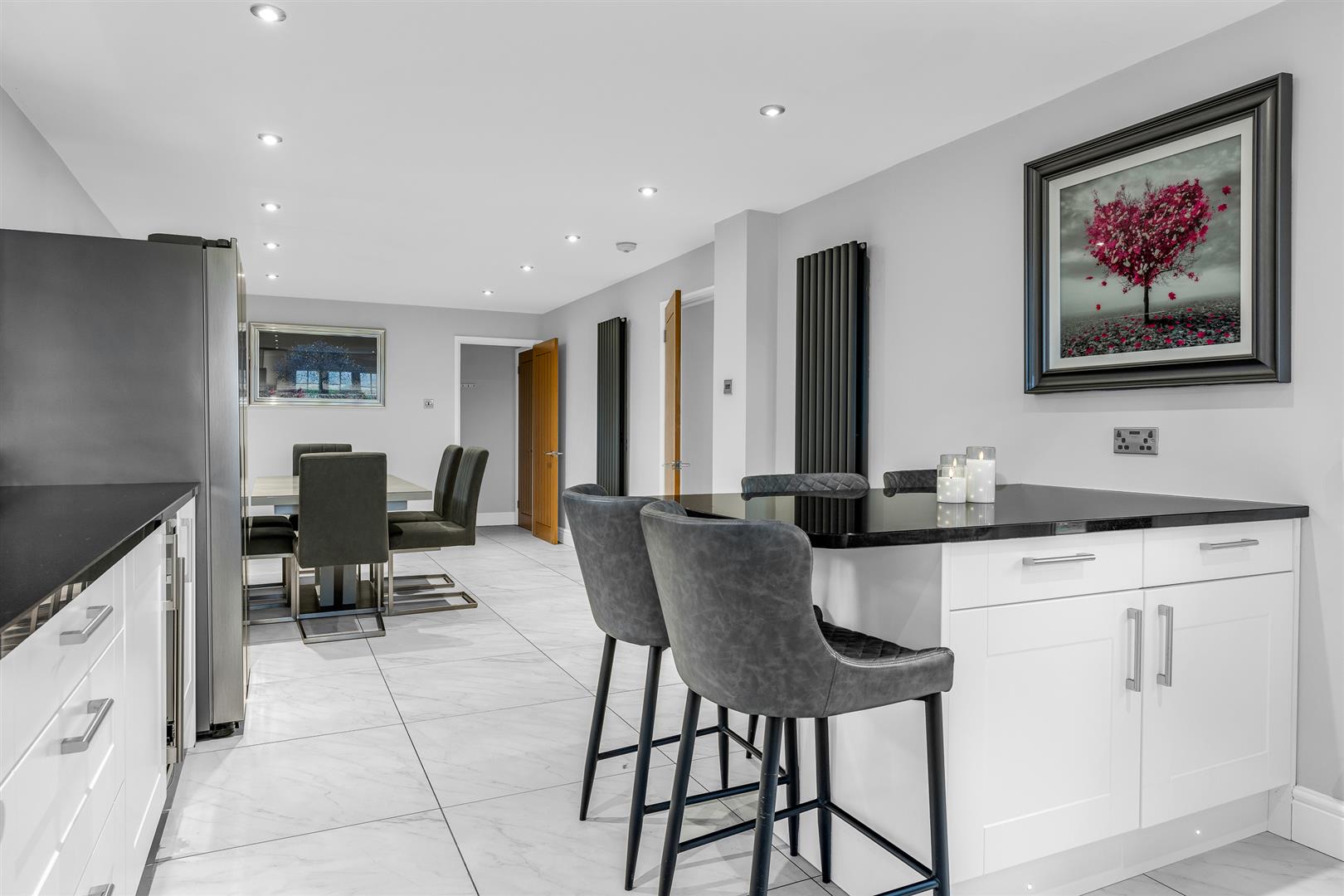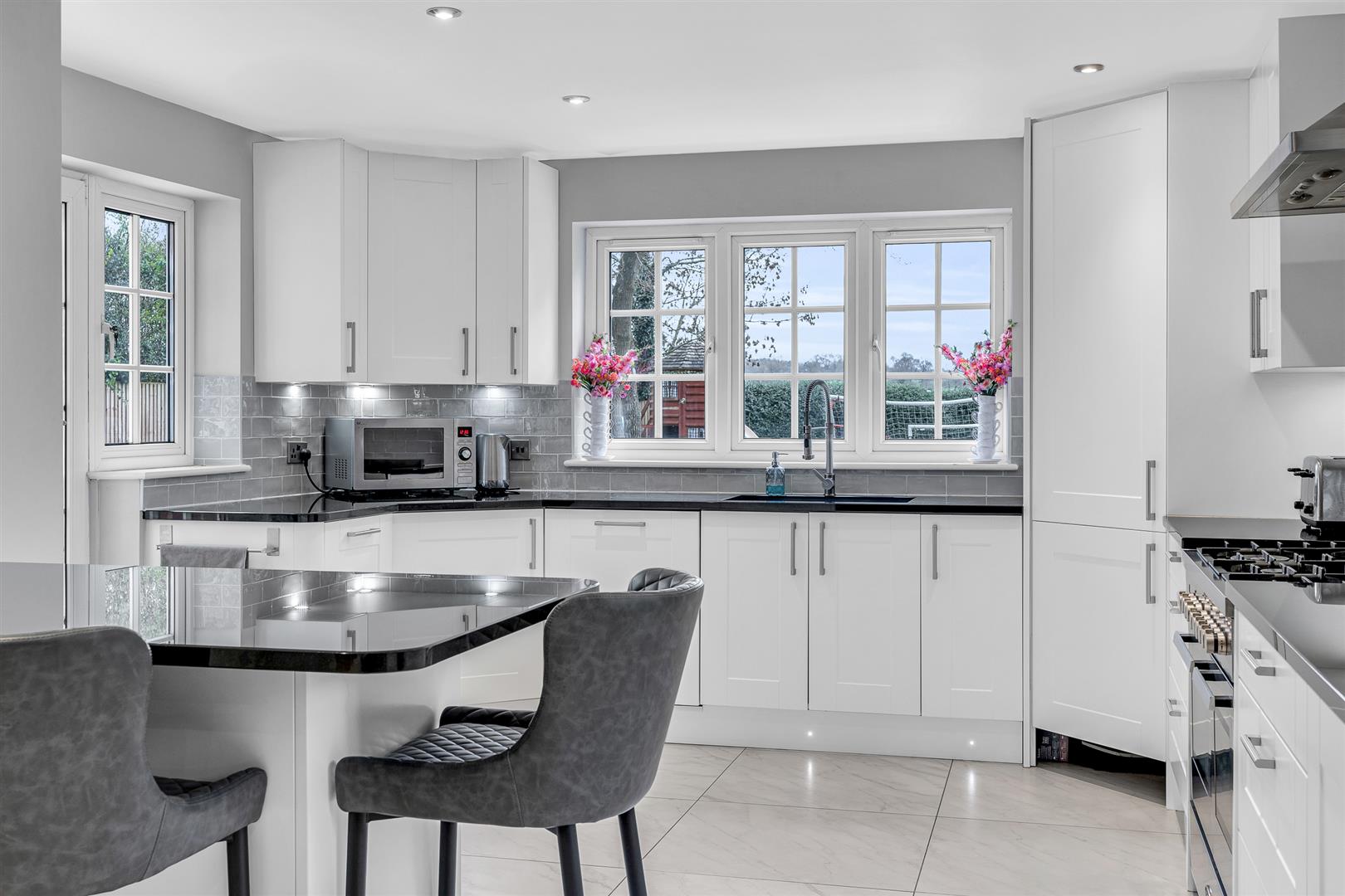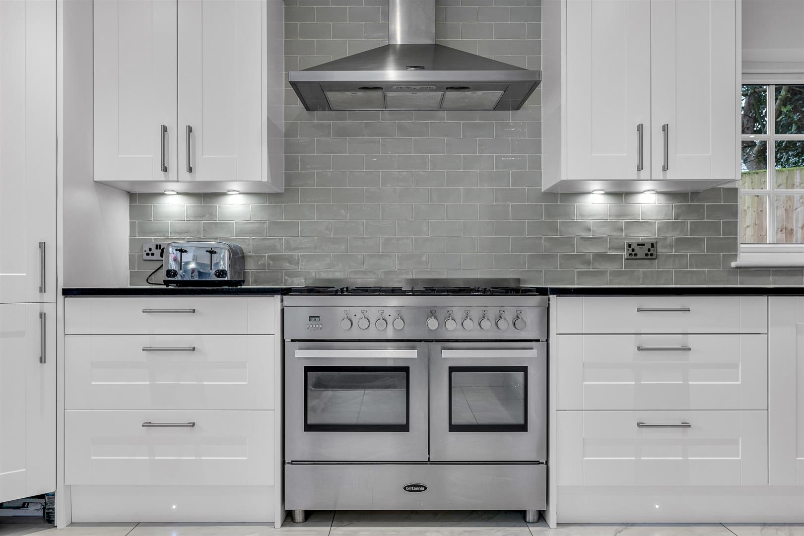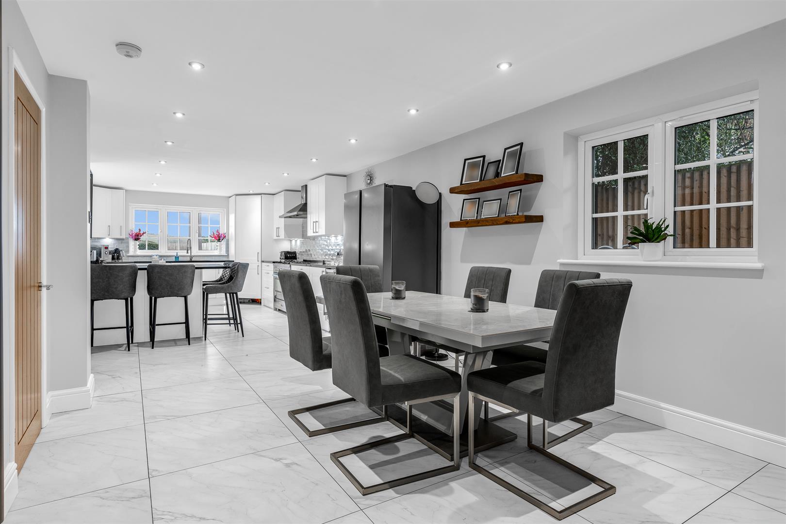 The whole of the rear corner of the house is taken up by the superb kitchen/dining room, which extends to nearly thirty-three feet in length and provides a useful exterior door opening out into the rear garden. Despite its great size the room is flooded with natural daylight through no less than four separate windows arranged across three separate aspects, ably aided by the clever choice of gloss white cabinets and light coloured tiles that cover the floor. Just over half of the room is laid out as the working kitchen area, a substantial space that has a comprehensive array of wall and floor mounted cupboards lining the perimeter, guaranteeing that you will never run short of storage space or food preparation worktop area. Boosting both of these elements even further is a smart island extending out from one wall, which offers a neat visual delineation of the separate parts of the room whilst at the same time providing a fabulous breakfast bar. Integrated within the cabinets is a complete collection of premium branded appliances, with designated spaces allocated to accept the larger free standing items. The remainder of the room is left as open floor for you to use however best suits your lifestyle. Certainly there is ample space for a generous dining suite and other occasional furniture, along with some casual seating if so desired, still leaving a free flow around the room. The kitchen is supported by the adjacent utility/laundry room, which has its own side facing window and is fitted with cabinets that coordinate with those used in the kitchen. From the utility room there is an internal door opening directly into the double garage, making that a really practical space that can be easily used as a part of the main house.