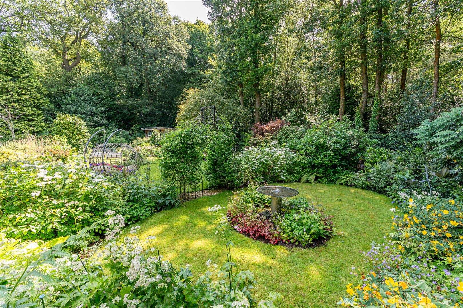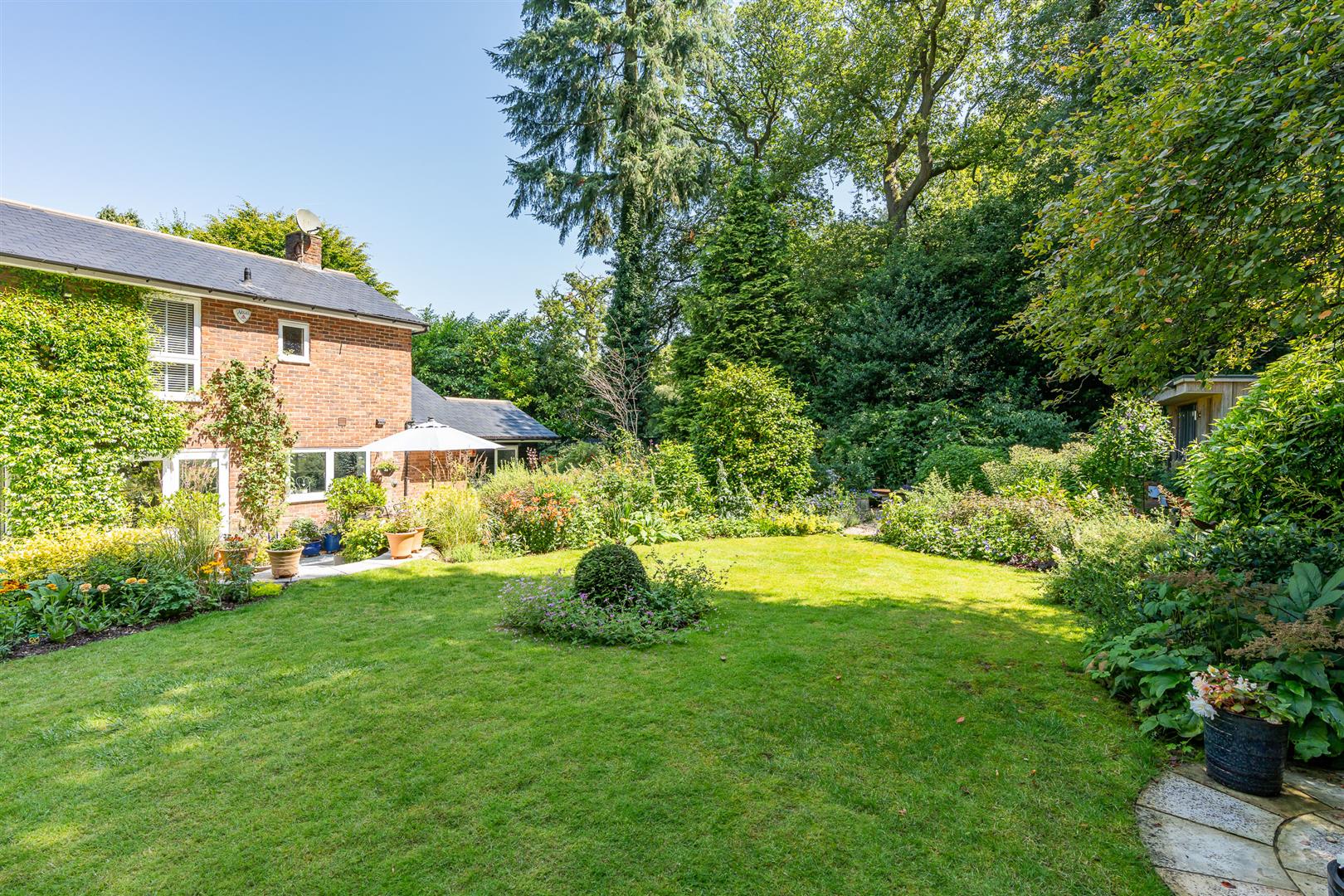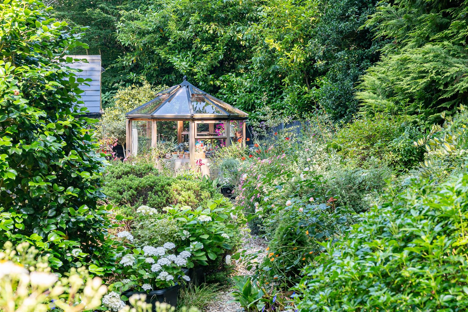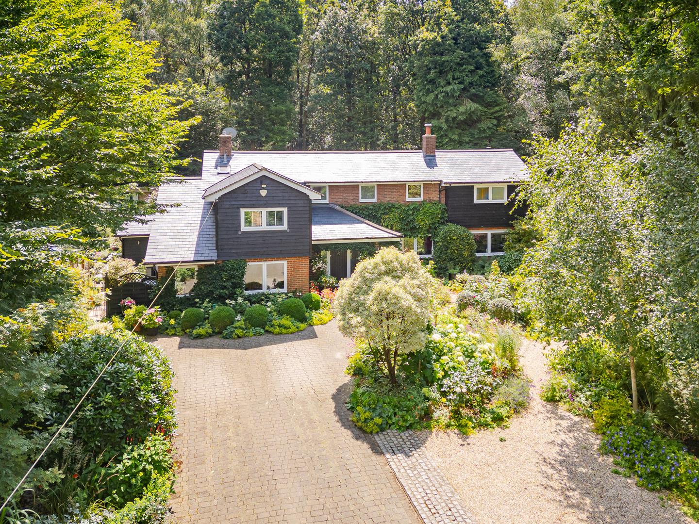 Secure, gated access opens onto an oasis of green, with the front of the house enjoying beautifully orchestrated planting of shrubs, bushes and specimen trees alongside the garage and driveway,and all around the property. The large block paved driveway opens out onto the frontage of the house providing plenty of guest parking over and above the garage and additional parking area adjoining it. To the side and rear, the house is surrounded by a carefully curated cottage garden on a grand scale. Deep borders sport an incredible variety of plants and flowers, with separate independent patios and lawns joined up by woodland walkways and arches to give a lovely feeling of being in different "rooms" within the garden, enhanced by an attractively shaped greenhouse and a stylish water feature. All off this is topped off by the beautiful natural woodland as a perfect backdrop. This really does feel like a modern luxurious house has been dropped into the middle of an enchanted forest.