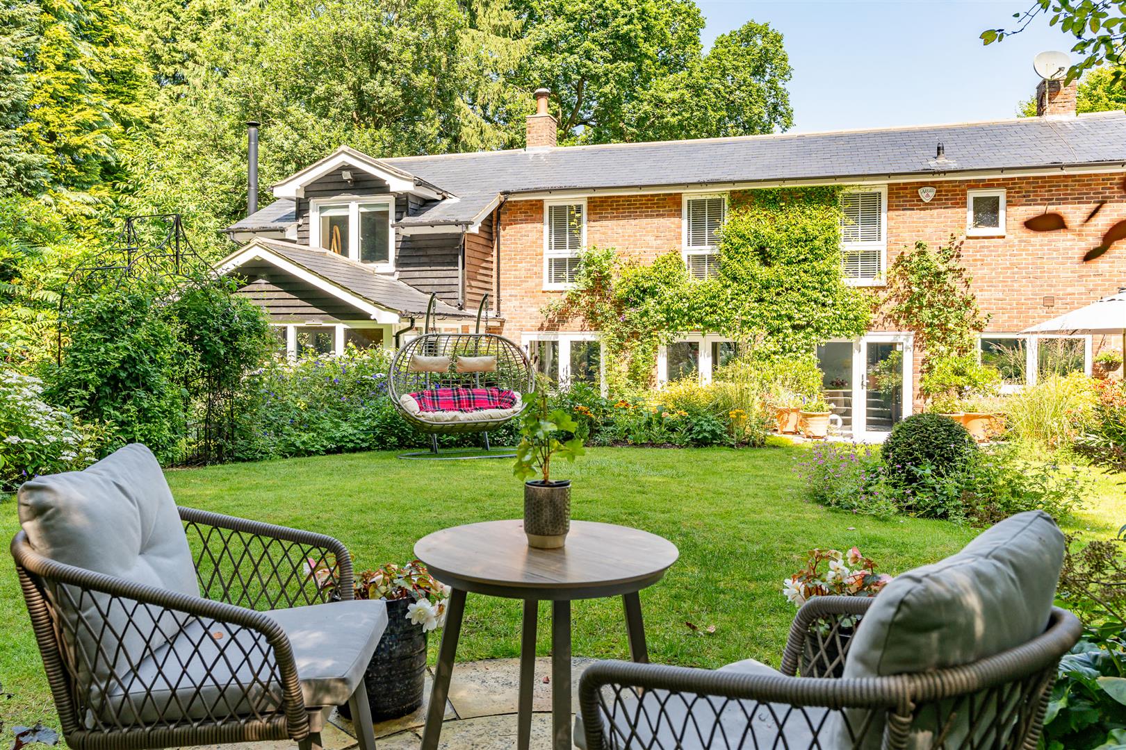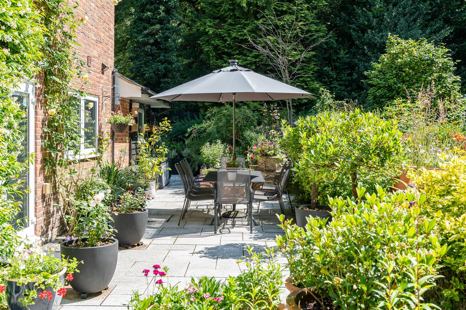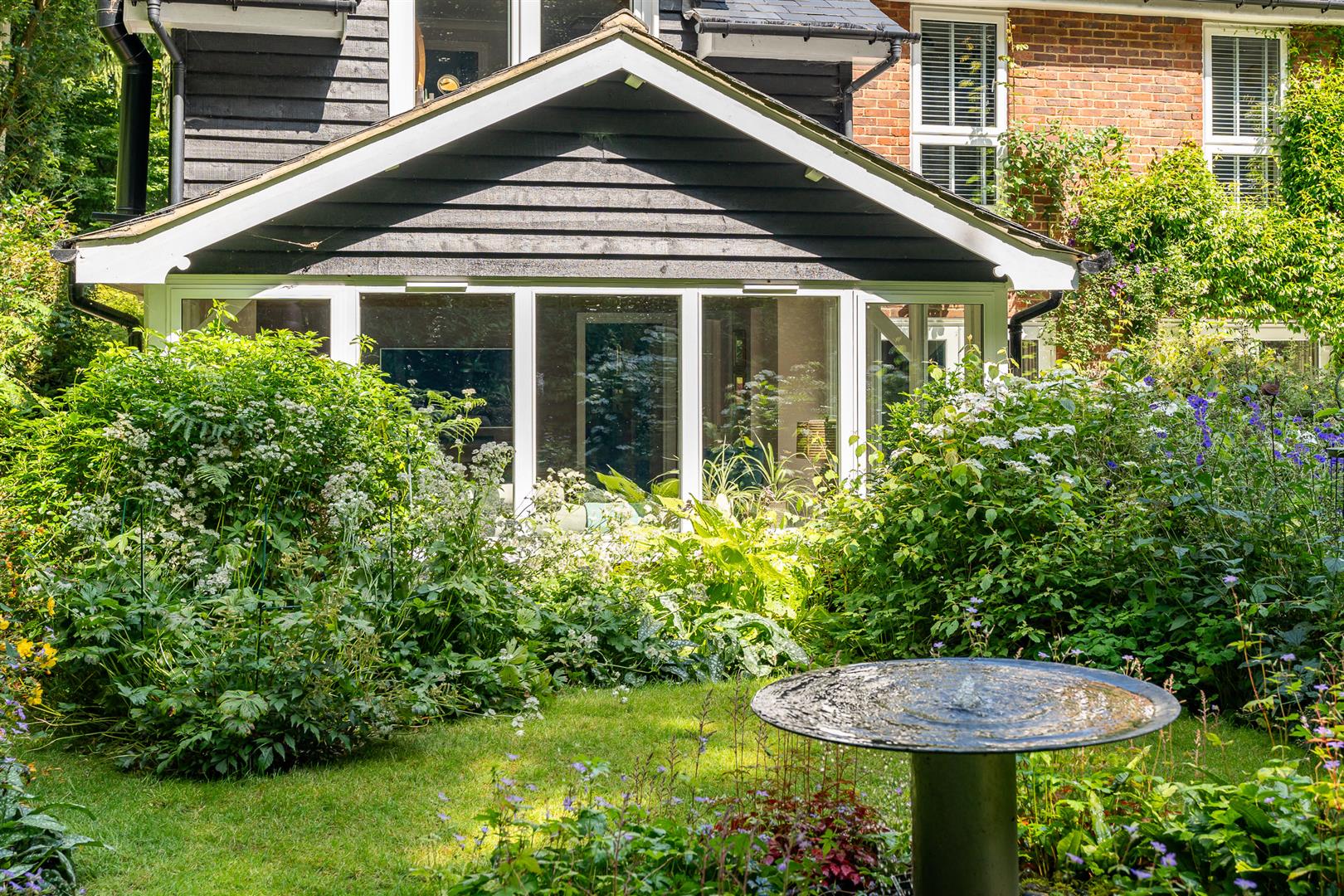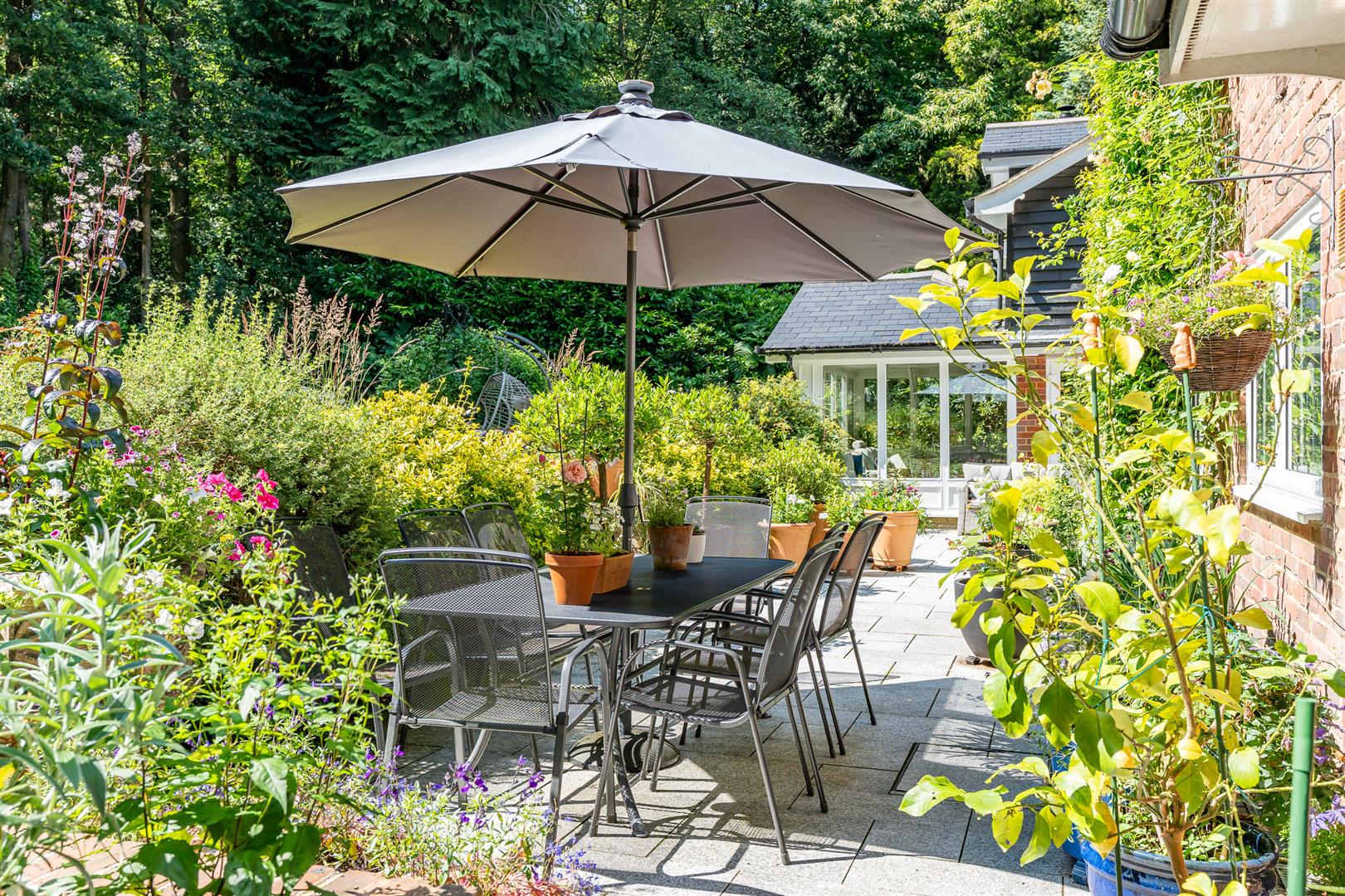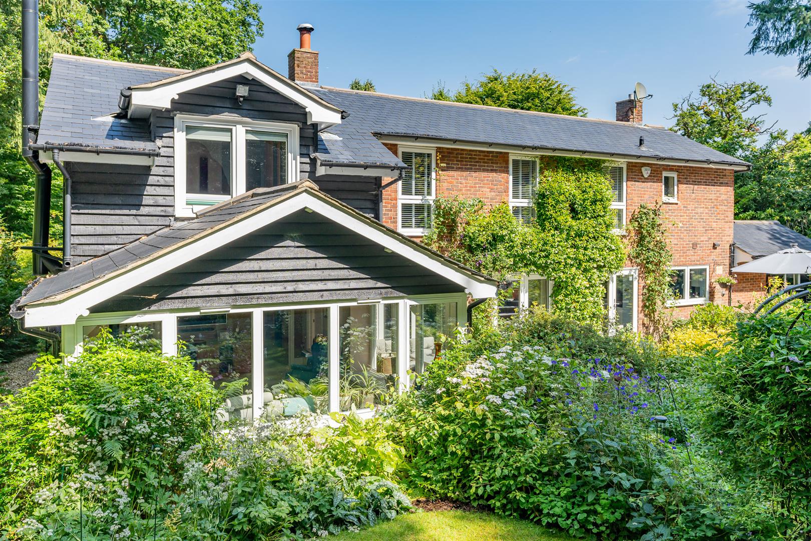 Secure, gated access opens onto an oasis of green, with the front of the house enjoying beautifully orchestrated planting of shrubs, bushes and specimen trees alongside the garage and driveway,and all around the property. The large block paved driveway opens out onto the frontage of the house providing plenty of guest parking over and above the garage and additional parking area adjoining it. To the side and rear, the house is surrounded by a carefully curated cottage garden on a grand scale. Deep borders sport an incredible variety of plants and flowers, with separate independent patios and lawns joined up by woodland walkways and arches to give a lovely feeling of being in different "rooms" within the garden, enhanced by an attractively shaped greenhouse and a stylish water feature. All off this is topped off by the beautiful natural woodland as a perfect backdrop. This really does feel like a modern luxurious house has been dropped into the middle of an enchanted forest.