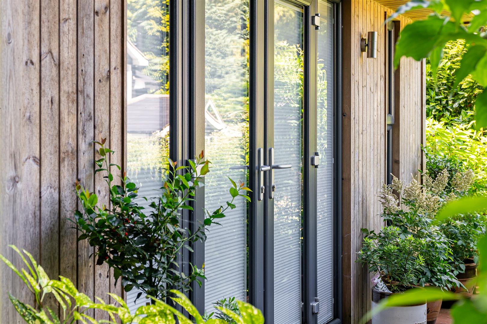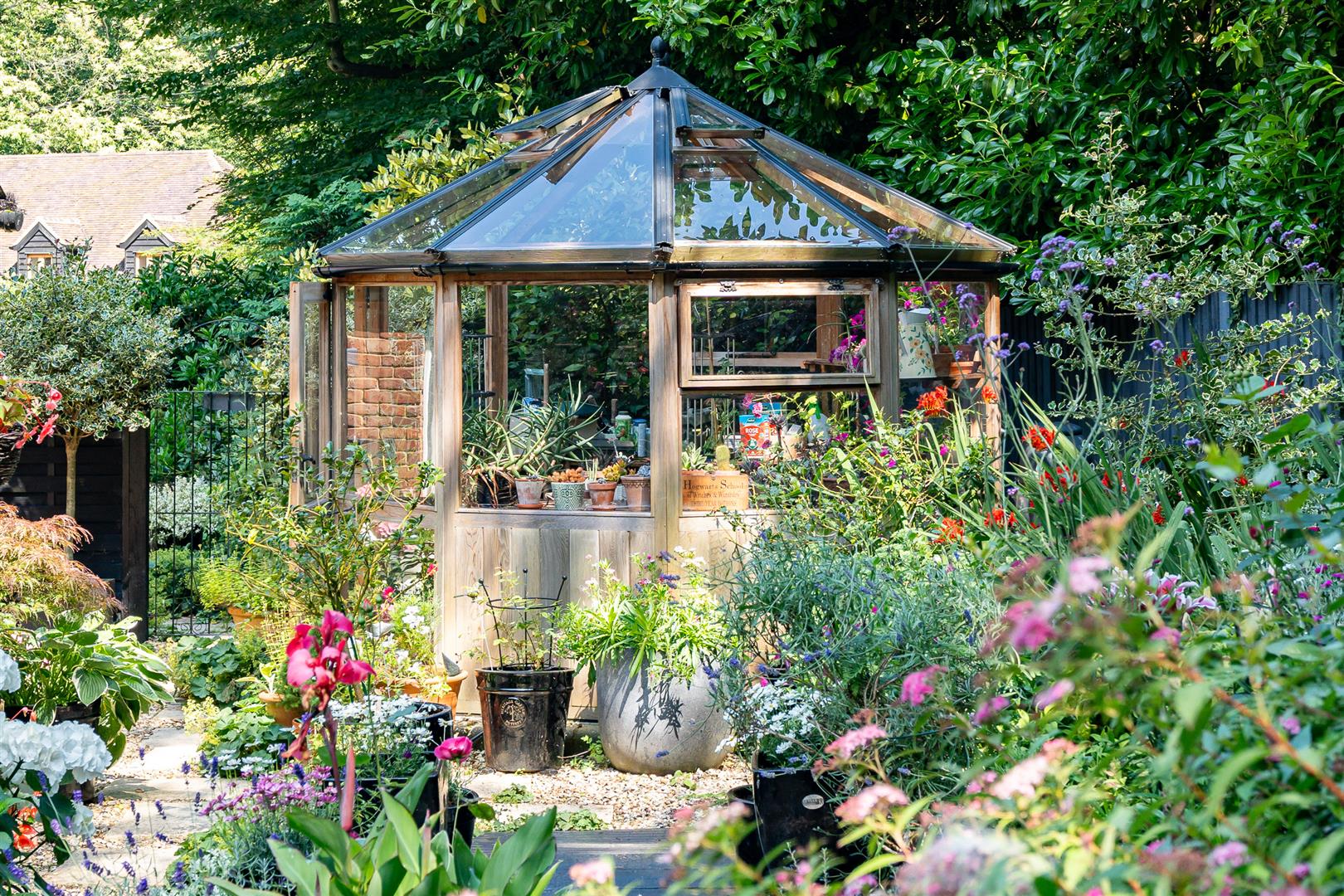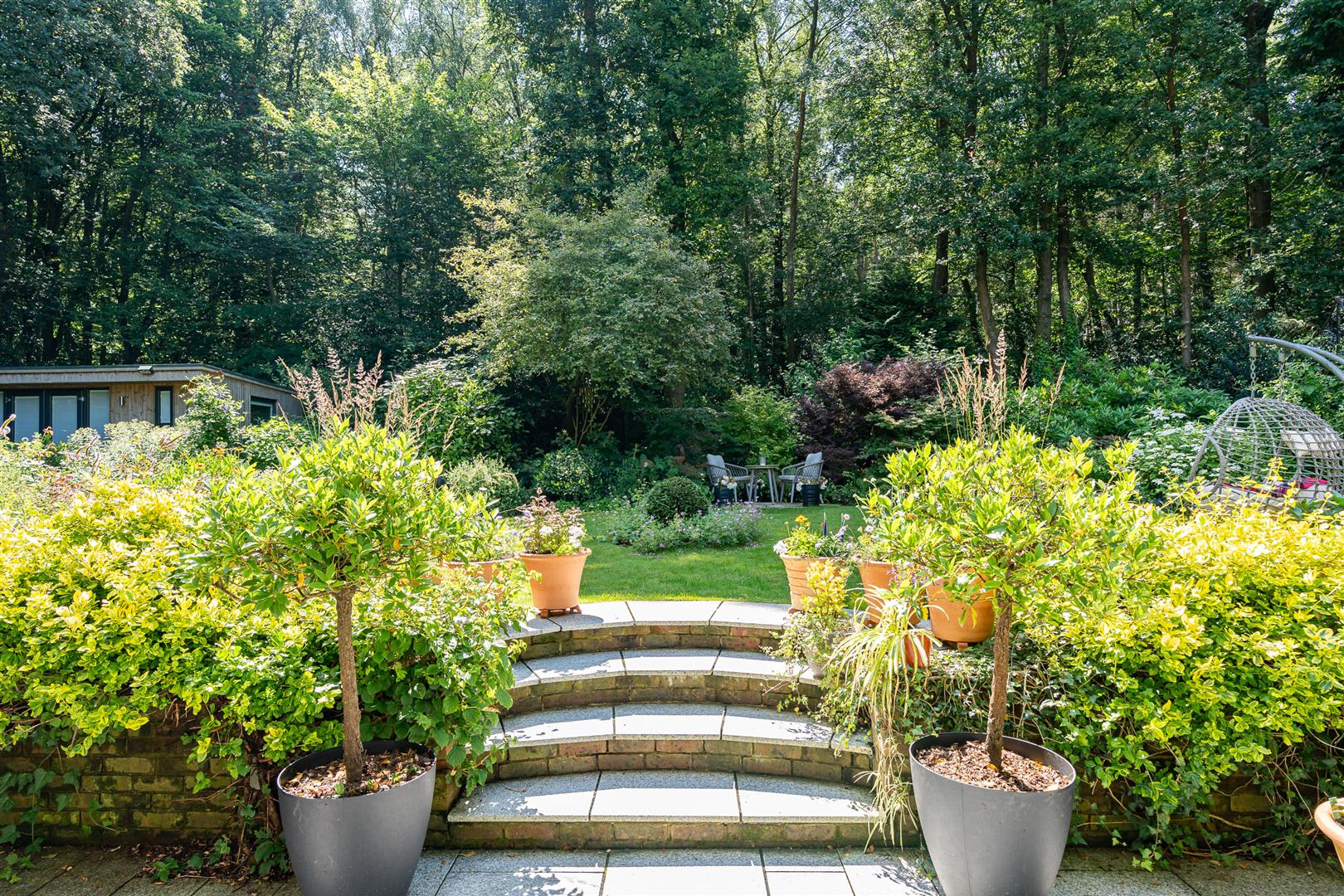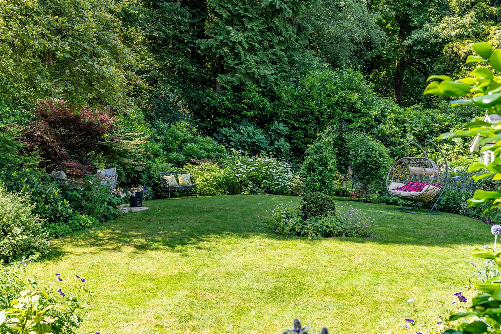 Secure, gated access opens onto an oasis of green, with the front of the house enjoying beautifully orchestrated planting of shrubs, bushes and specimen trees alongside the garage and driveway,and all around the property. The large block paved driveway opens out onto the frontage of the house providing plenty of guest parking over and above the garage and additional parking area adjoining it. To the side and rear, the house is surrounded by a carefully curated cottage garden on a grand scale. Deep borders sport an incredible variety of plants and flowers, with separate independent patios and lawns joined up by woodland walkways and arches to give a lovely feeling of being in different "rooms" within the garden, enhanced by an attractively shaped greenhouse and a stylish water feature. All off this is topped off by the beautiful natural woodland as a perfect backdrop. This really does feel like a modern luxurious house has been dropped into the middle of an enchanted forest.