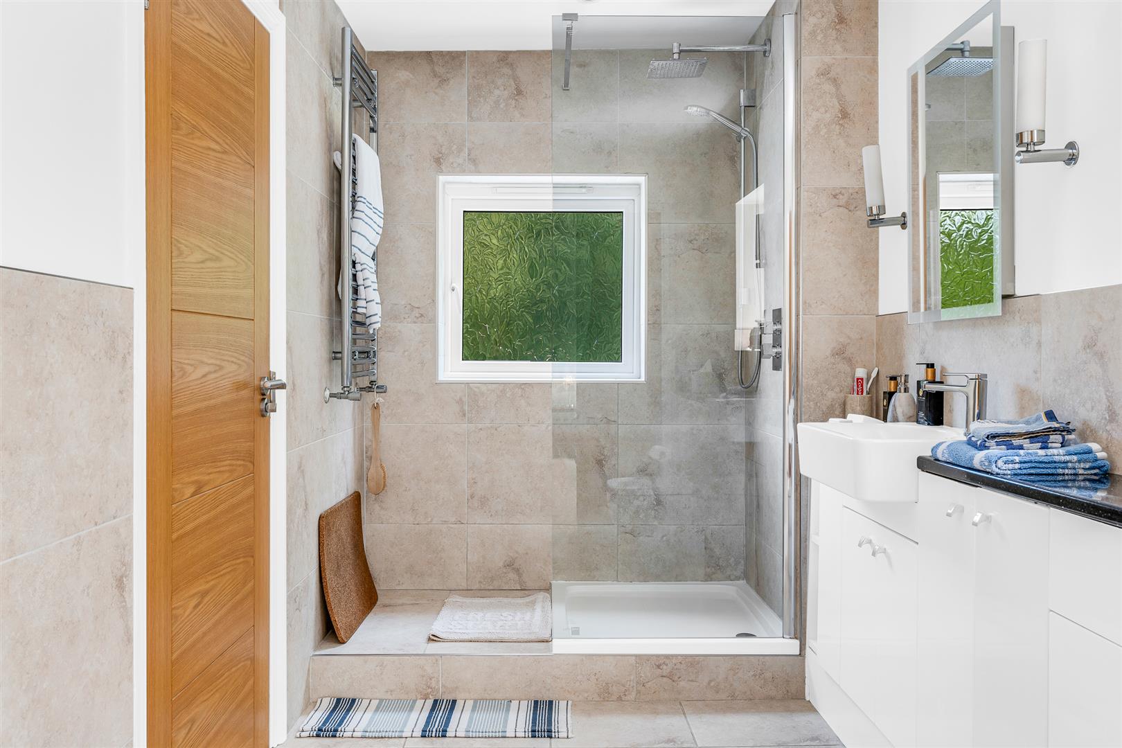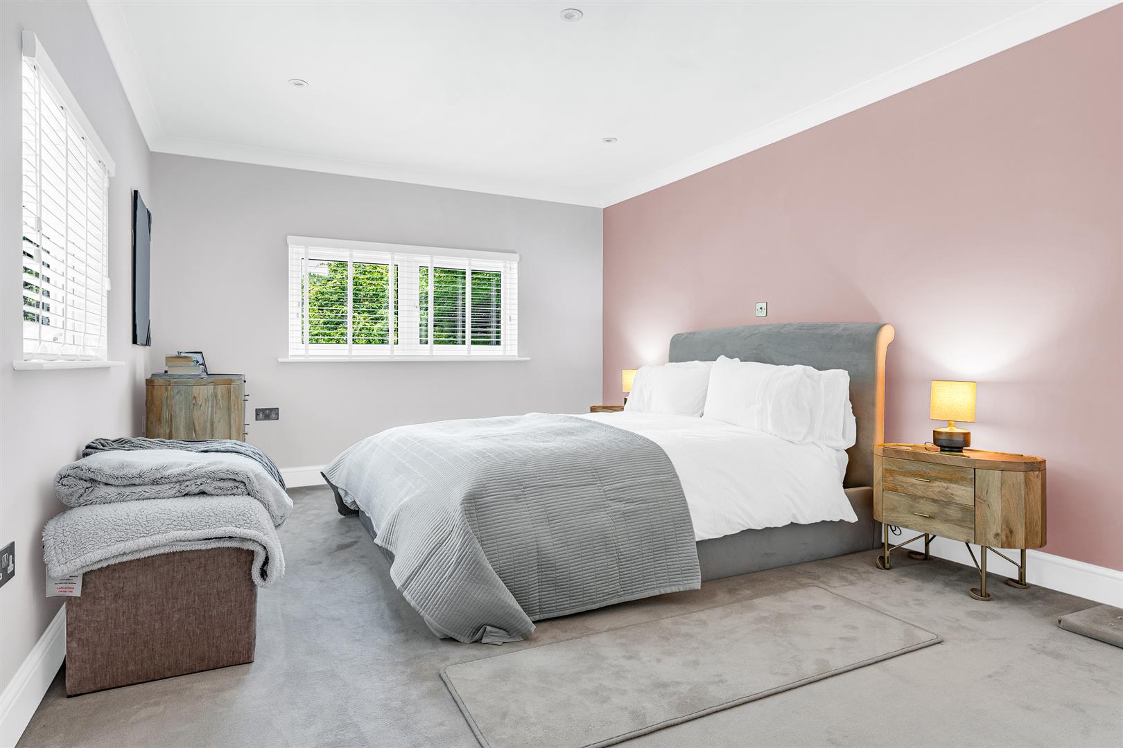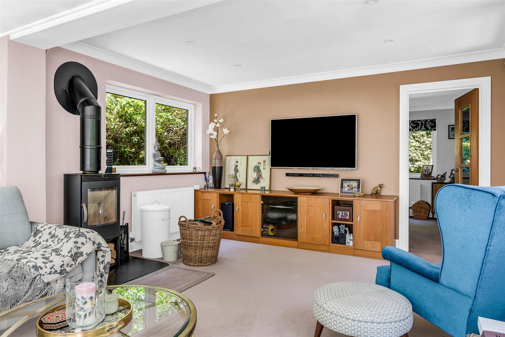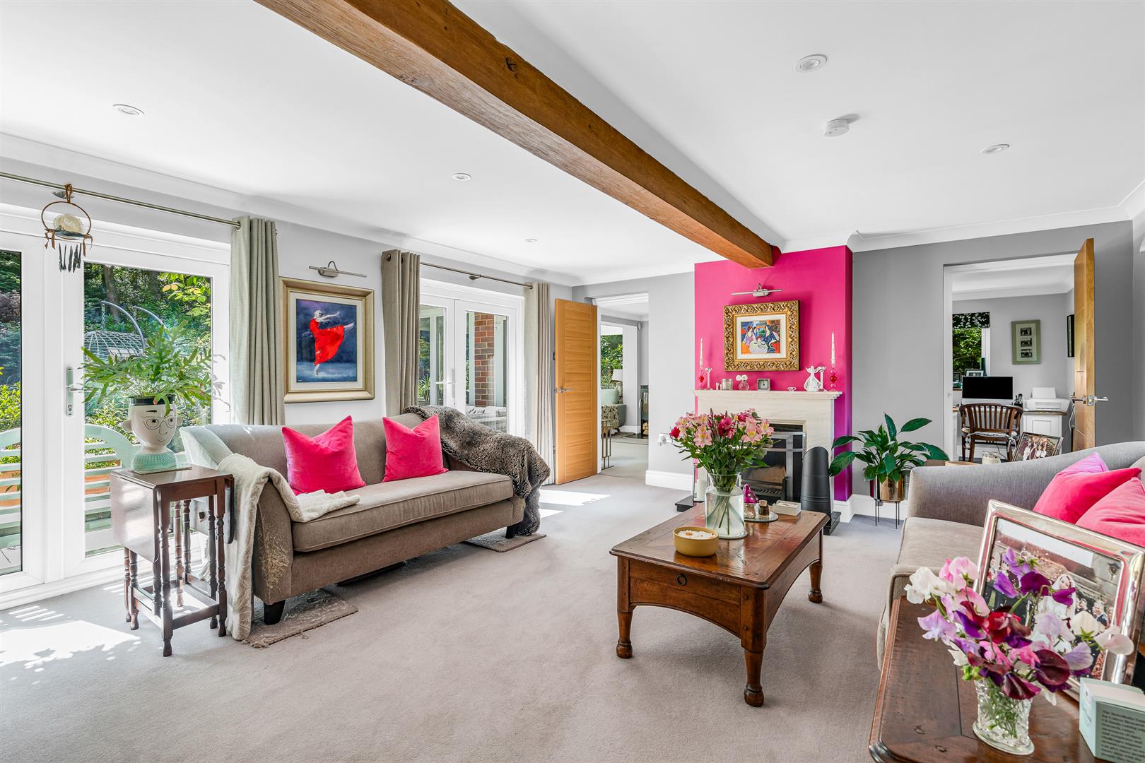 The living room is simply fabulous, flooded with natural light and glorious woodland views through the window to the front and the two sets of glazed double doors opening onto the rear garden. This room is a great size and shape, allowing real flexibility of layout and furnishings, and with an oak beam running the full length, along with the attractive fire place, it performs really well as both a family hang out space as well as a great room for entertaining.