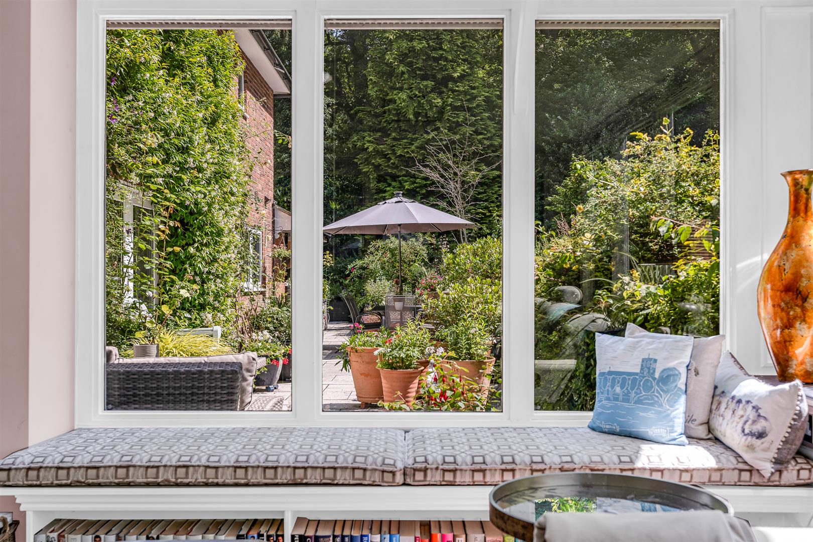 This property really excels at linking the house to the gardens and the stunning garden room epitomises that seamless transition. Perfectly configured with a side window and a log burner, the lounge/study area migrate into the sharp clean lines of the three quarter glazed garden area, complete with large window sills for houseplants and objets d'art and topped off with super banquette seating along one side. A quite delightful room for all seasons.